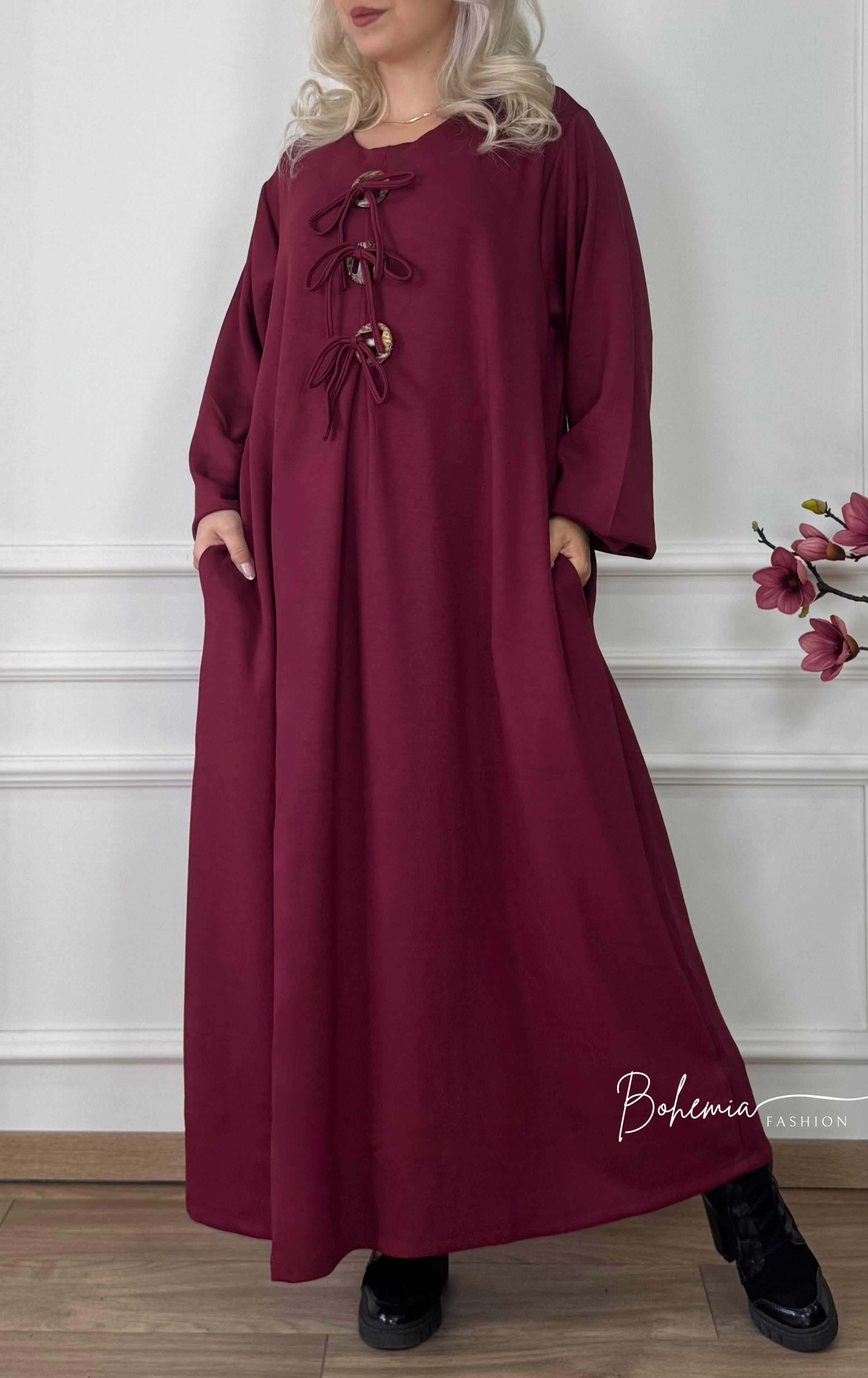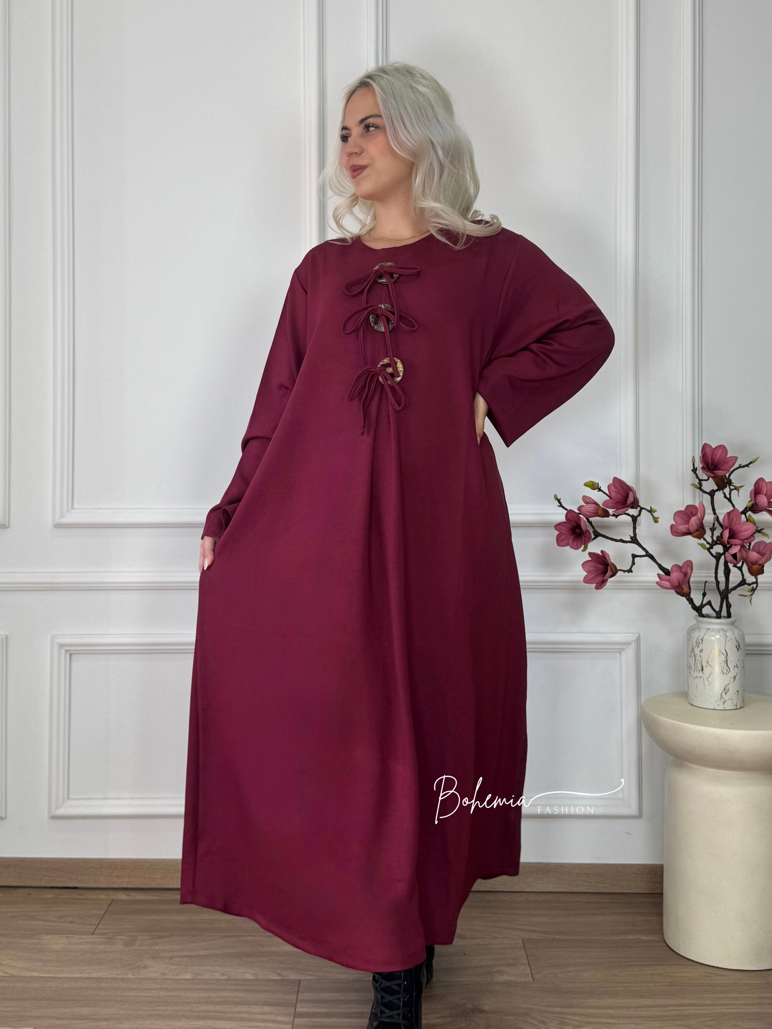 Ez a hosszú ujjú viszkóz ruha a letisztult stílust és a kényelmet egyesíti. Elöl három fagomb teszi különlegessé, puha, súlyosabb esésű anyaga pedig elegáns mozgást kölcsönöz viselőjének. Két oldalsó zsebe még praktikusabbá teszi ezt a darabot.