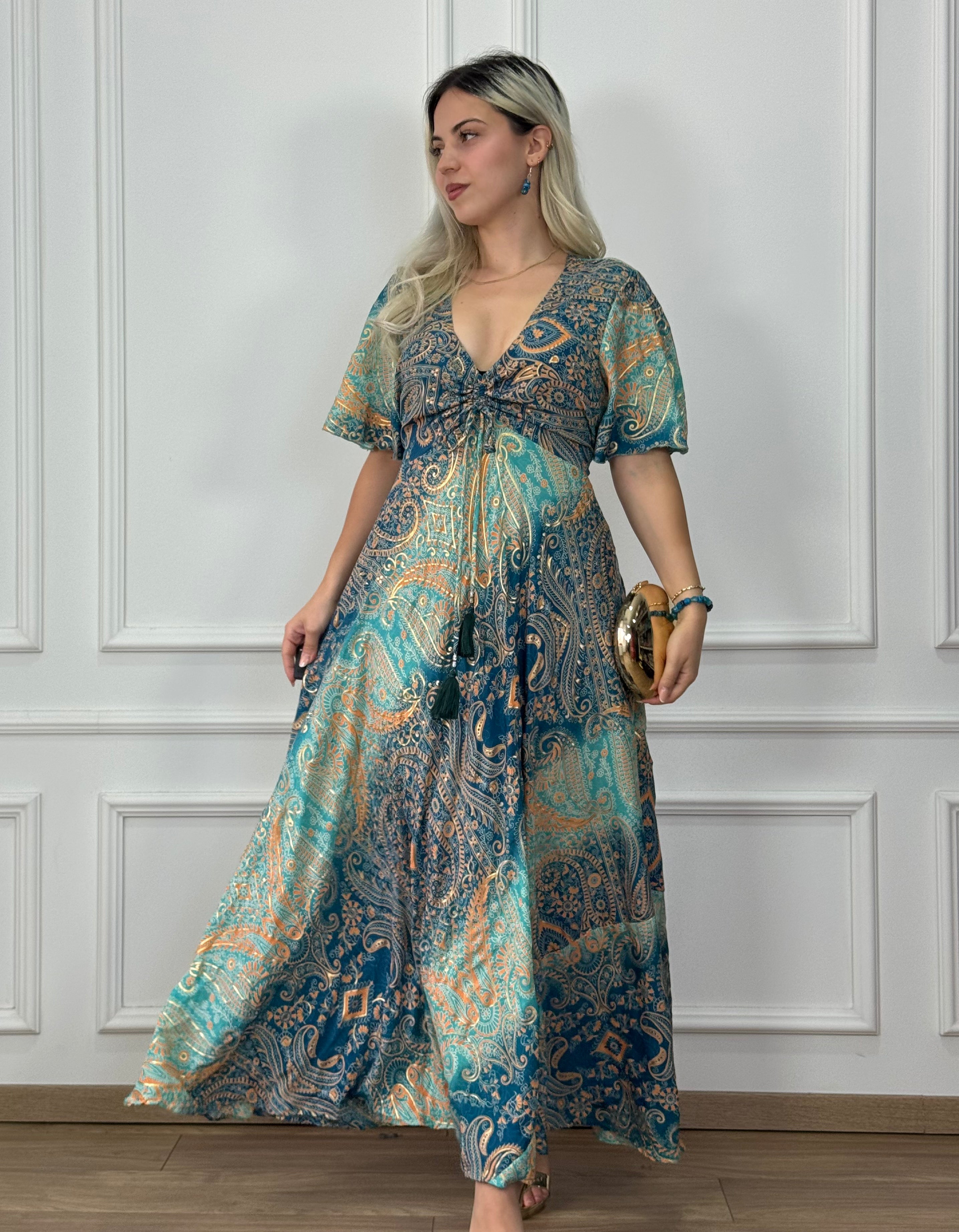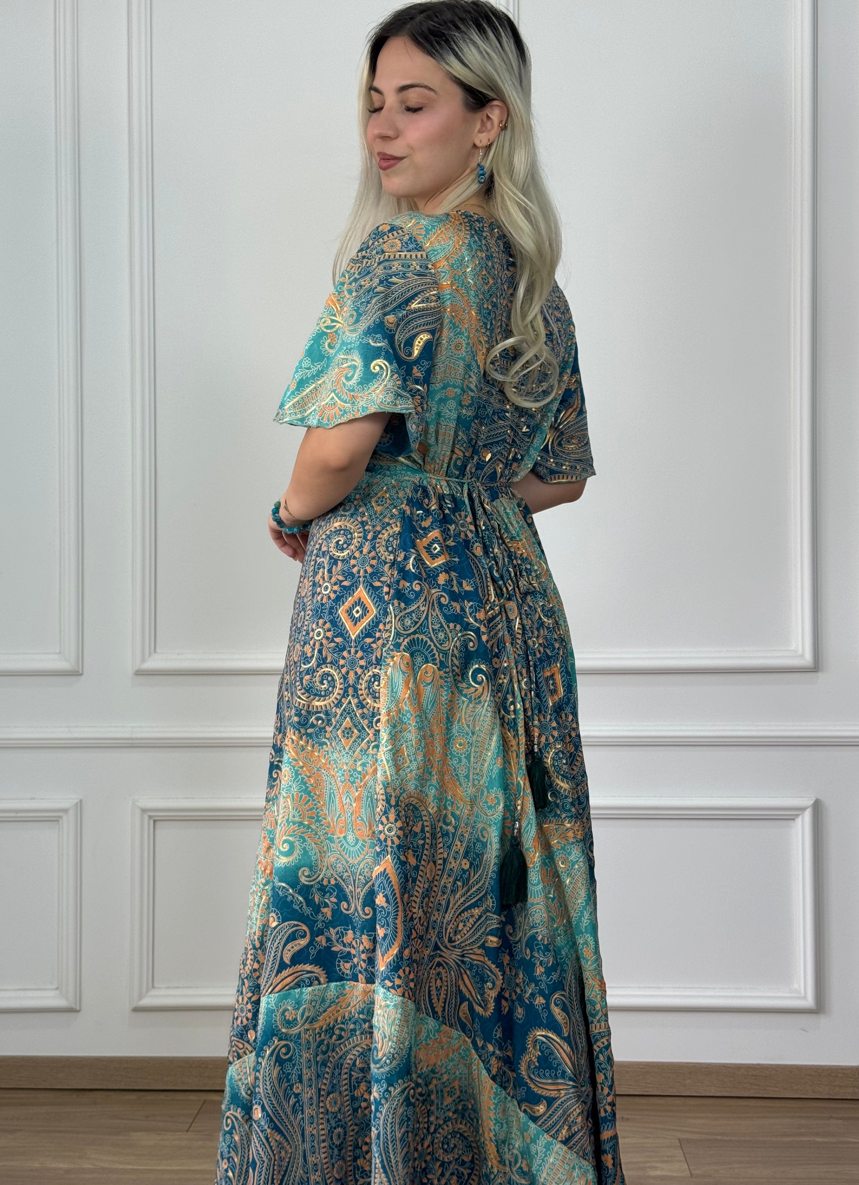Elegáns, selyemhatású maxi ruha. Az összehúzható mellkasi rész, a szívalakú nyakkivágás és a rövid, bő szabású ujjak romantikus megjelenést kölcsönöznek. A kétoldalt elhelyezett megkötők segítségével a derékrész alakra igazítható, hátul pedig gumis, így kényelmesen illeszkedik. A ruha oldalán található zsebek praktikus kiegészítést nyújtanak.