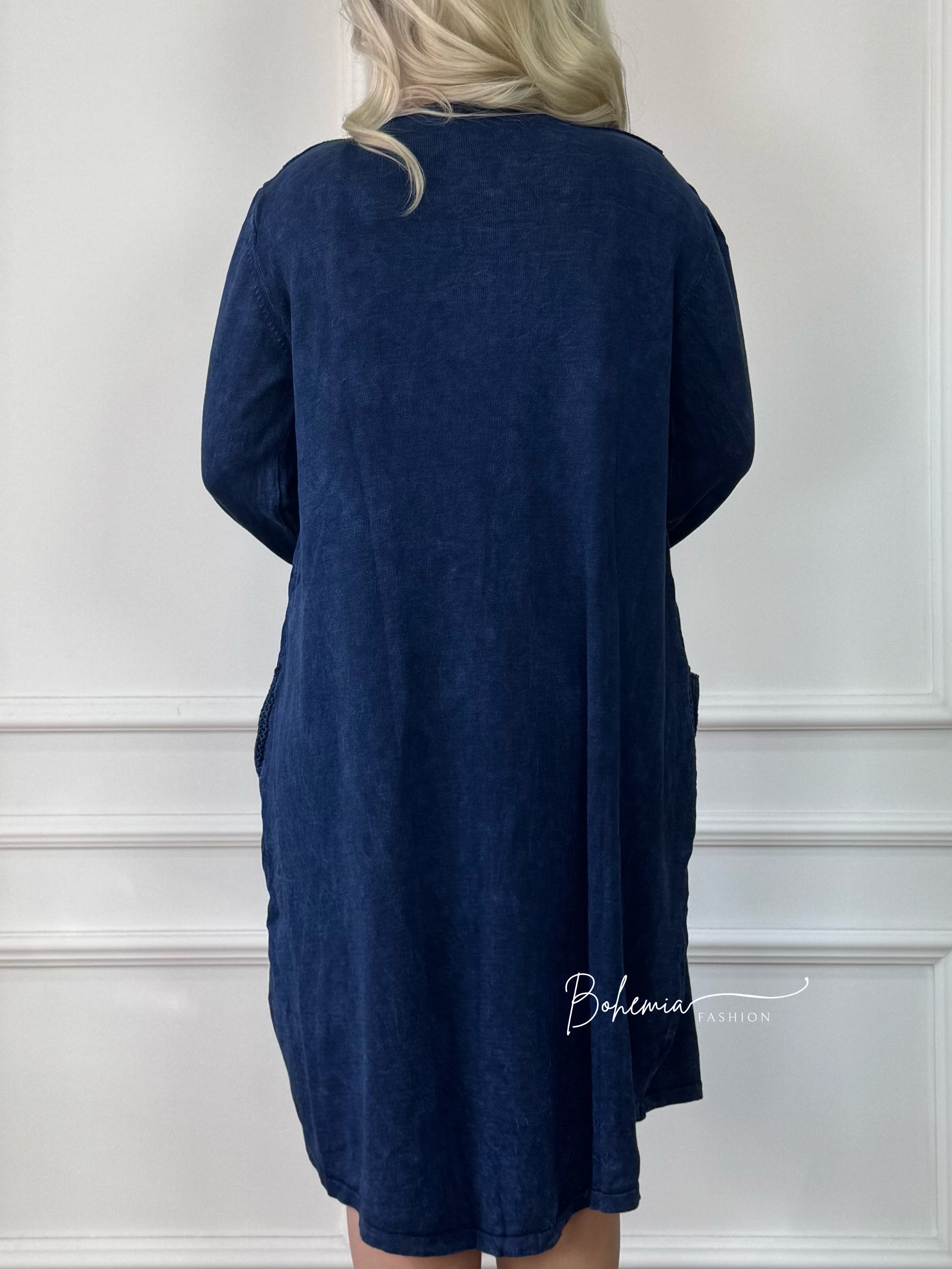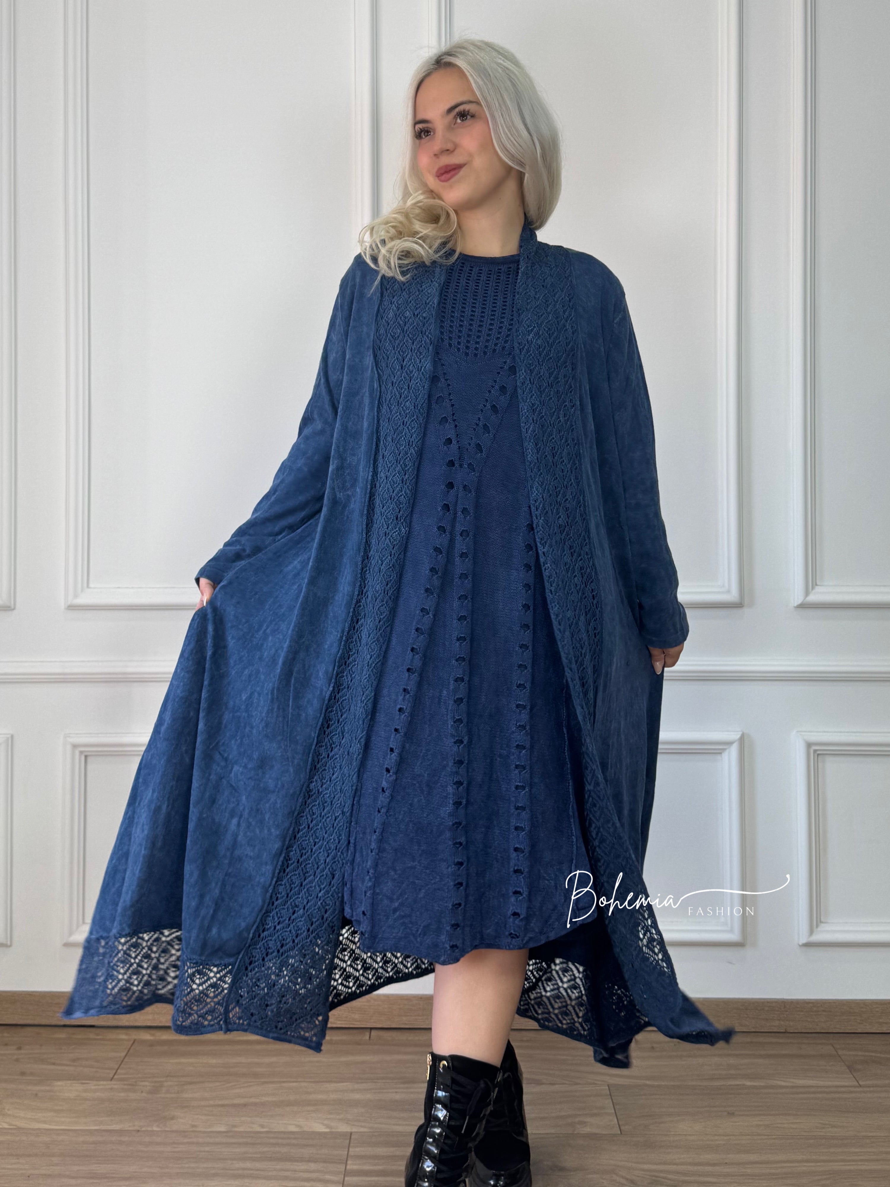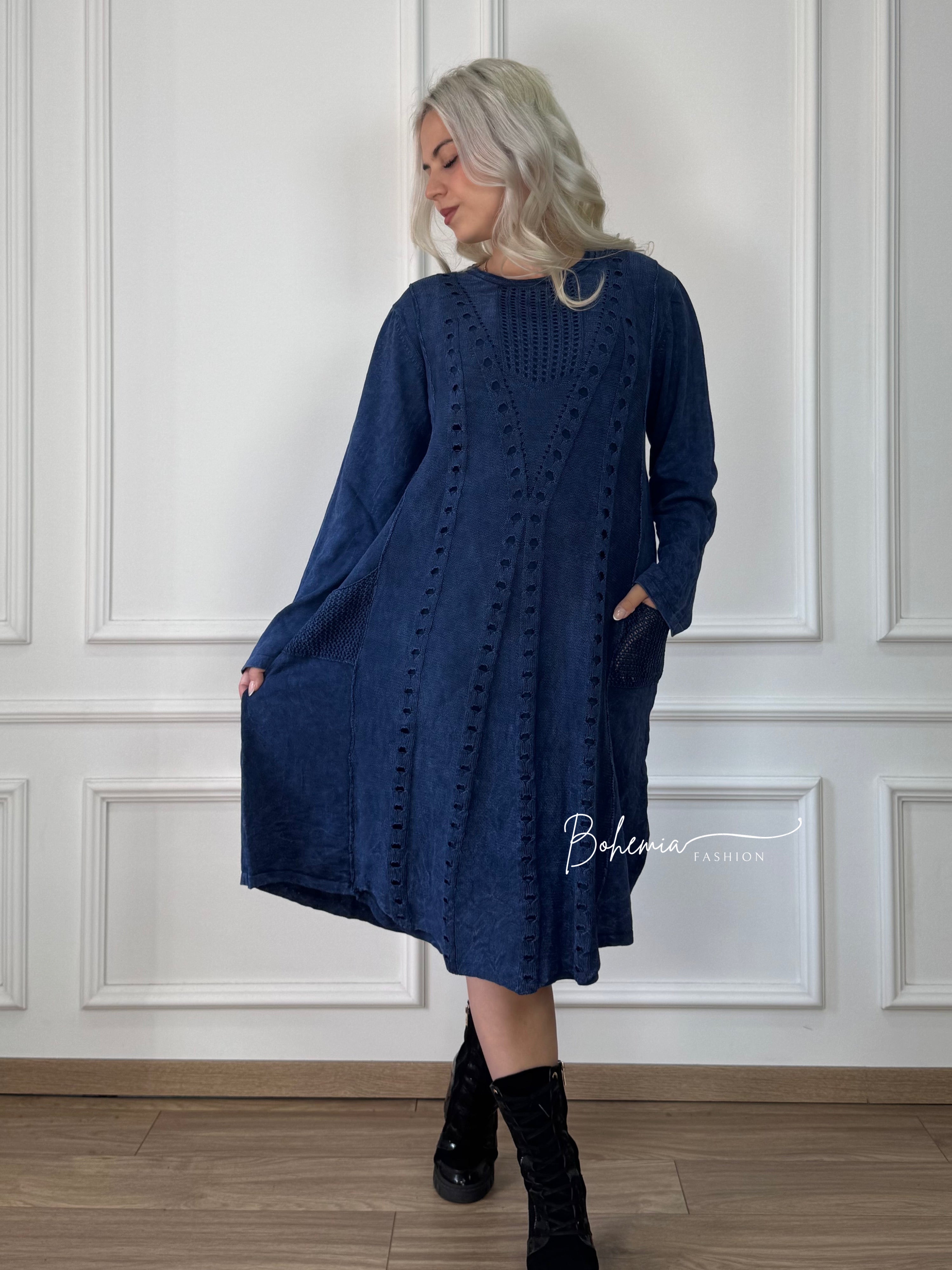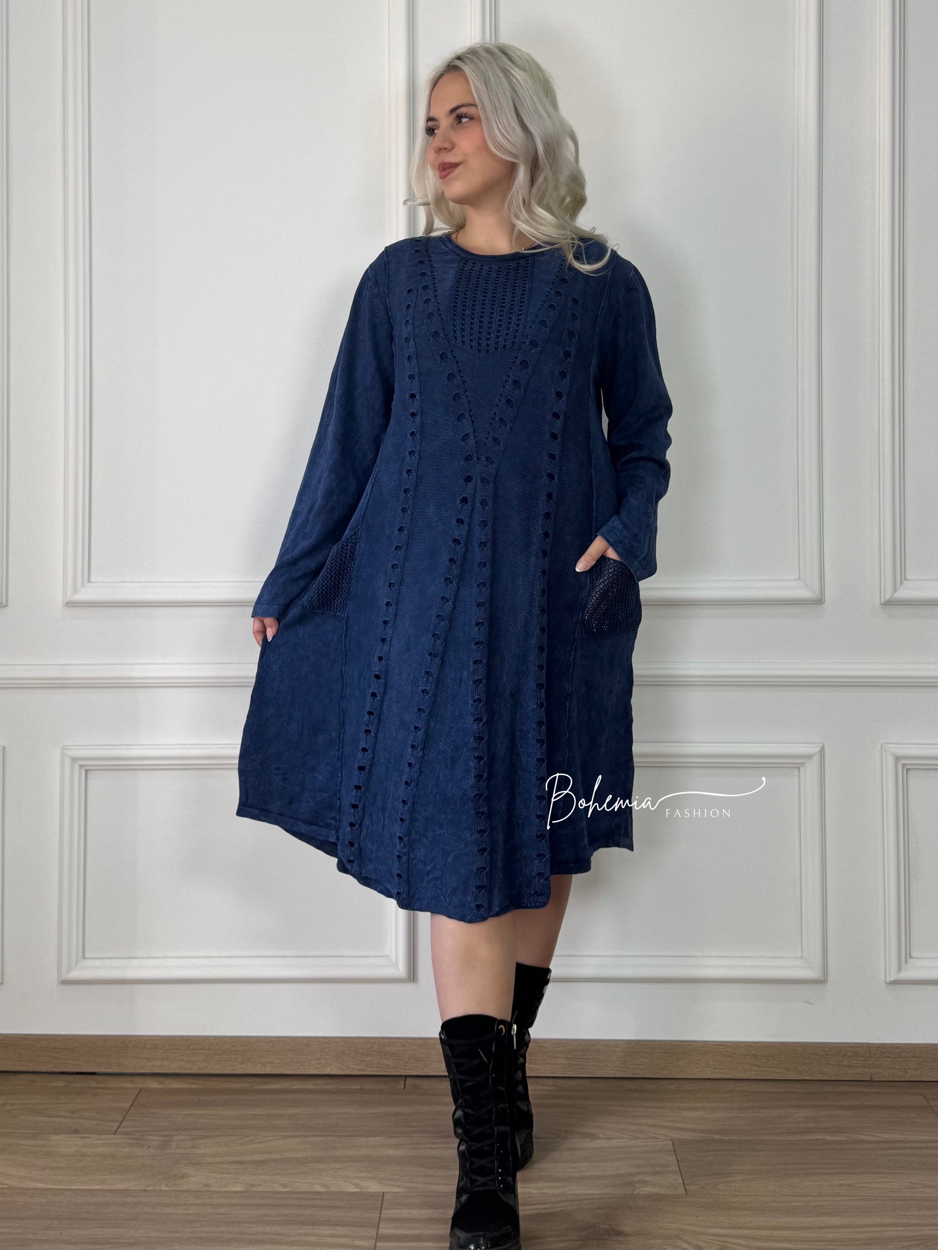 Puha anyagú, kőmosott kötött ruha, amely laza szabásával, zsebeivel és aprólékos részleteivel egyszerre kényelmes és látványos. Ideális választás hűvösebb napokra, amikor fontos a kényelem és a stílus.