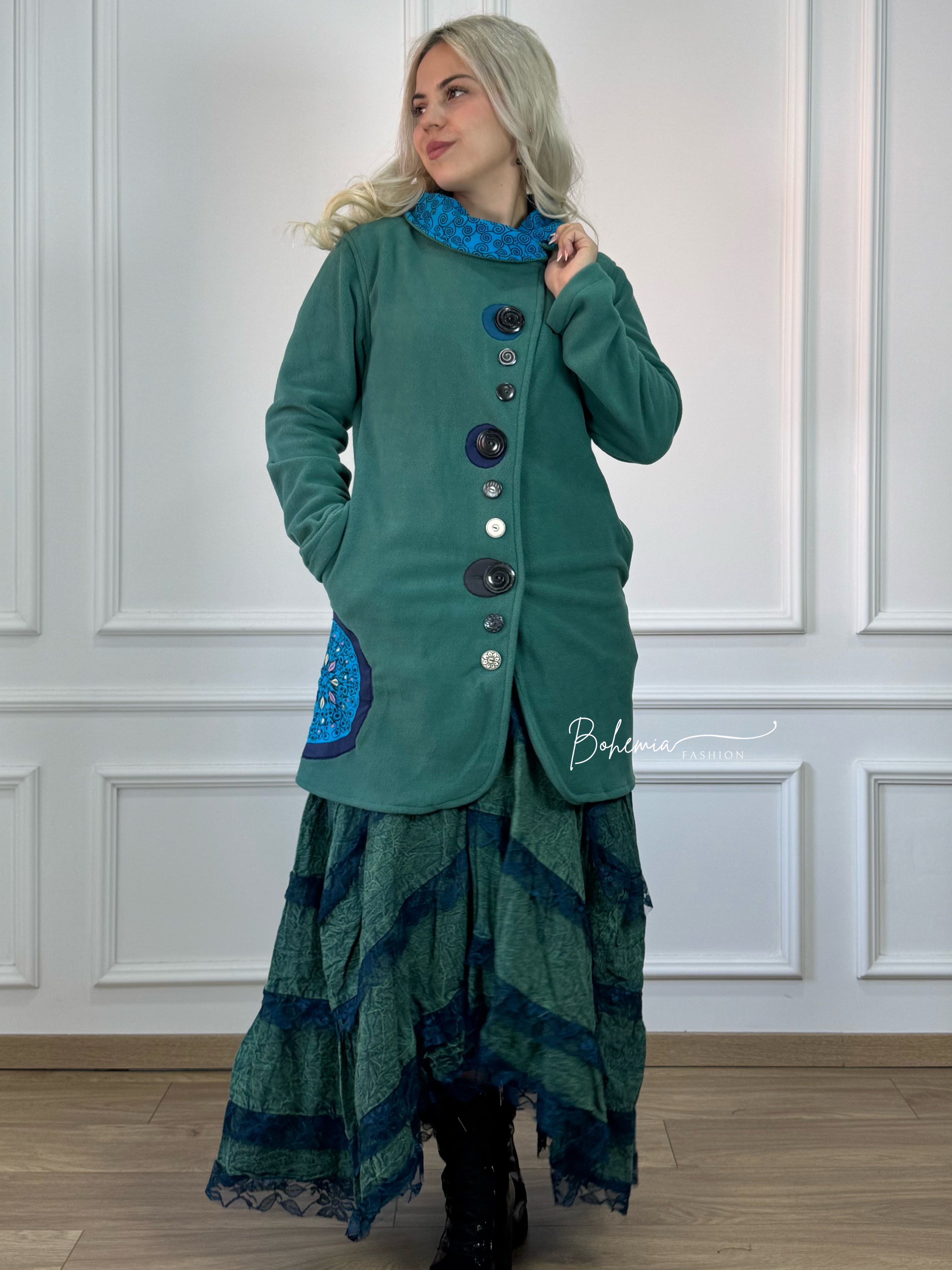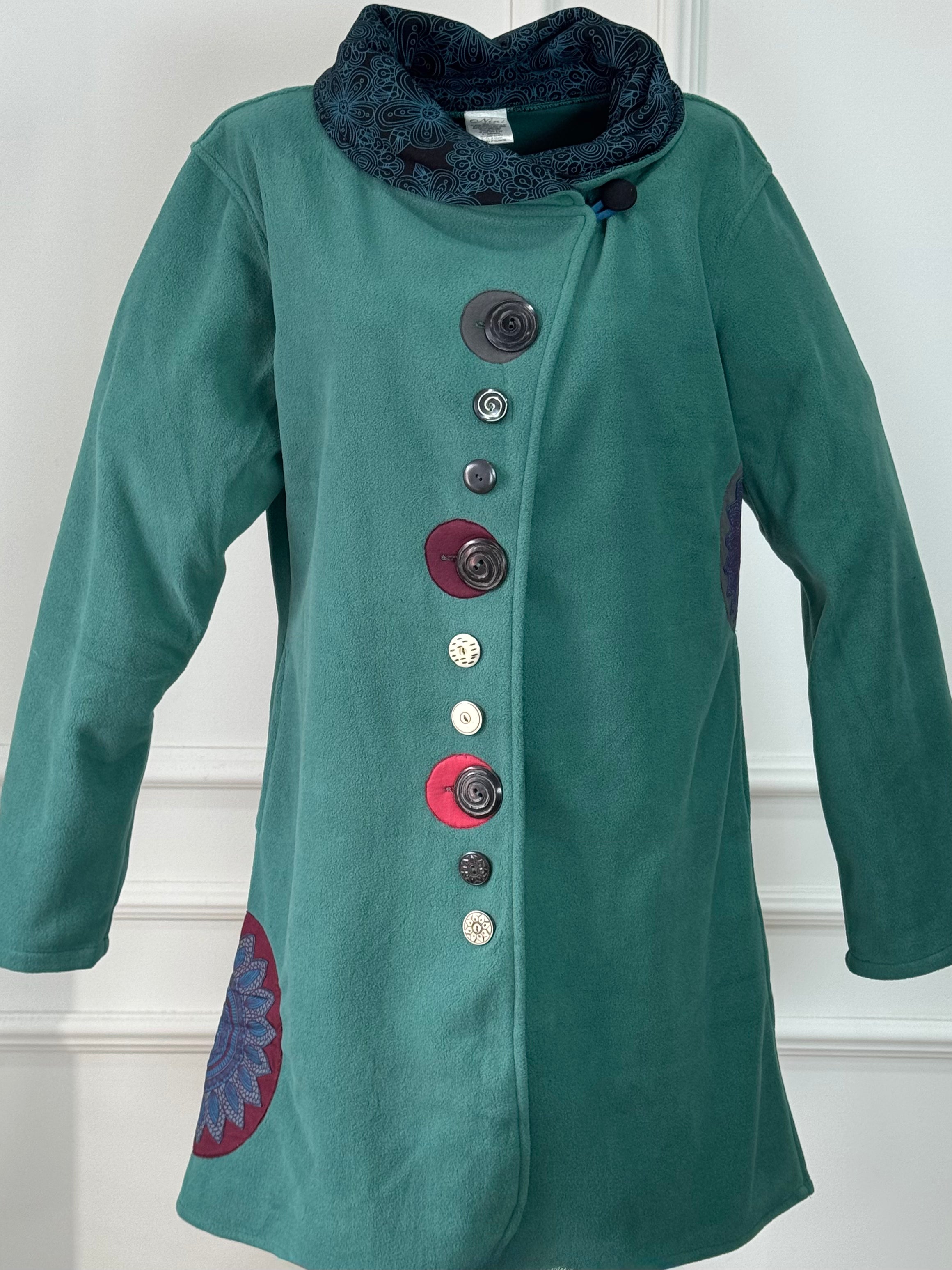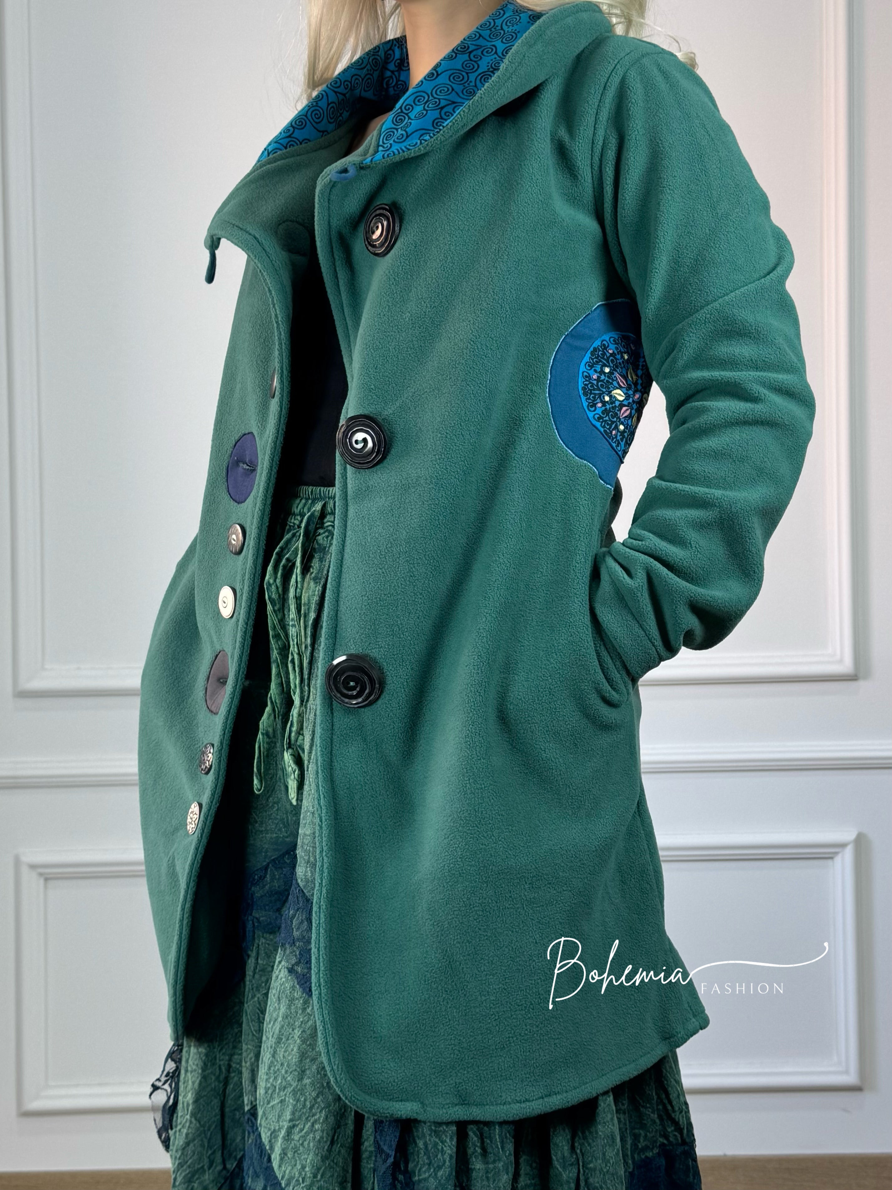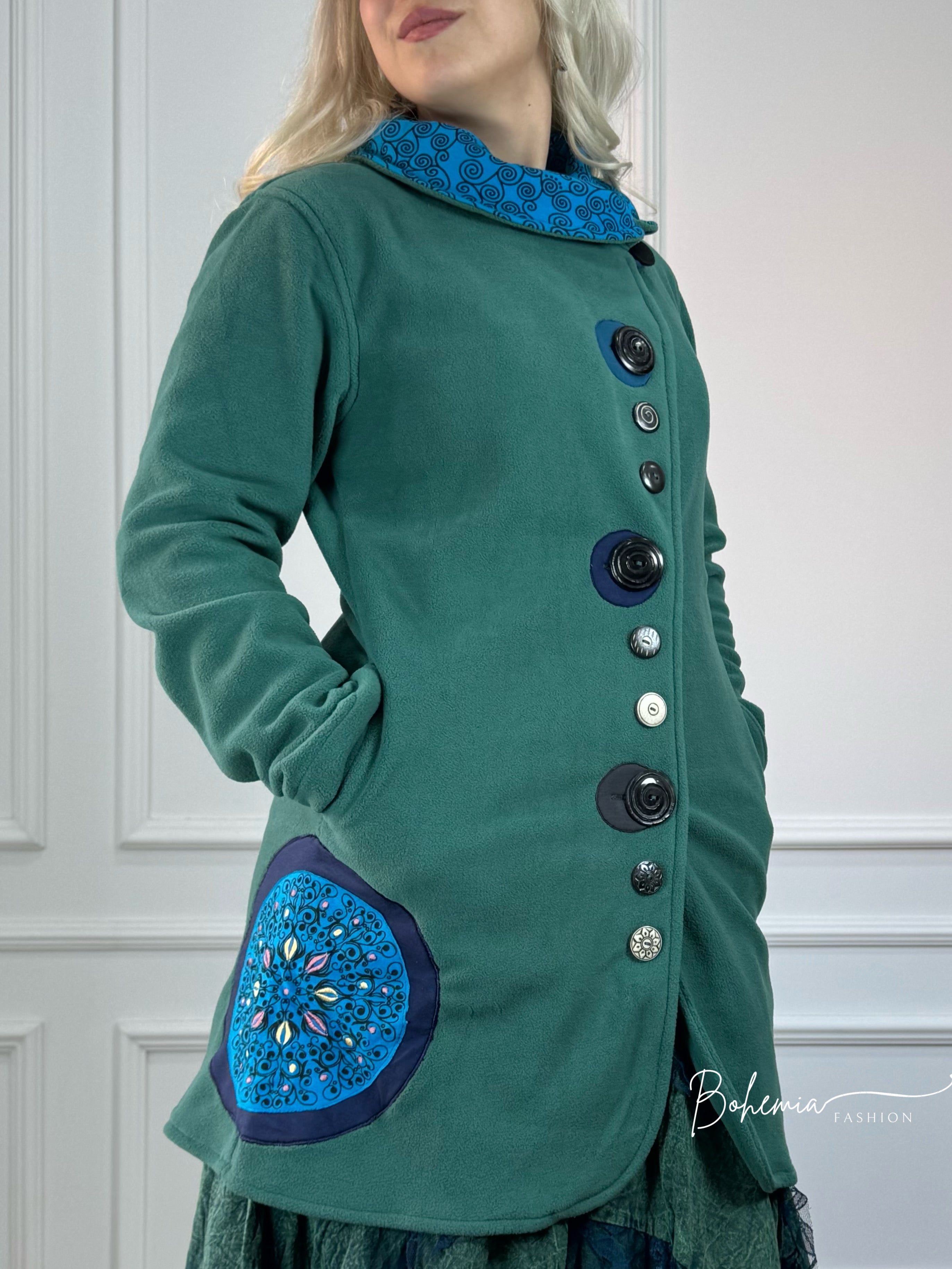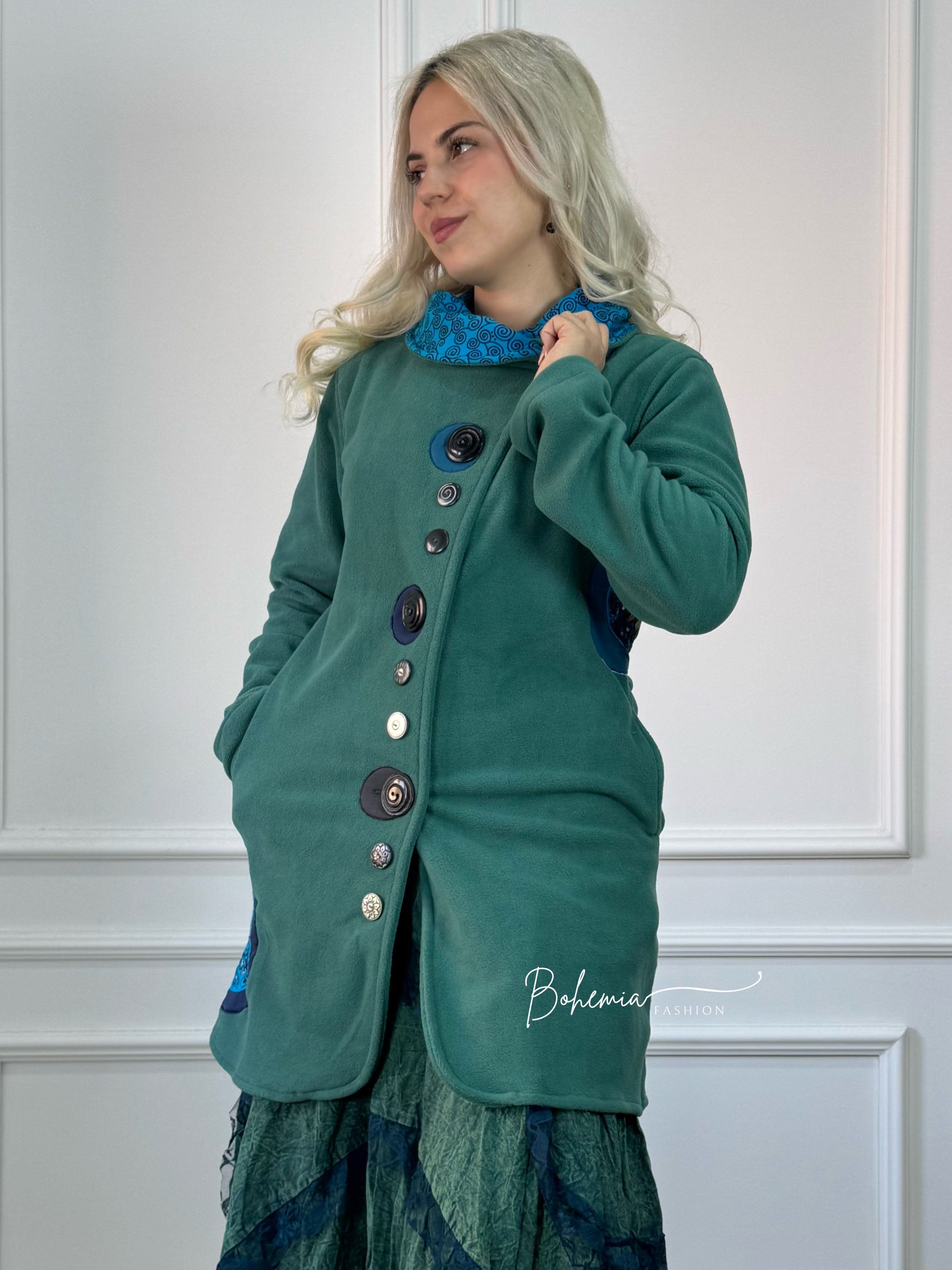 Puha polár anyagból készült kabát, amelyet egyedi, aszimmetrikus gombolás, különböző stílusú gombok és kontrasztos belső gallér díszít. Enyhén karcsúsított fazon, két oldalsó zsebbel.