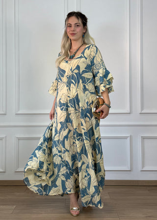 Porcelánfehér alapon kék magnóliák rajzolódnak ki finom kontraszttal. Elegáns, letisztult viselet.