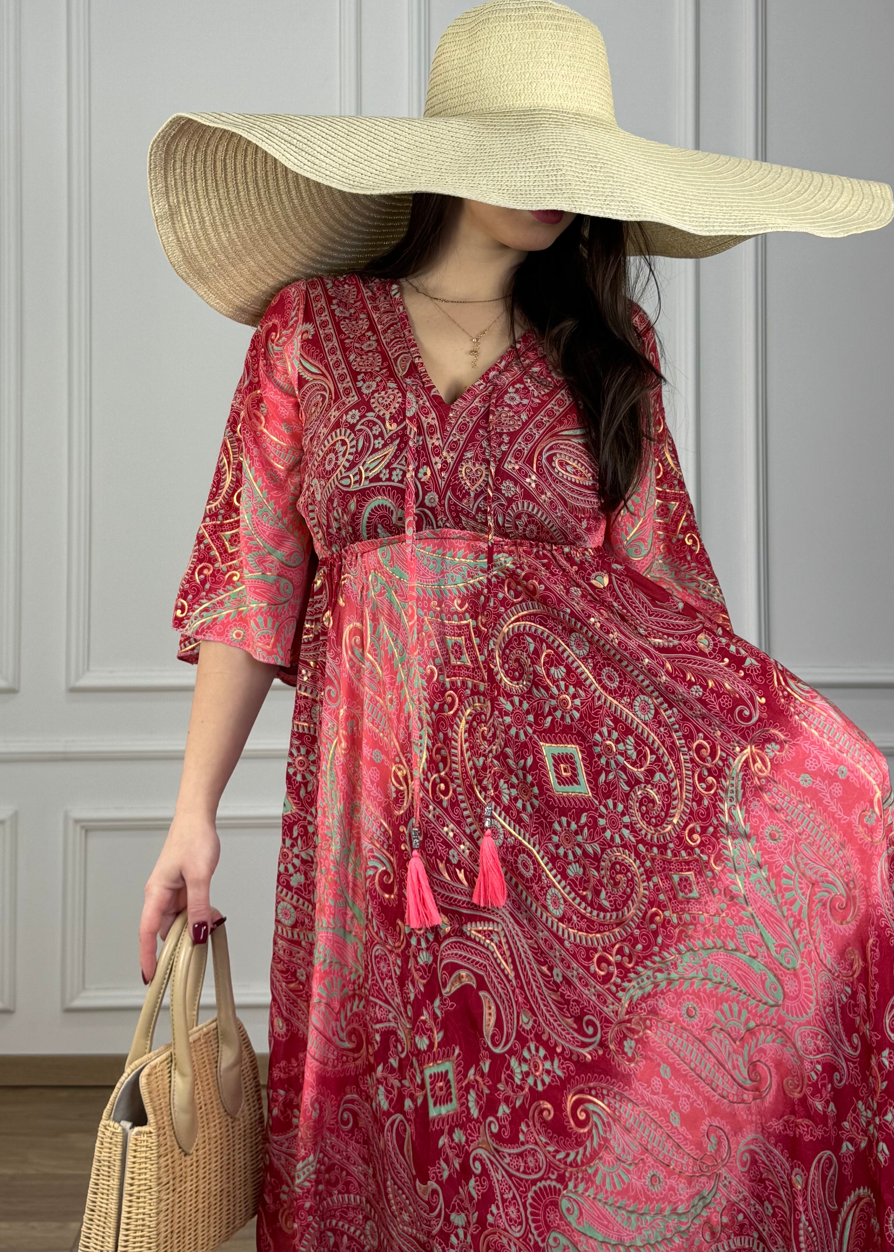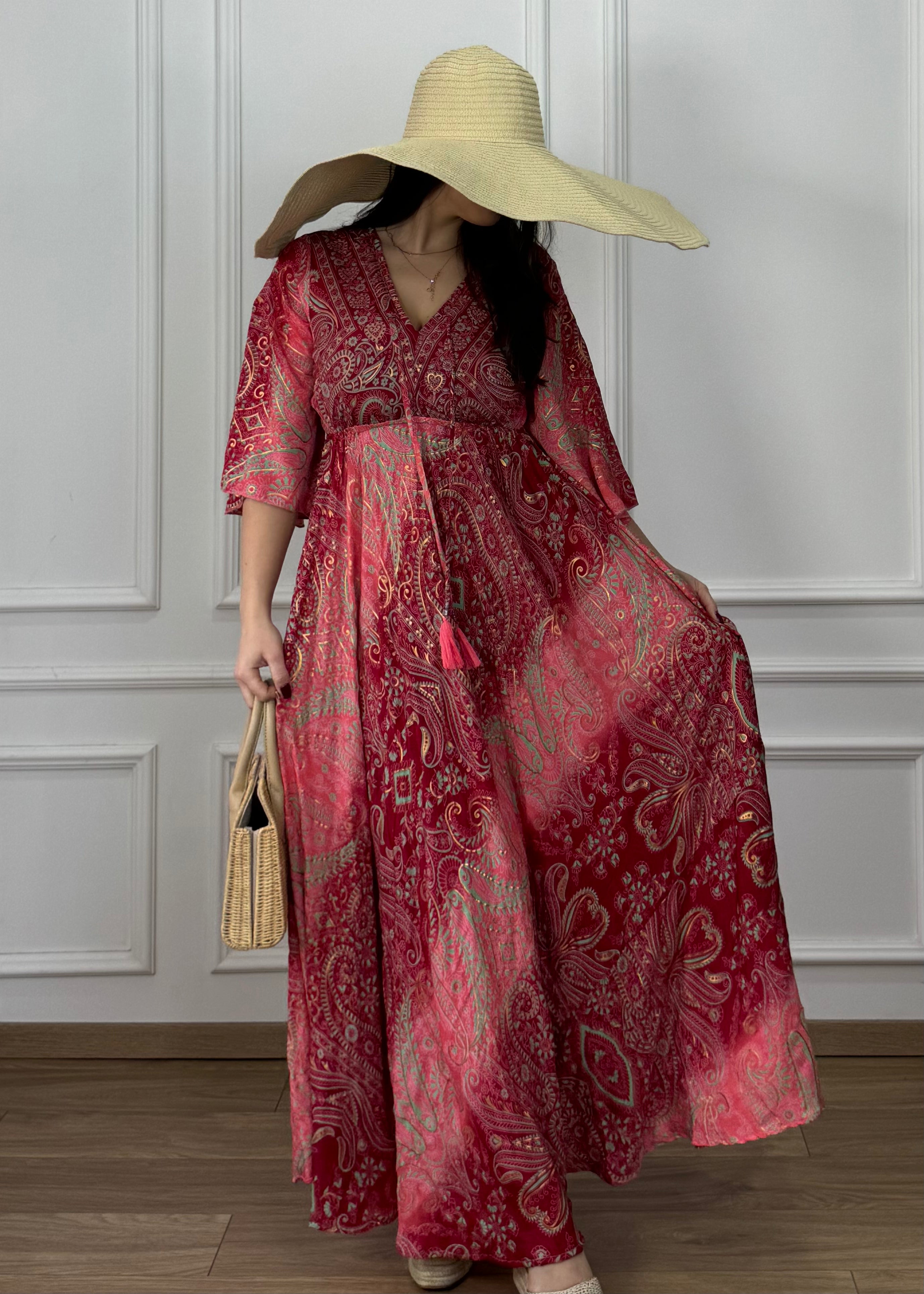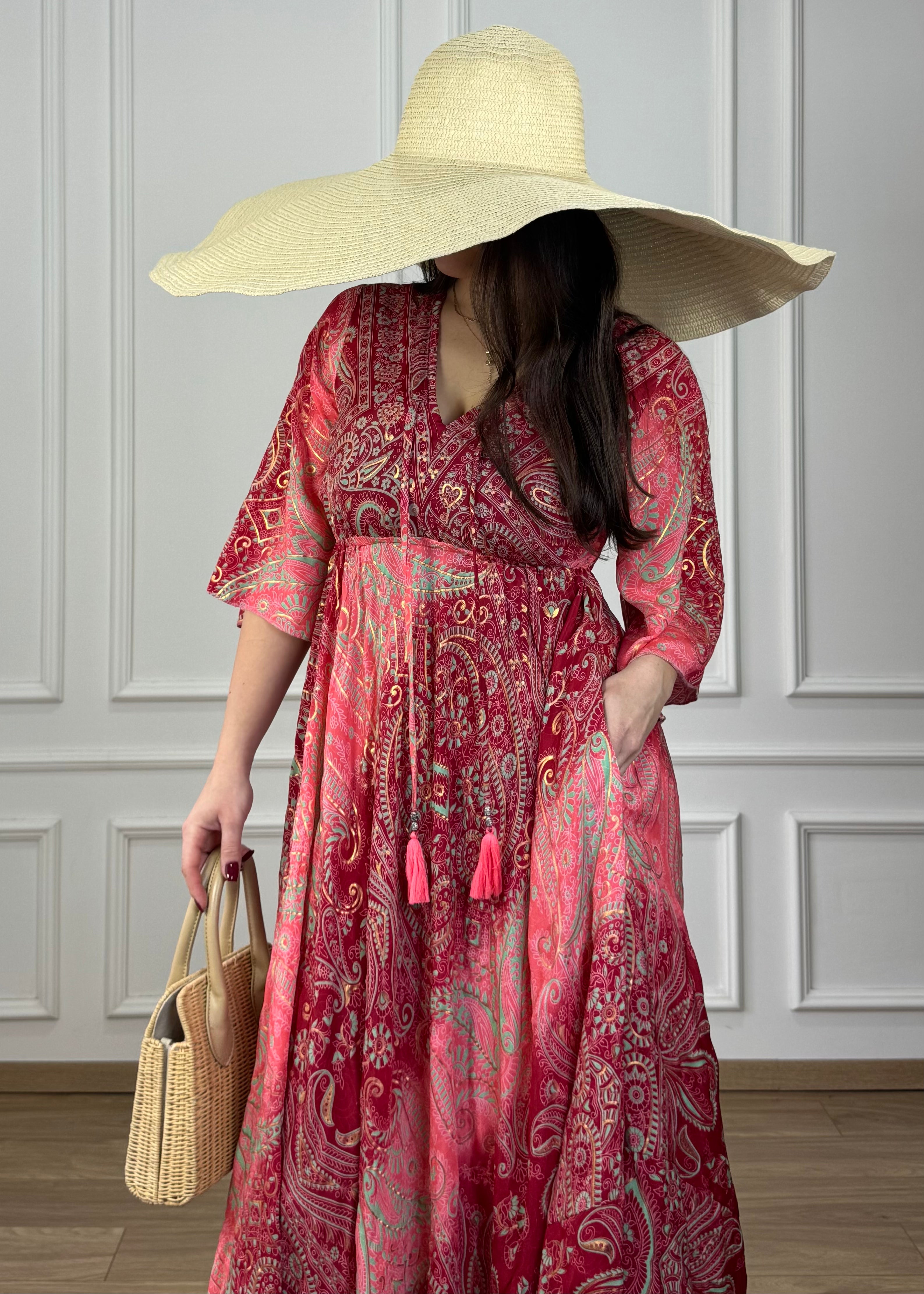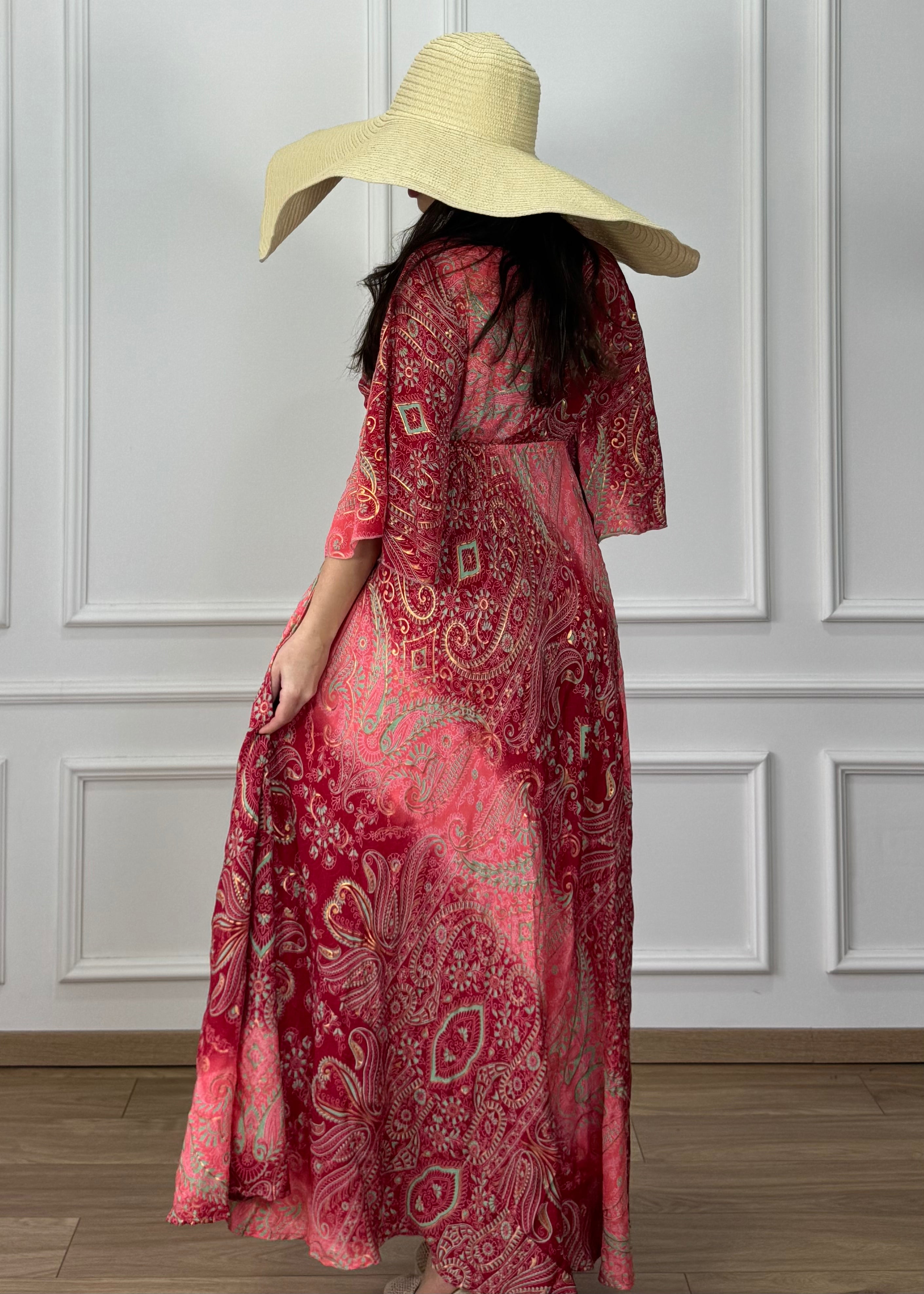 Hosszú, selyemhatású ruha, 3/4-es ujjakkal, derékban gumis, lefelé bővülő szoknyarész, oldalt zsebekkel.