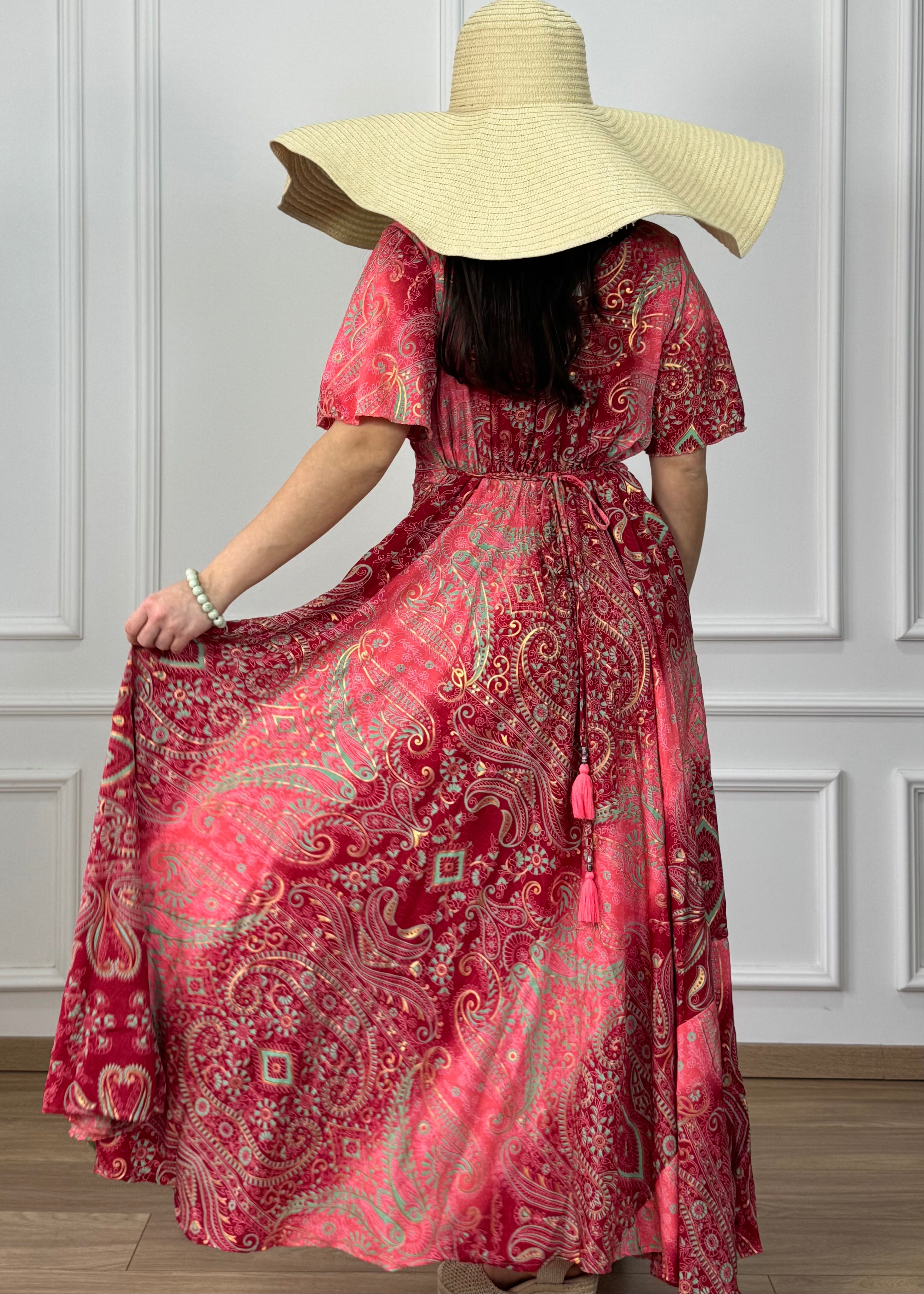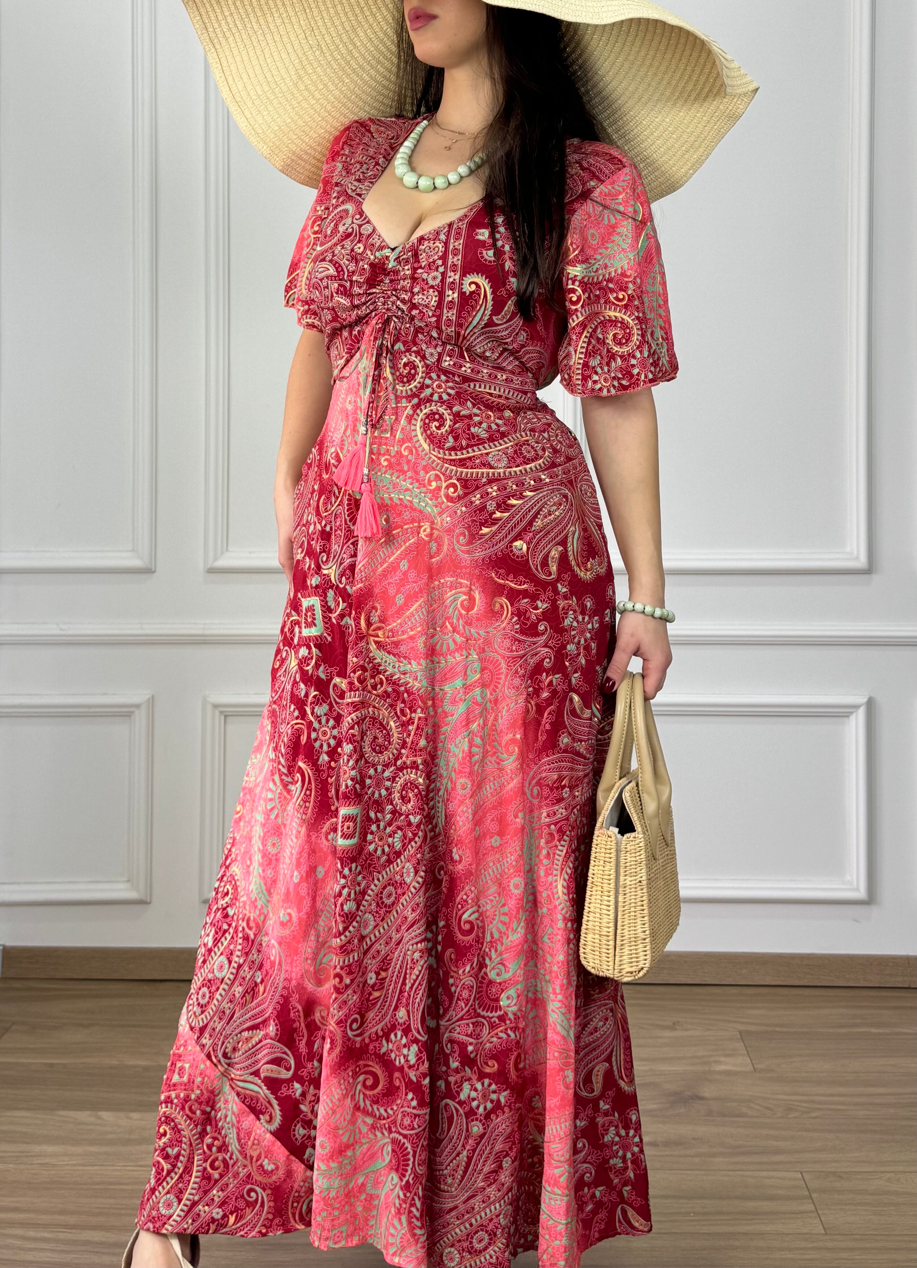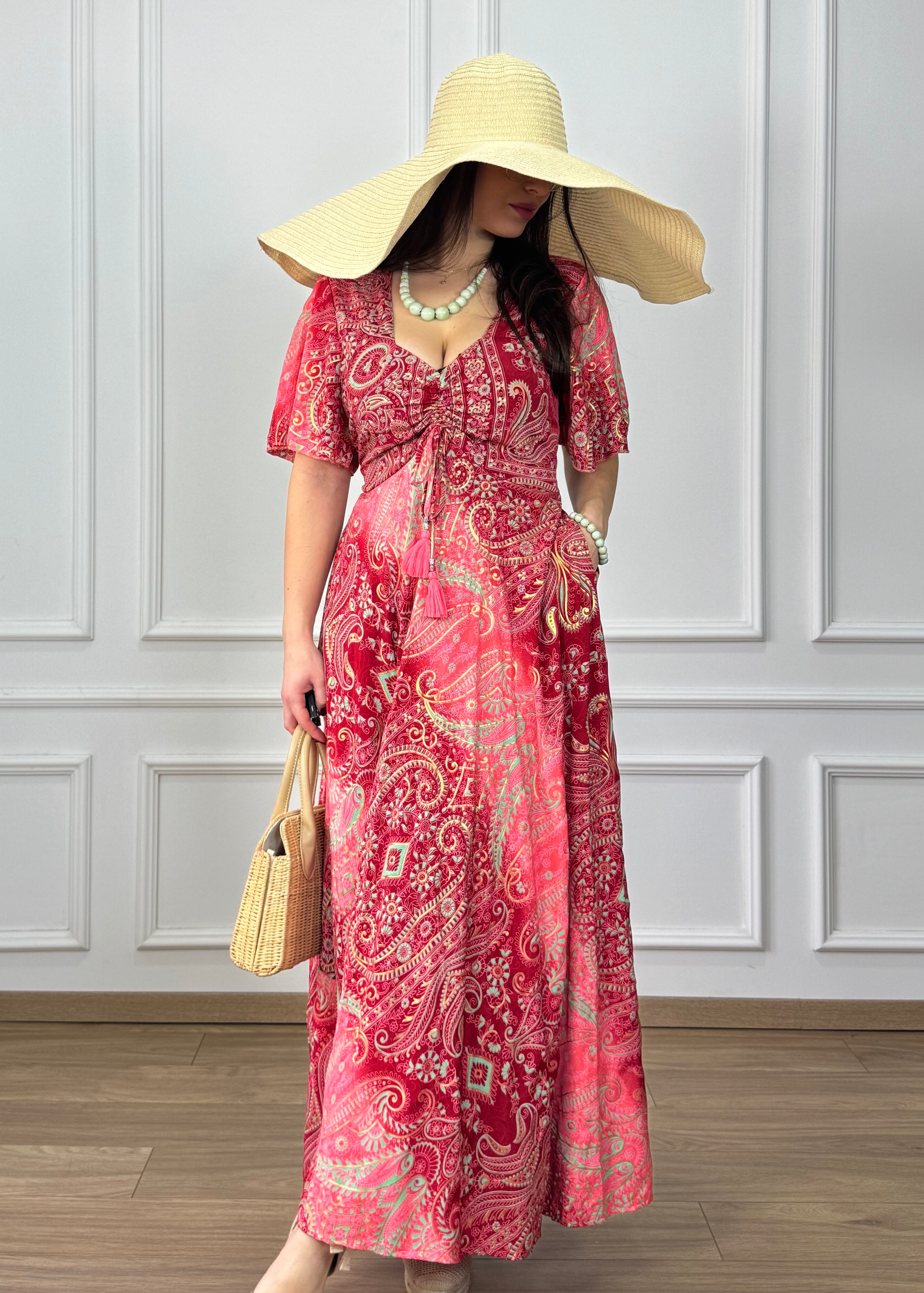 Elegáns, selyemhatású maxi ruha. Az összehúzható mellkasi rész, a szívalakú nyakkivágás és a rövid, bő szabású ujjak romantikus megjelenést kölcsönöznek. A kétoldalt elhelyezett megkötők segítségével a derékrész alakra igazítható, hátul pedig gumis, így kényelmesen illeszkedik. A ruha oldalán található zsebek praktikus kiegészítést nyújtanak.