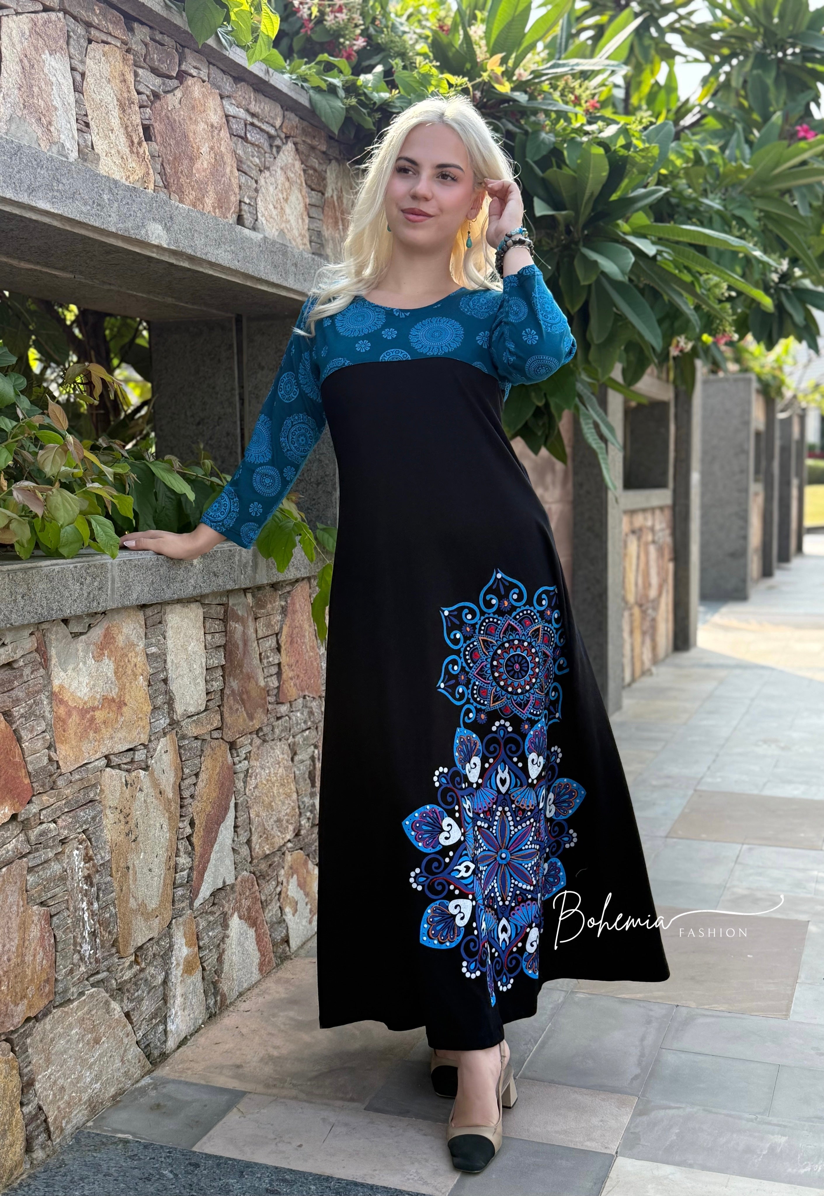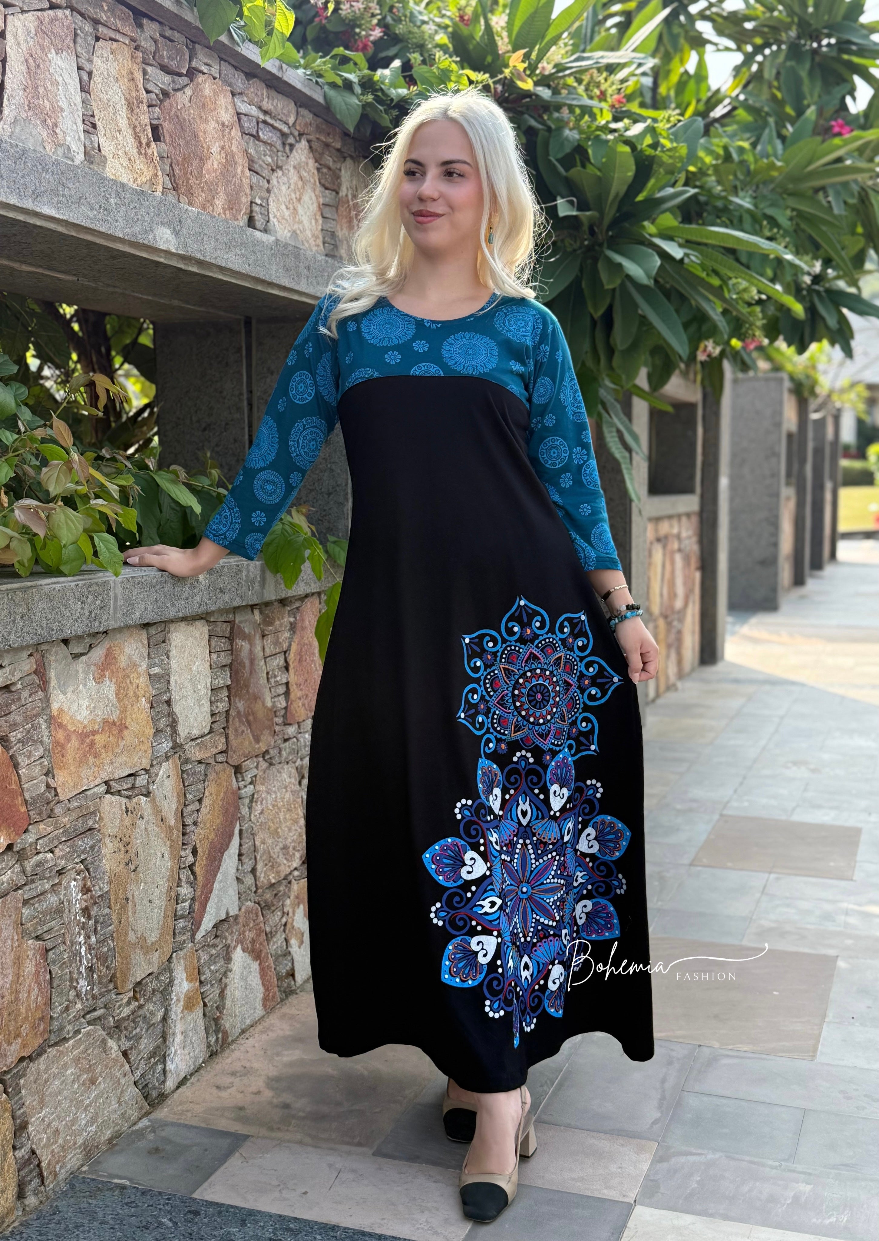 Ez a hosszú, 3/4-es ujjú pamut ruha kényelmes és különleges darab. A felsőrész egyszínű mintás betéttel indul, míg a szoknyát egy nagyméretű mandala teszi látványossá. Az elöl található hímzés apró részletei kiemelik ezt mintát, így a ruhát még karakteresebbé teszi.