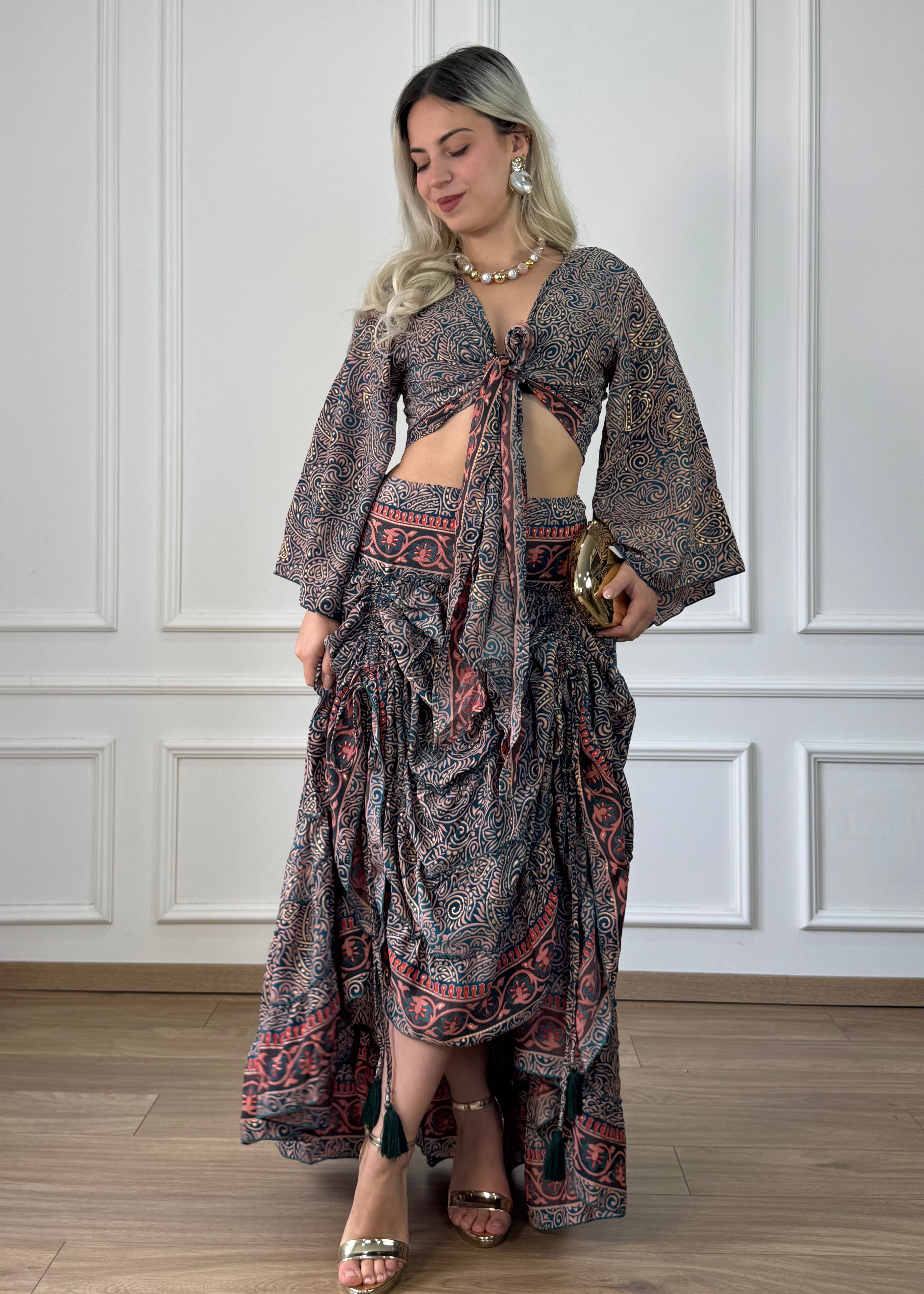Hosszú, bő szabású maxi szoknya, elöl két ponton zsinórral szabályozható kialakítással, hátul gumírozott derékrésszel. A felhúzható kialakítás változatos sziluettet ad a fazonnak, az egyik vagy akár mindkét oldalon megemelve.