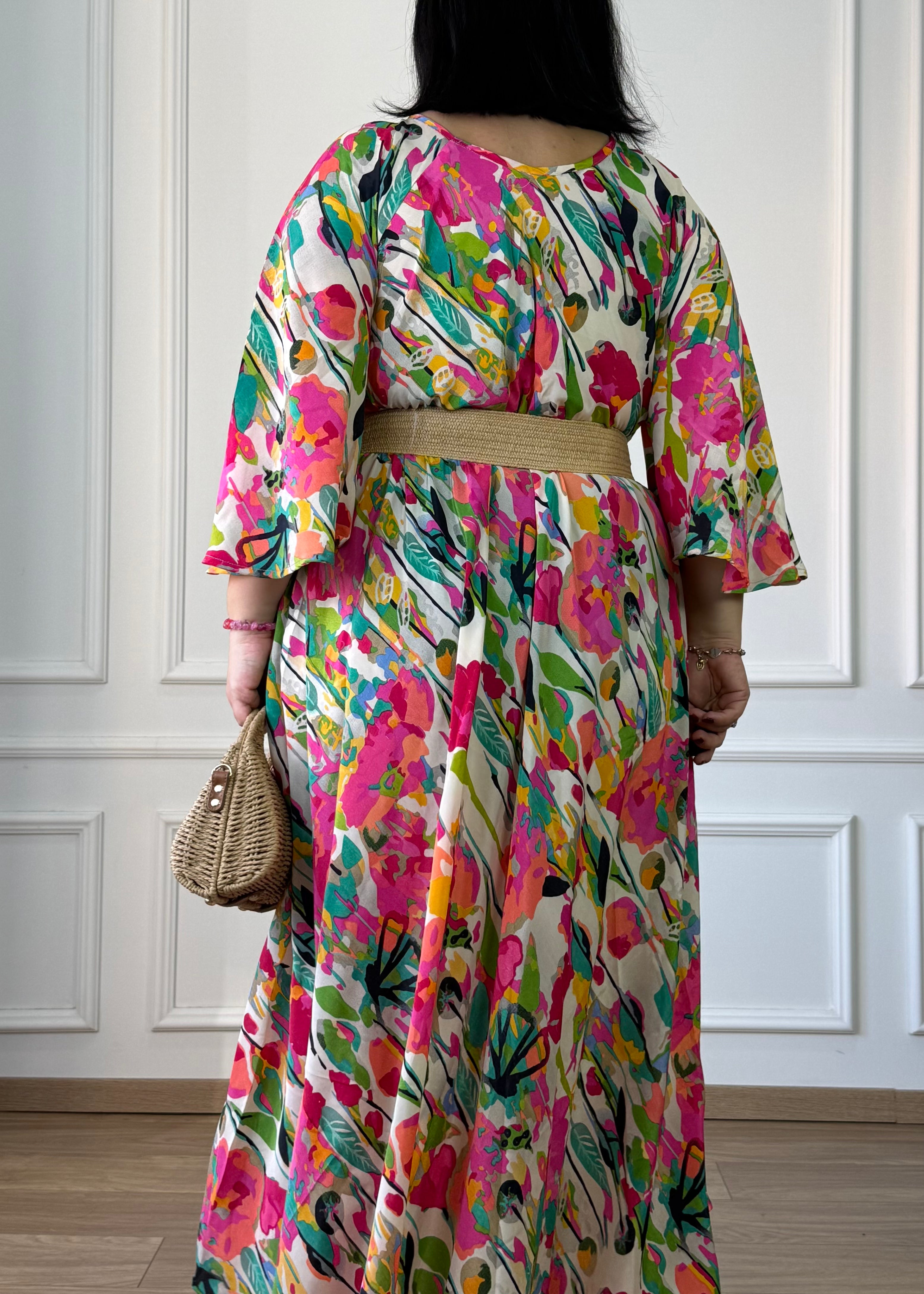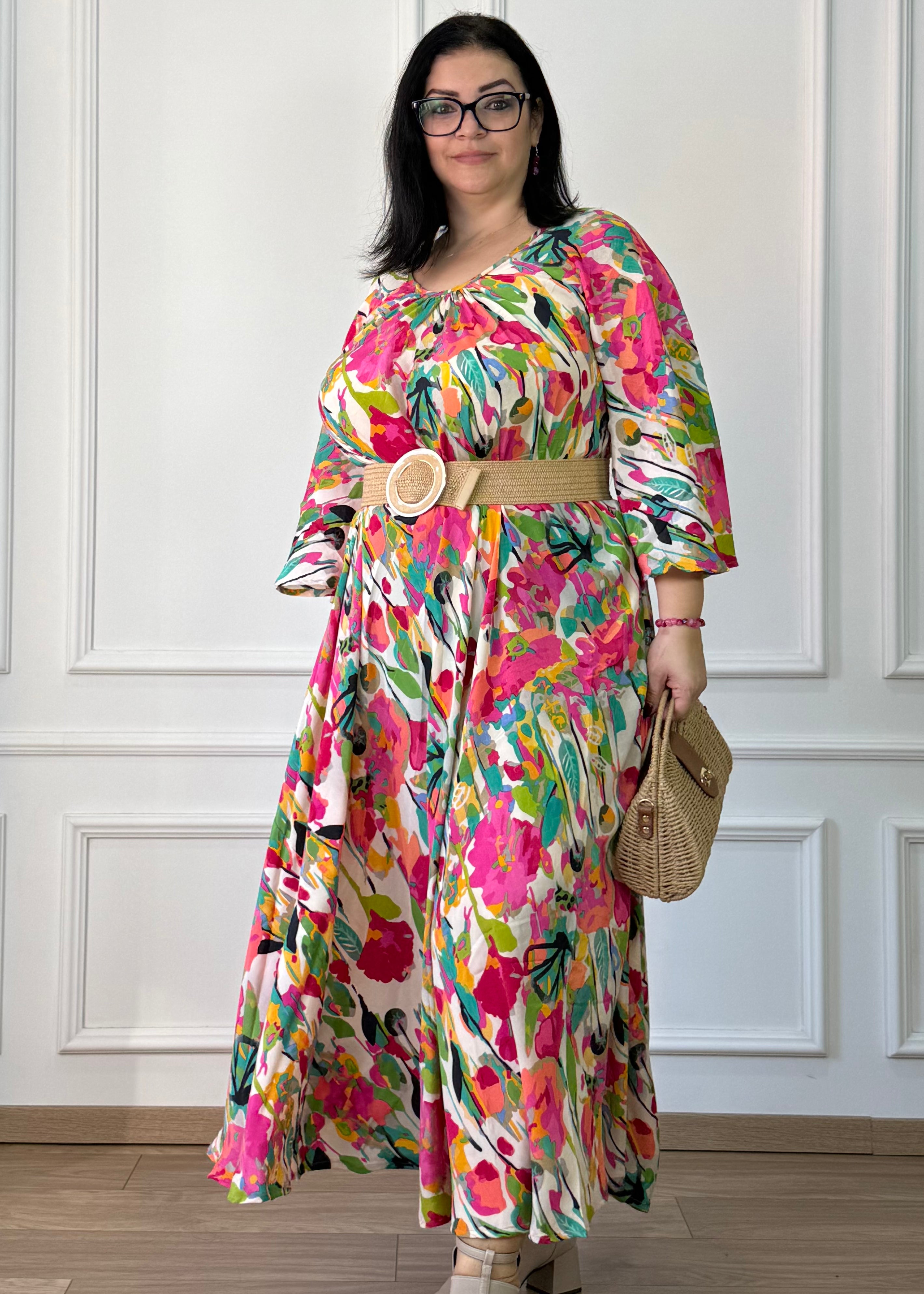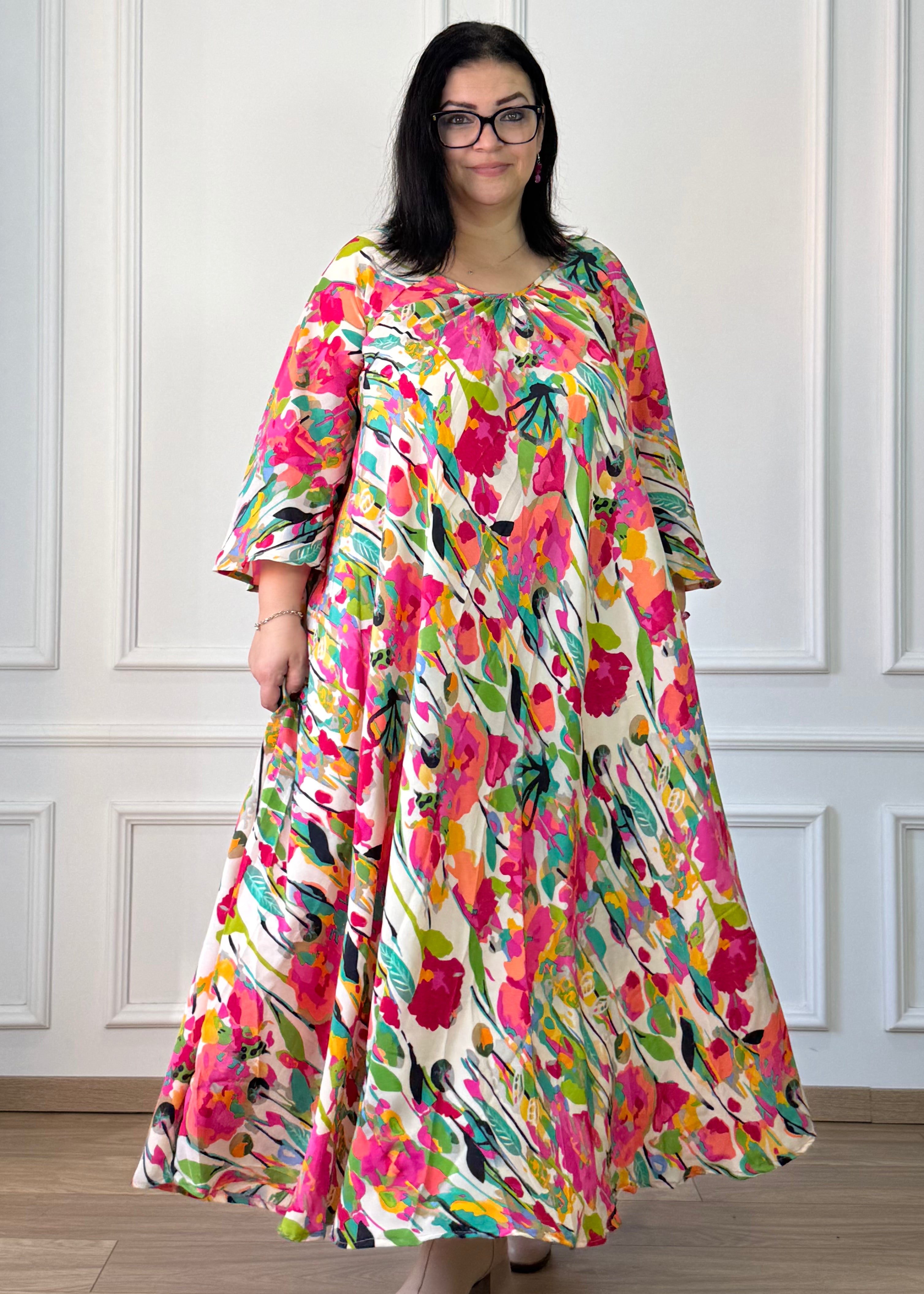 A-vonalú, zsebes maxi ruha rááncolt nyakkal és 3/4-es, bő ujjakkal. Selyemhatású anyaga könnyed esést biztosít, laza szabása miatt kényelmes viselet a mindennapokra, de egy övvel kiegészítve karcsúsított hatást is elérhetsz.