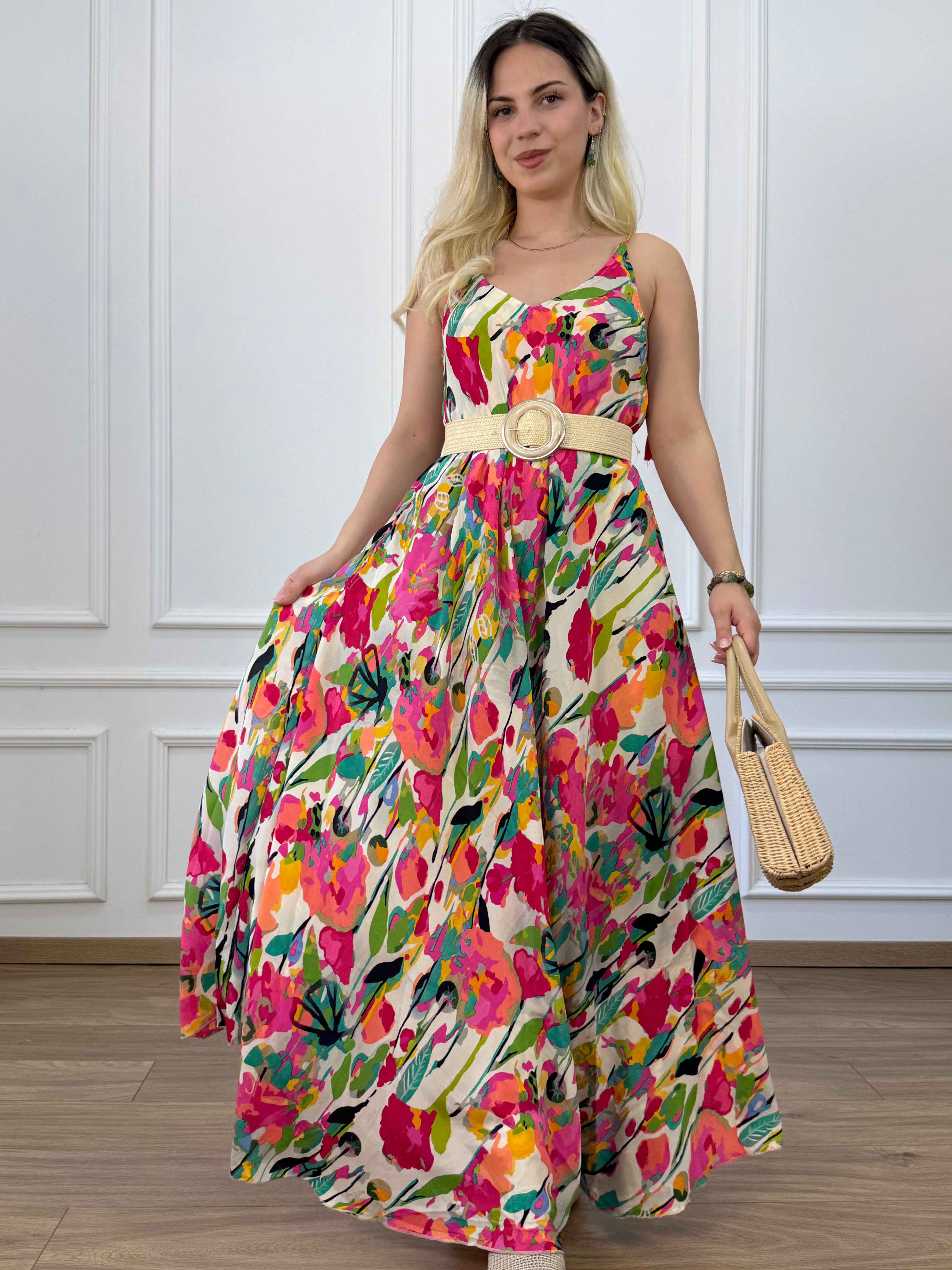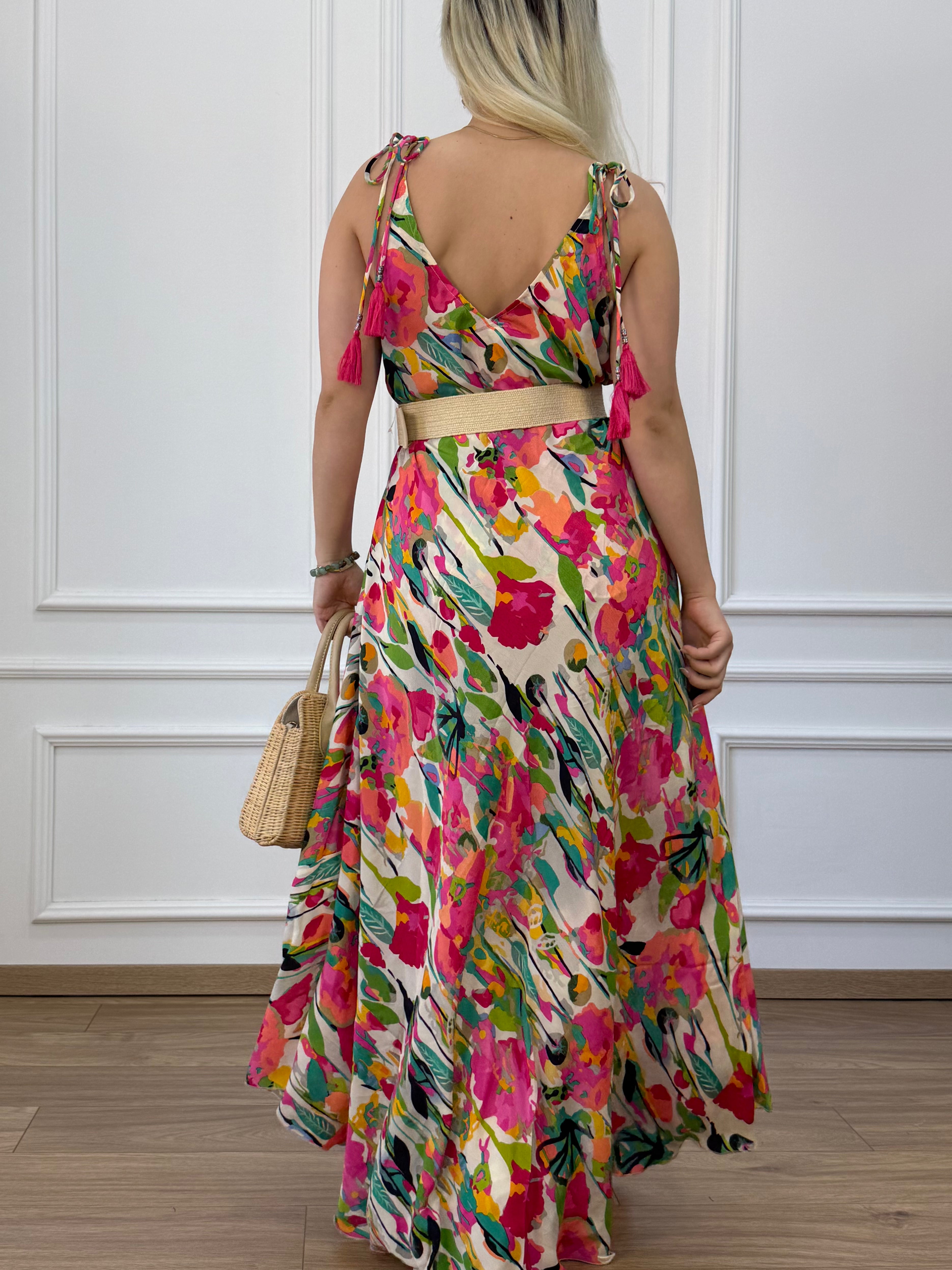 Hosszú, A-vonalú selyemhatású ruha V-nyakkal, két oldalzsebbel, keskeny, megköthető vállpánttal.