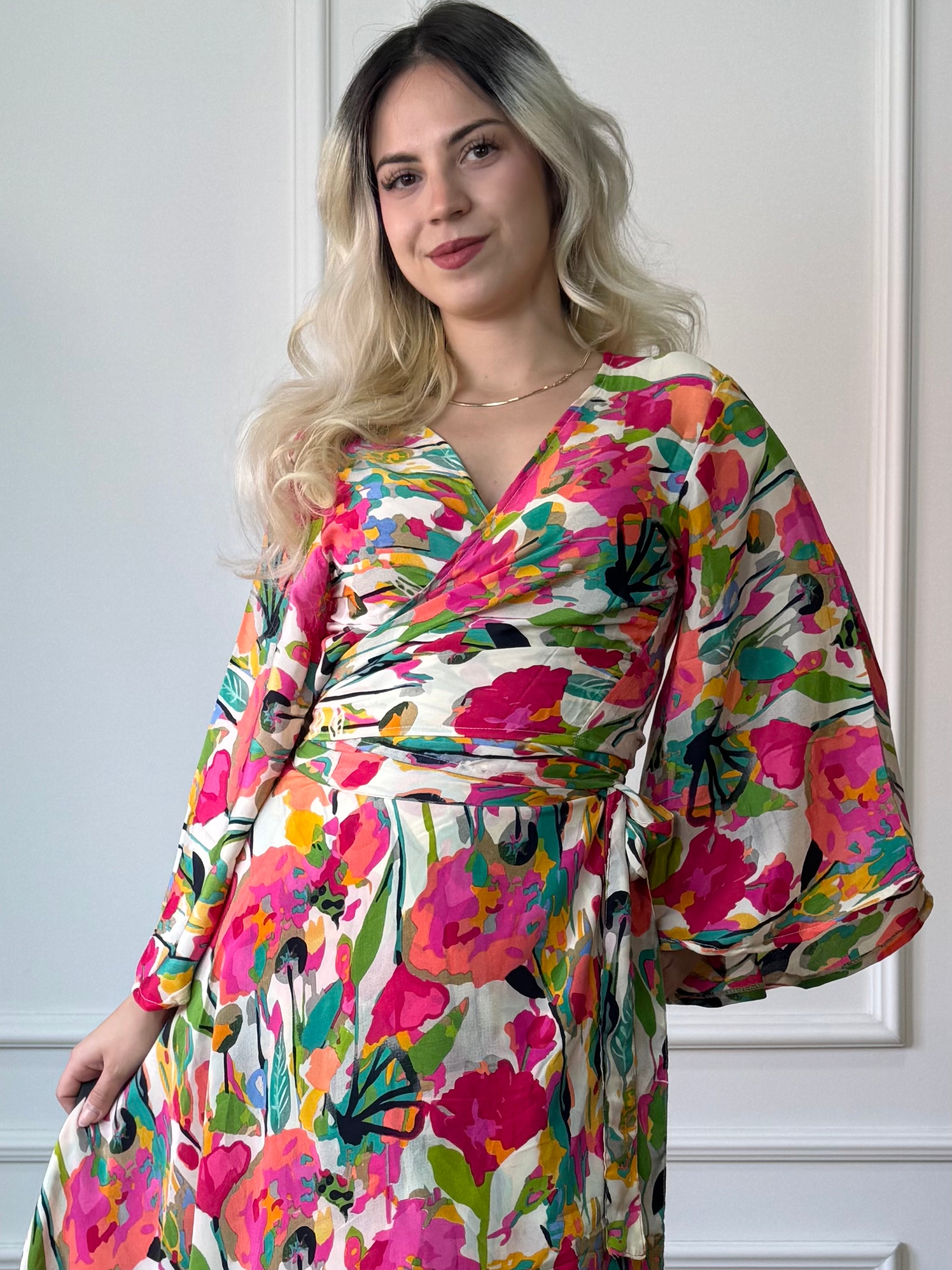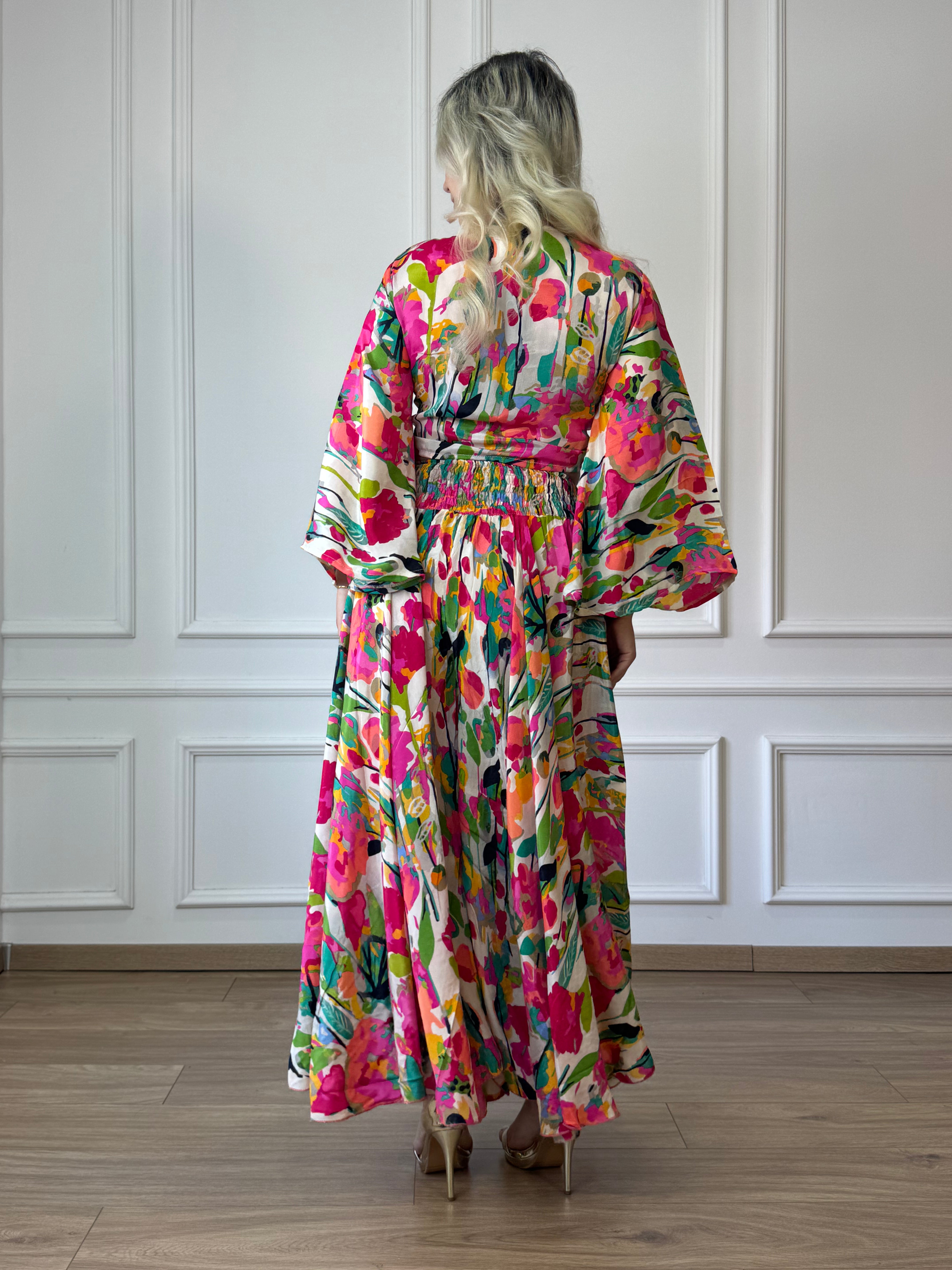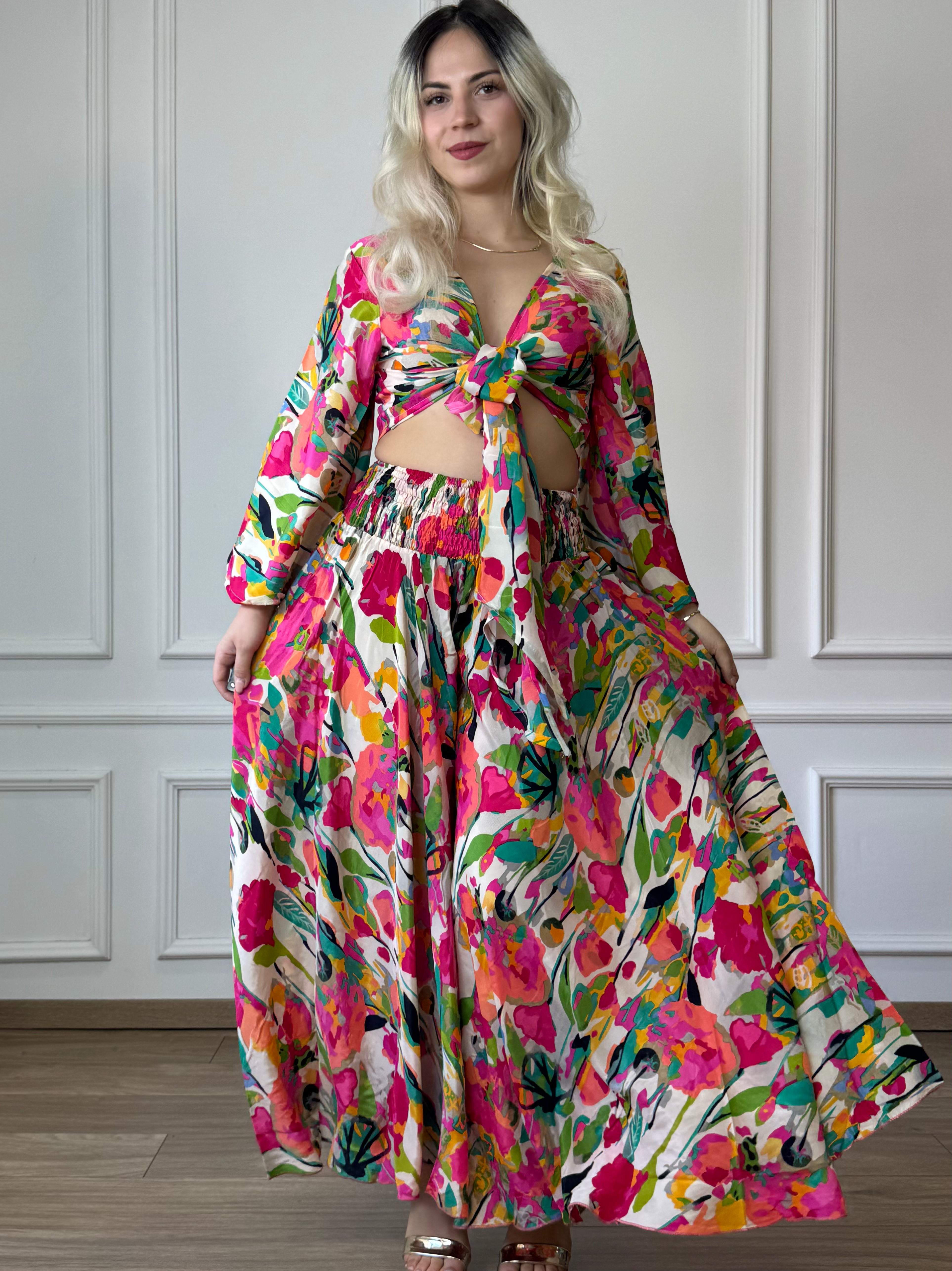Elől vagy hátul megköthető felső, harang ujjakkal.