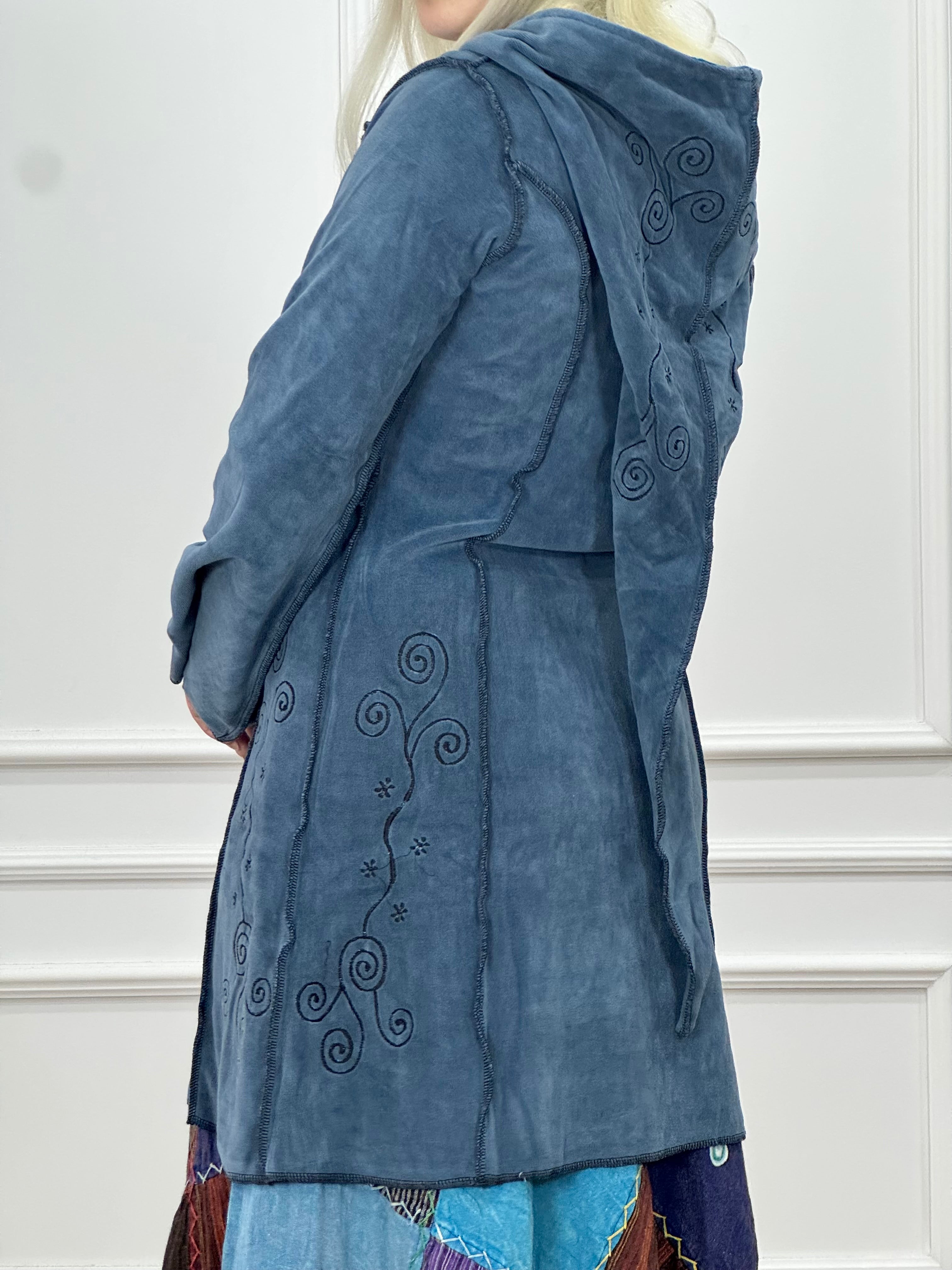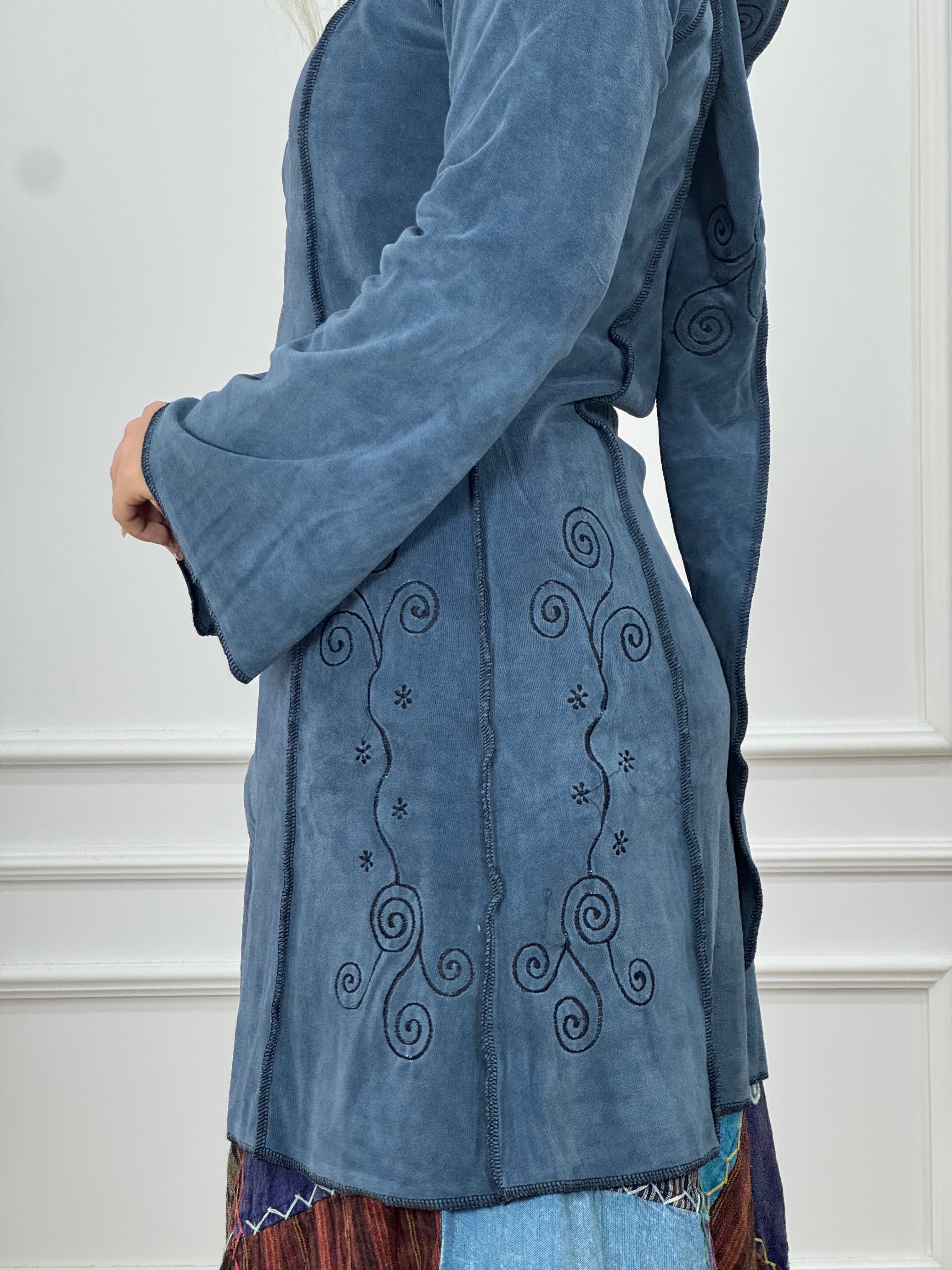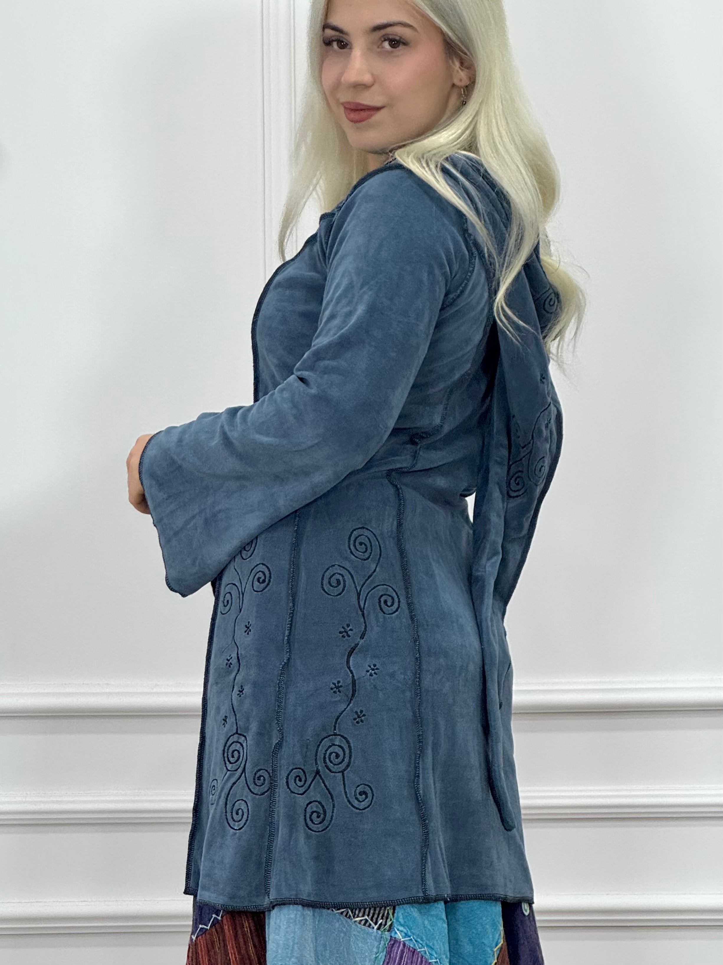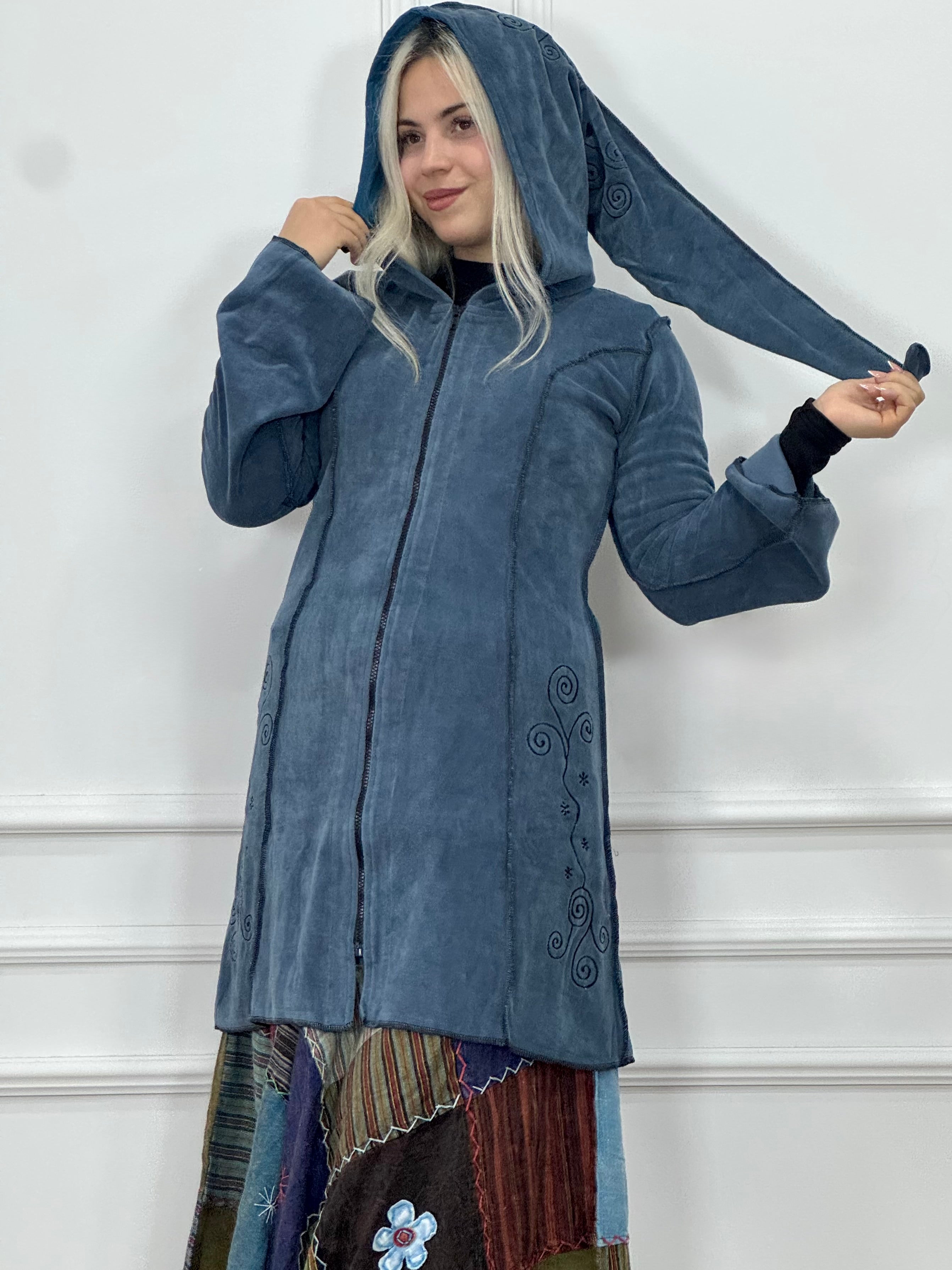 Puha, bársonyhatású anyagból készült hosszított kardigán, amelyet finom, hímzett részletek díszítenek az oldalán és a hosszú manókapucnin. Kényelmes viselet a hűvösebb napokon, miközben az egyedi szabás és a hosszú kapucni különleges hangulatot ad az egész megjelenésnek. Enyhén harang ujjú.