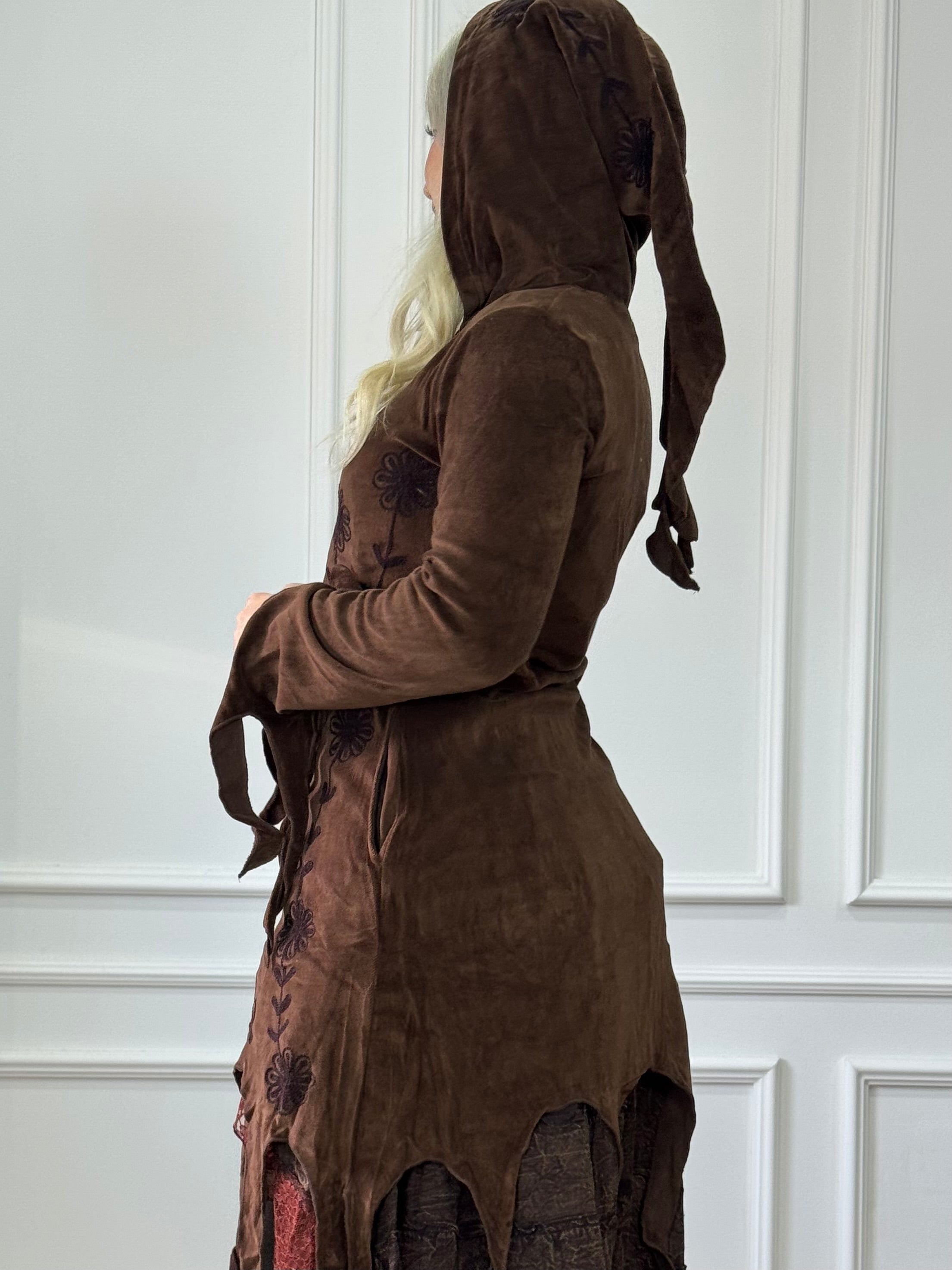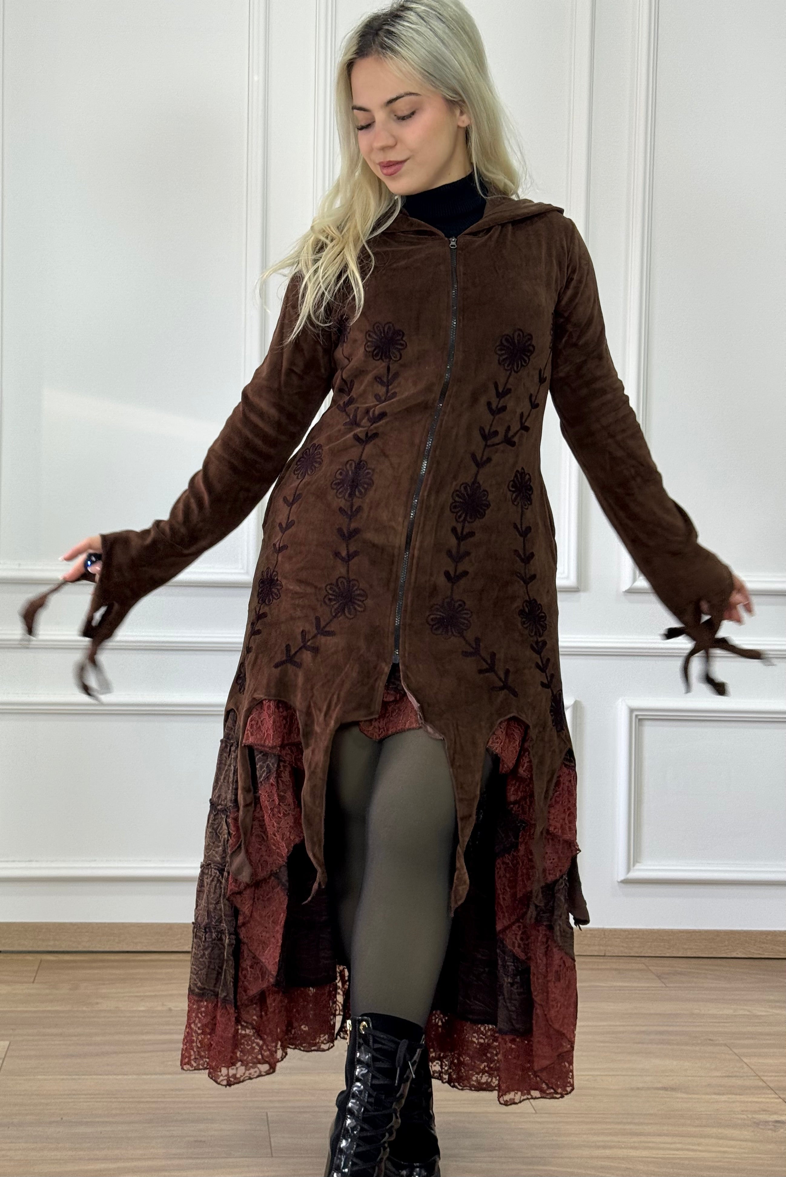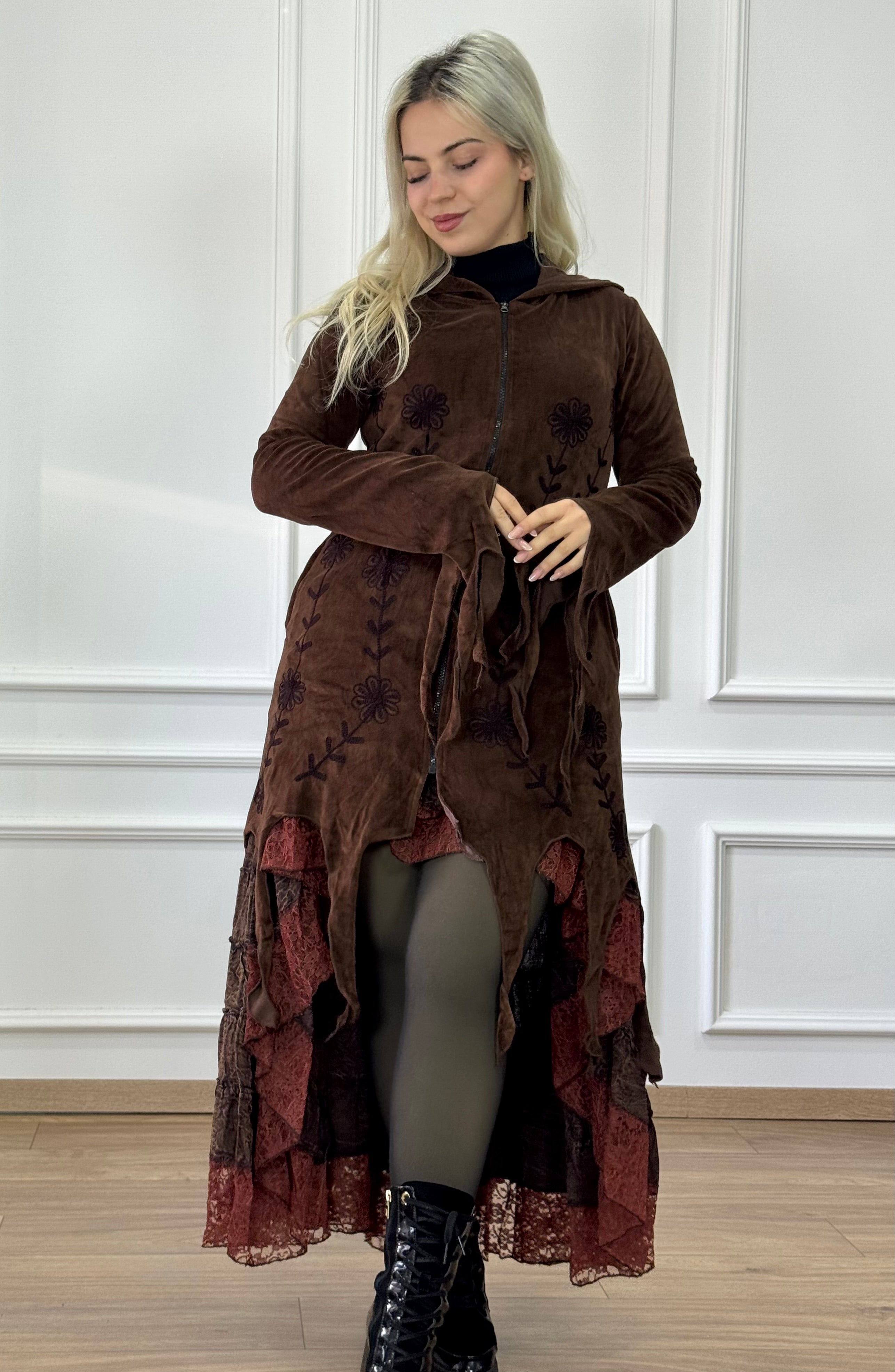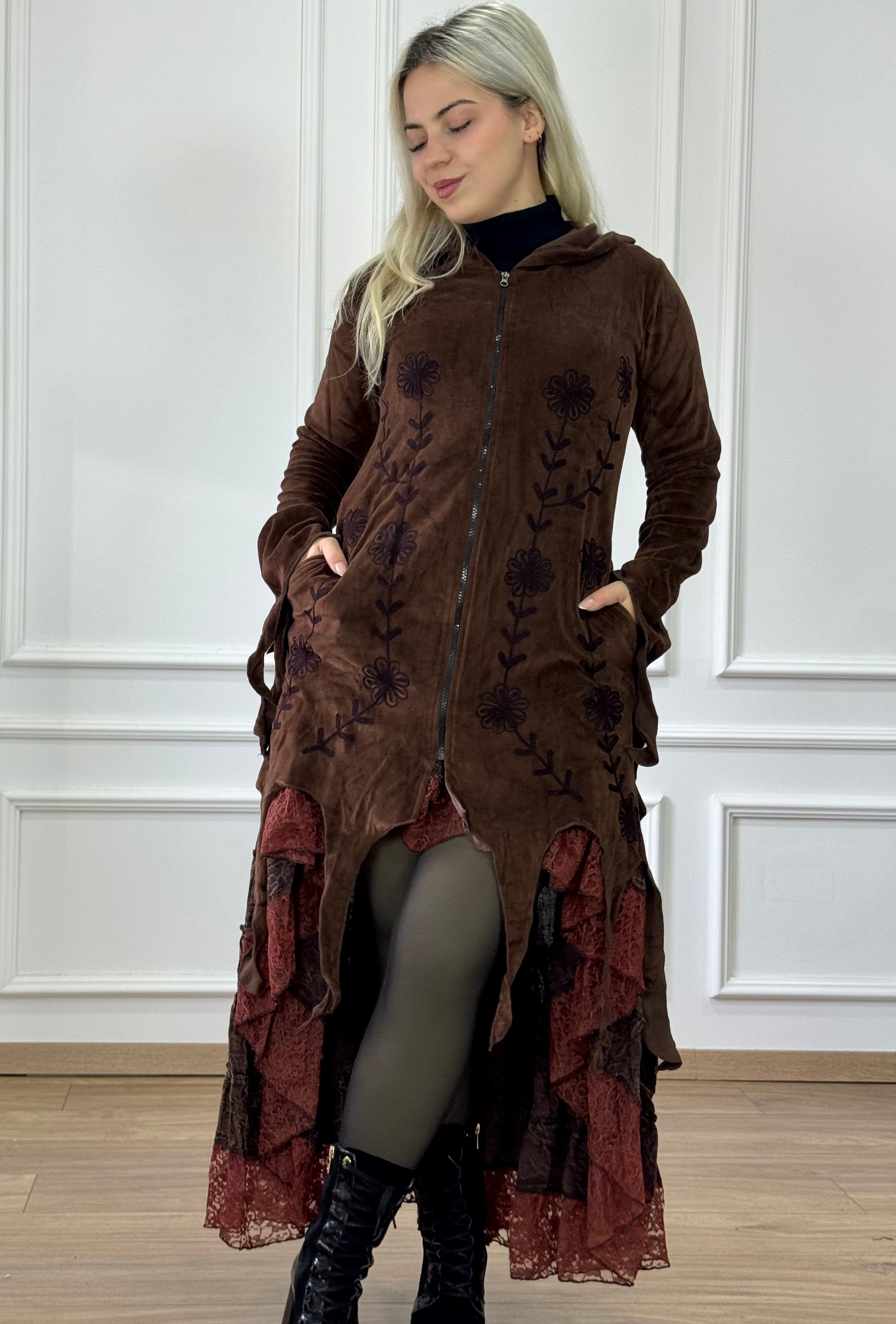Ez a bársonyhatású kardigán igazán különleges darab a részletei miatt: elöl és az ujján finom, dekoratív hímzések futnak végig, a manókapucnin pedig ugyanezek a motívumok folytatódnak. Az alján a dekorcsíkok adnak játékos, egyedi esést, amitől a fazon még karakteresebb. Kényelmes, mégis látványos réteg a hűvösebb napokra.