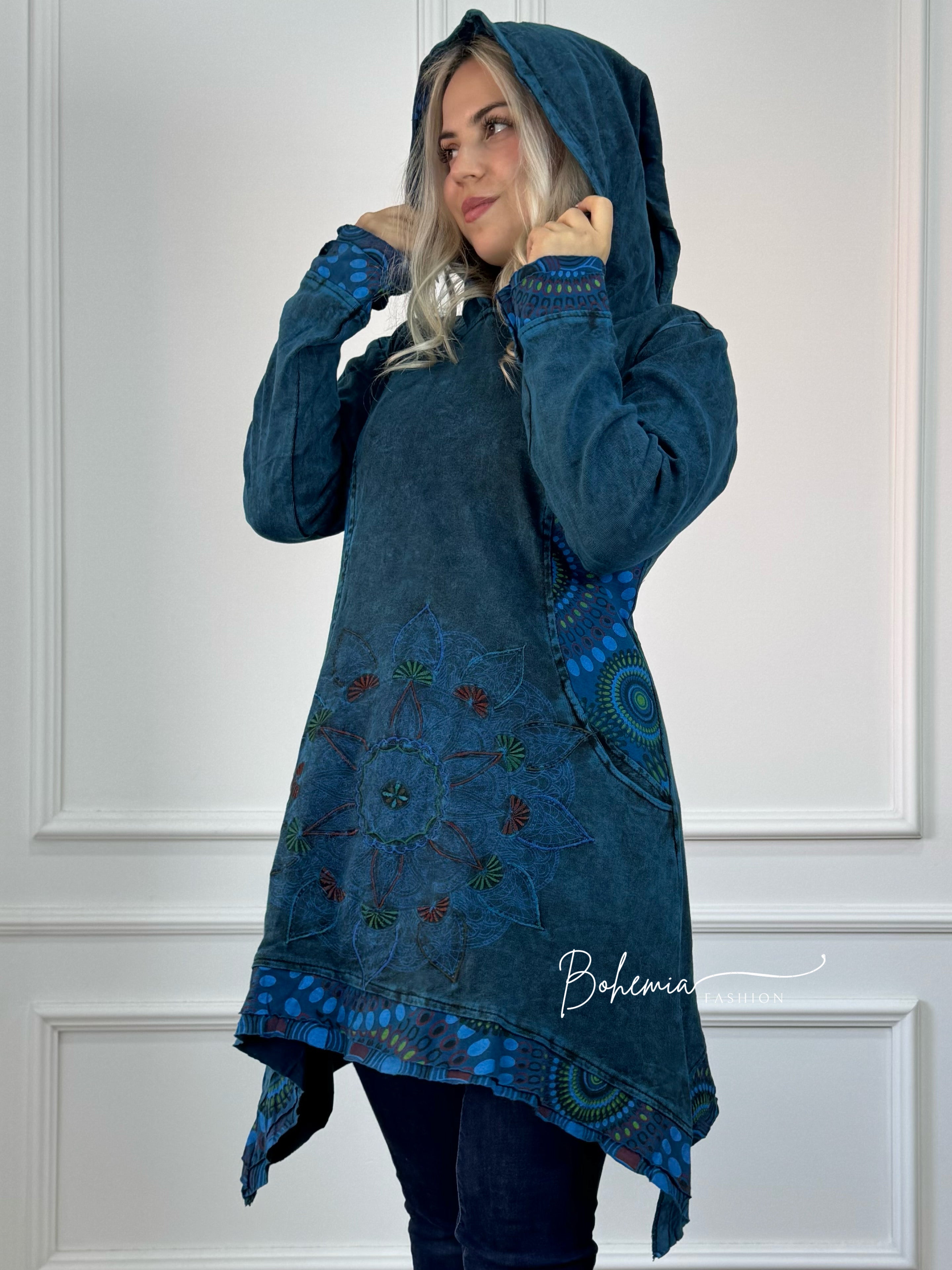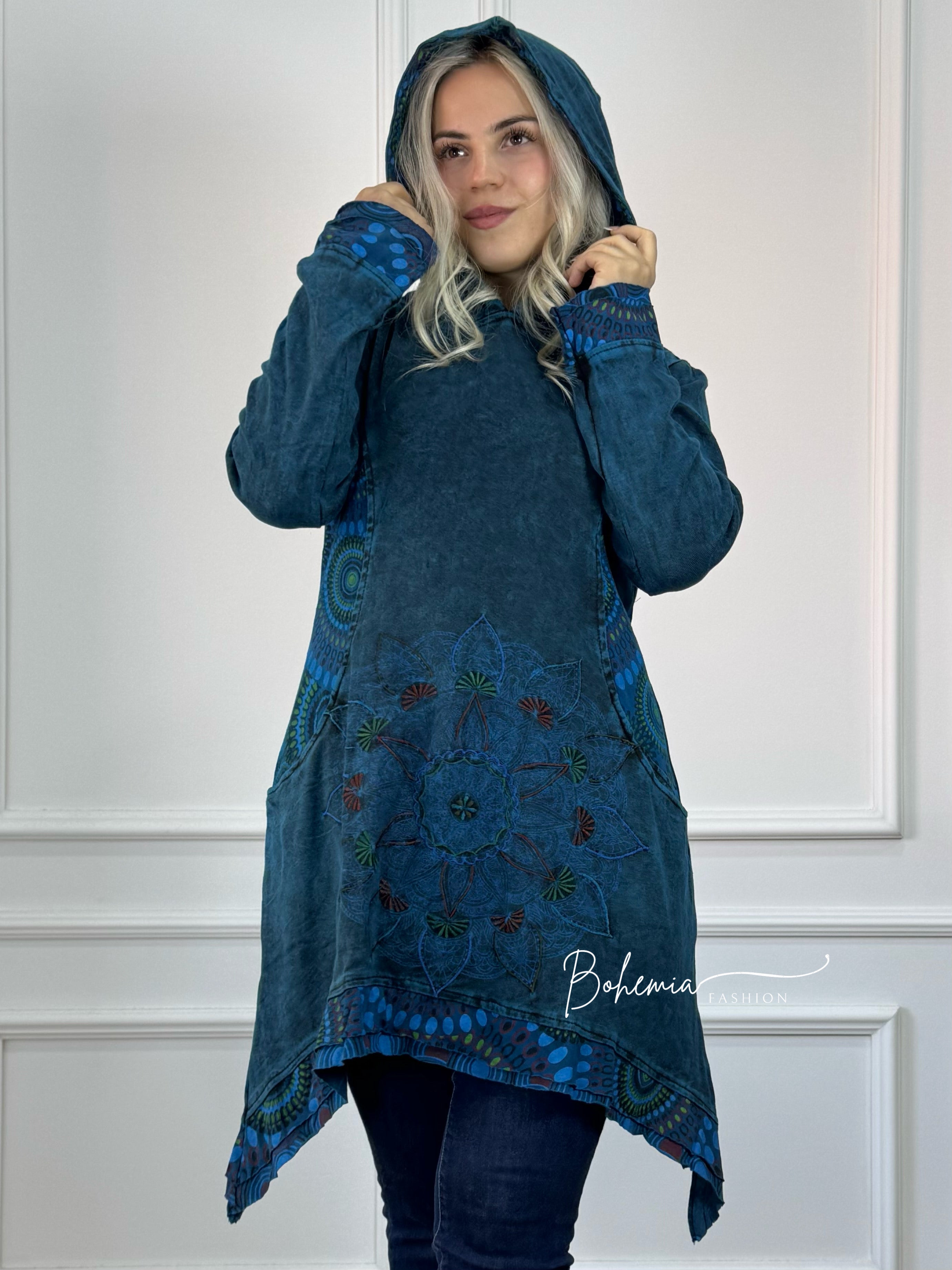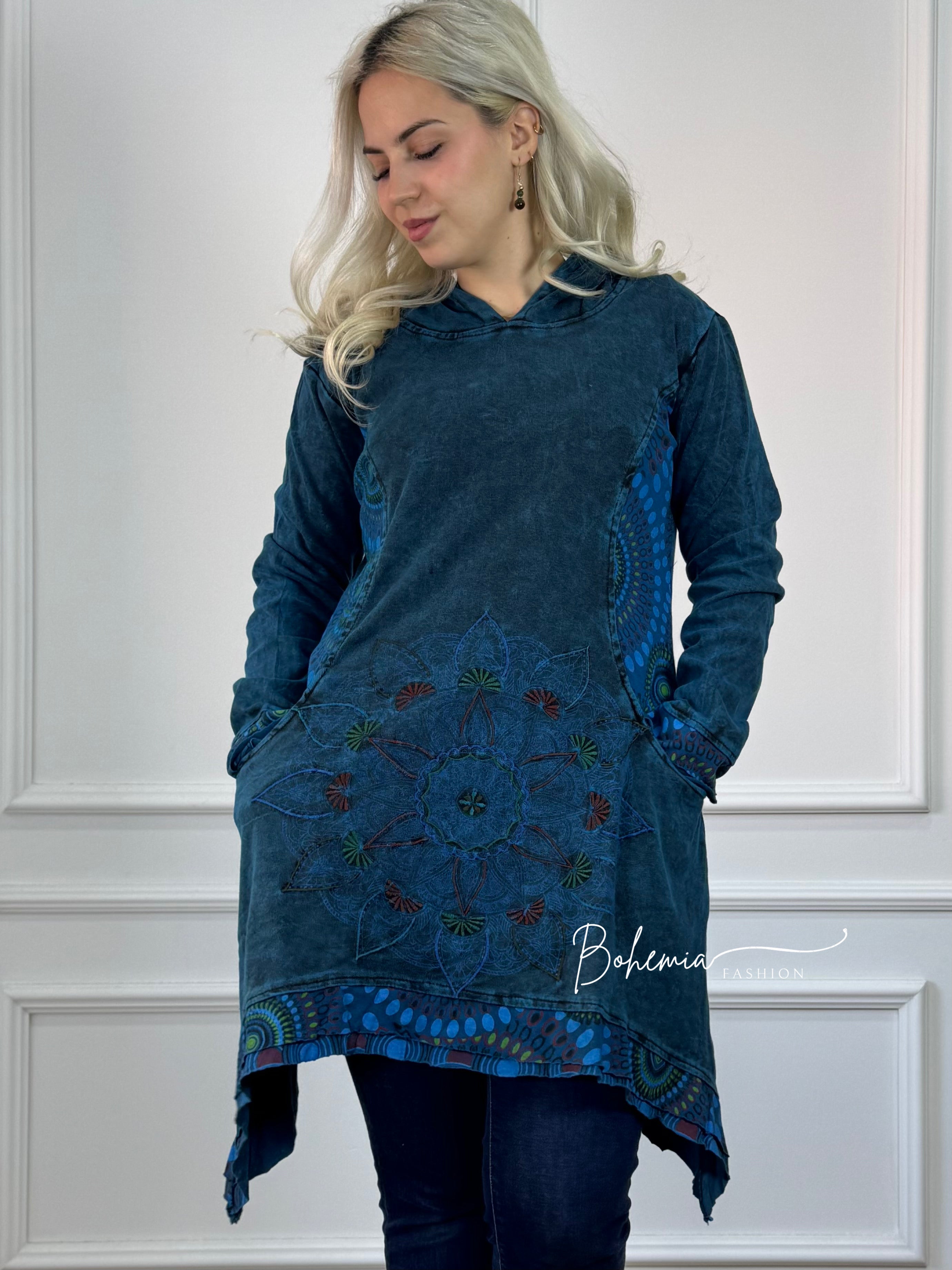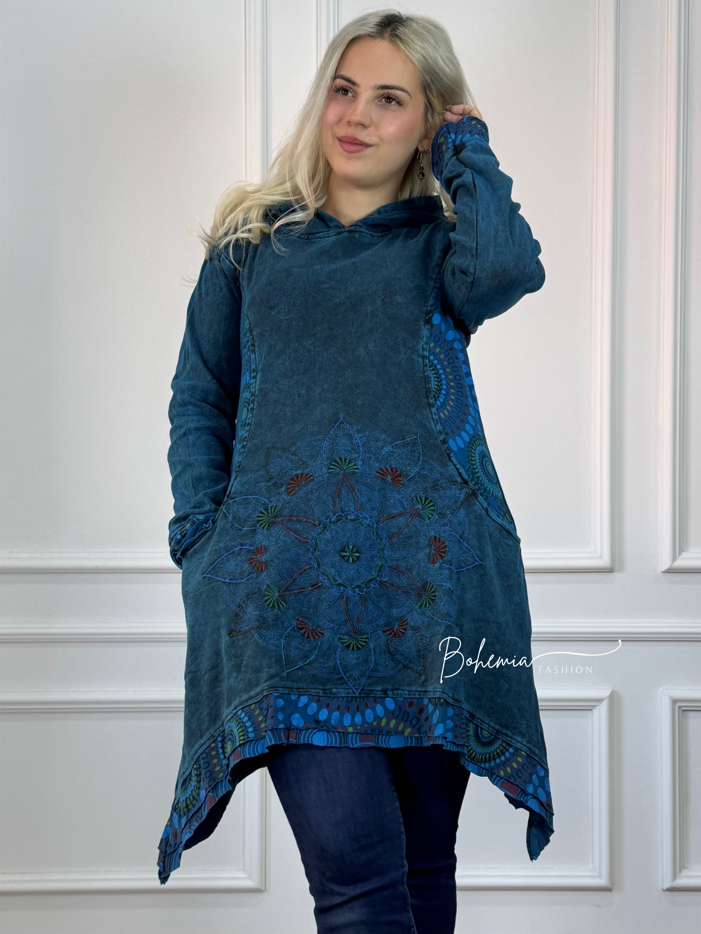 Kőmosott, hosszított fazonú pamut pulóver elöl hímzett mandala mintával. Két oldalzsebbel és manó kapucnival.
