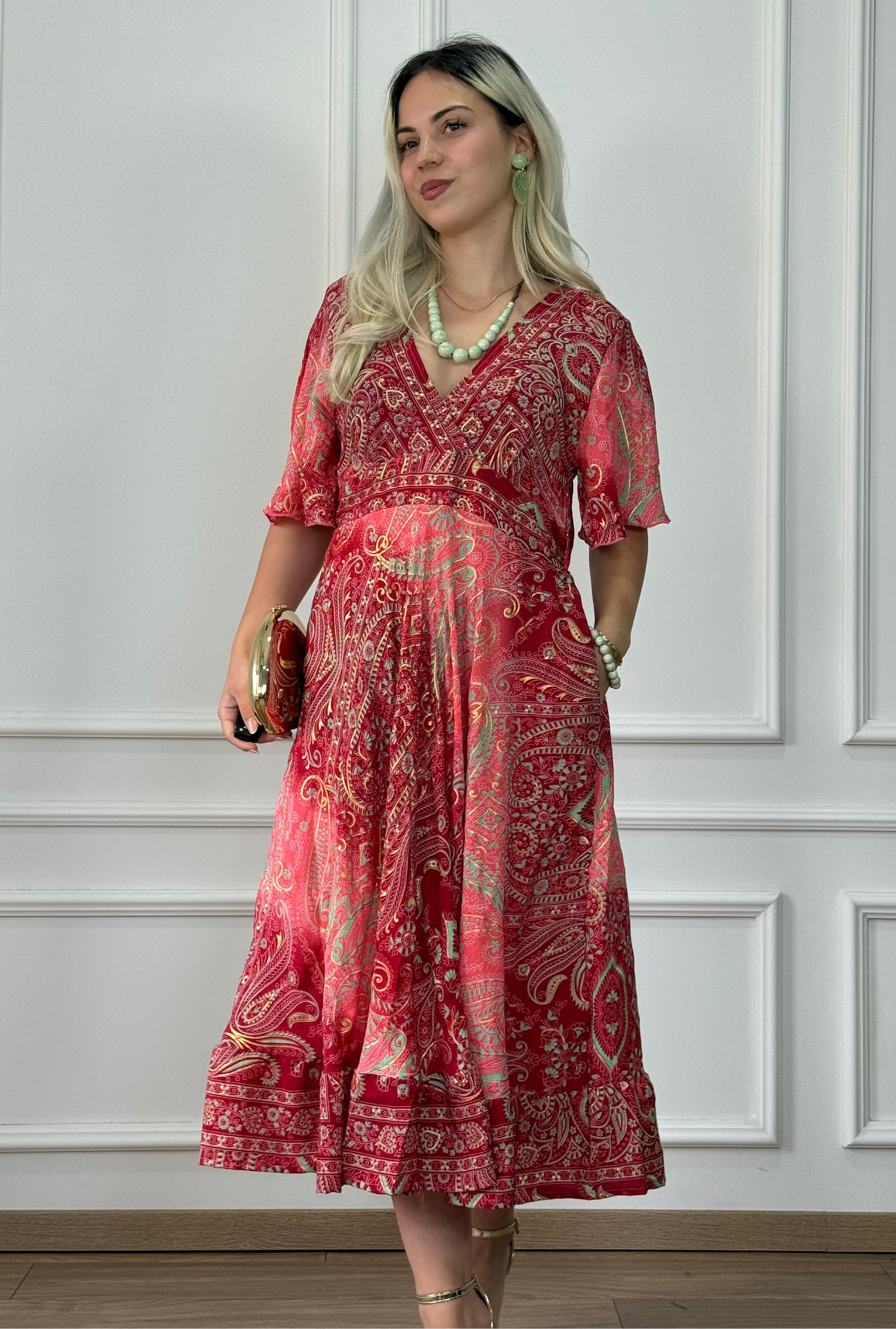 Könnyed és elegáns, selyemhatású midi ruha, amely finoman követi a mozgást, miközben kellemes viseletet biztosít. Az átlapolt mellkas és a lágy esésű ujjak romantikus megjelenést kölcsönöznek, amíg a hátul gumis derékrész kiemeli az alakot. A ruha oldalán található zsebek praktikus kiegészítést nyújtanak. A lefelé bővülő szoknya alját fodor díszíti.