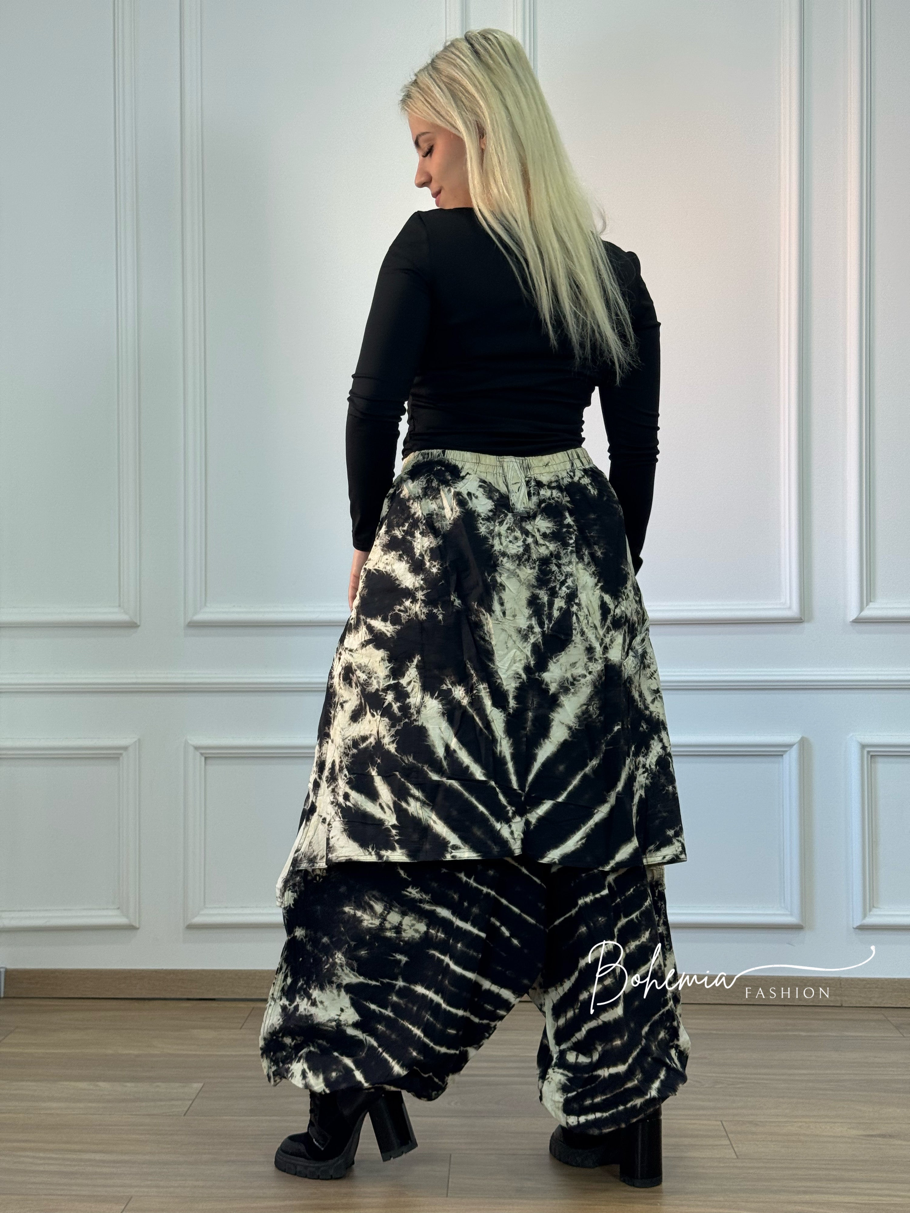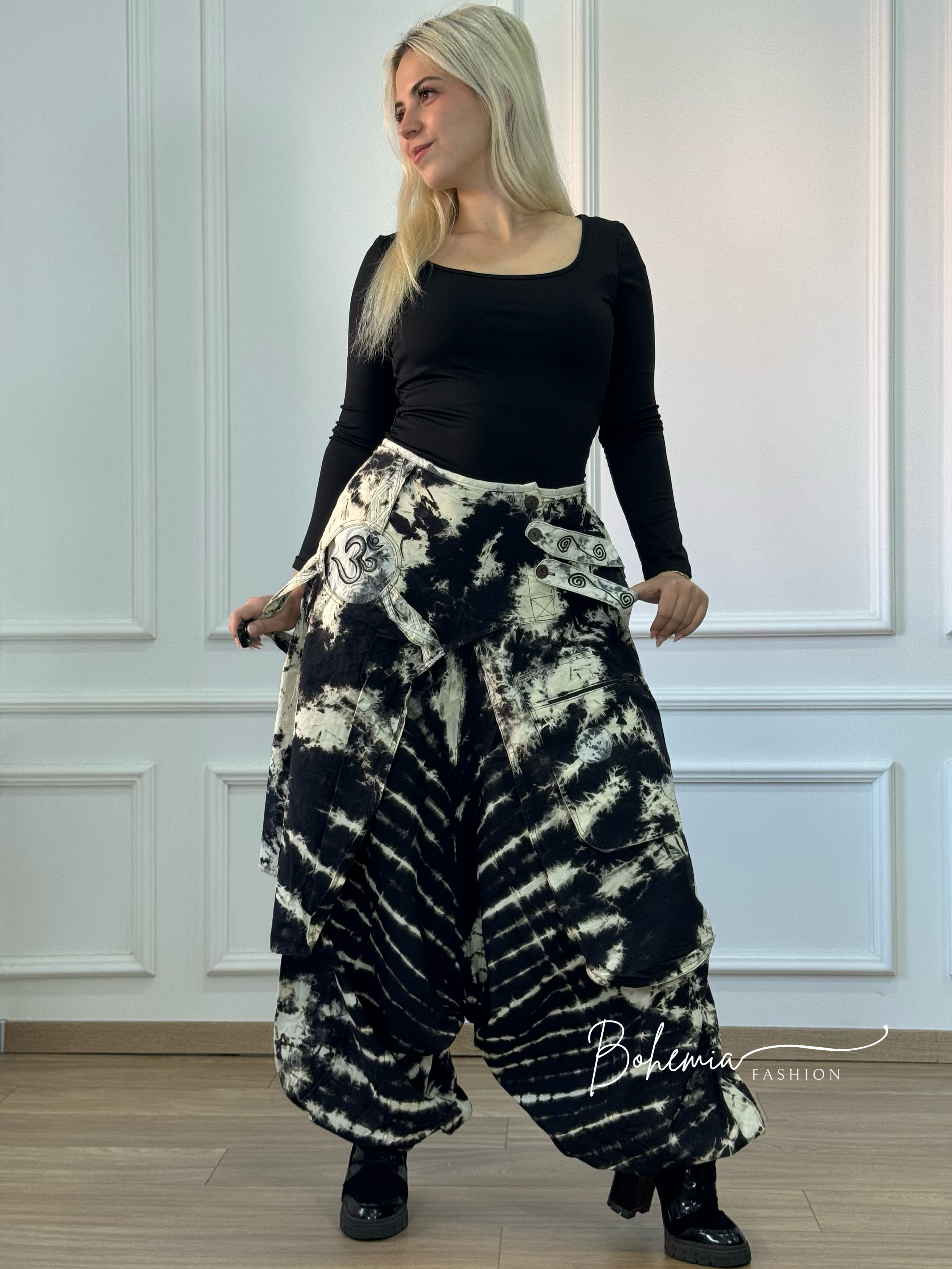Batikolt, pamut Aladdin nadrág patchwork részletekkel. Praktikus zsebbel az om szimbólumnál és egy cipzáros oldalzsebbel, kényelmes gumis derékkal. Laza, mégis karakteres fazon, azoknak, akik szeretnek eltérni a megszokottól.
