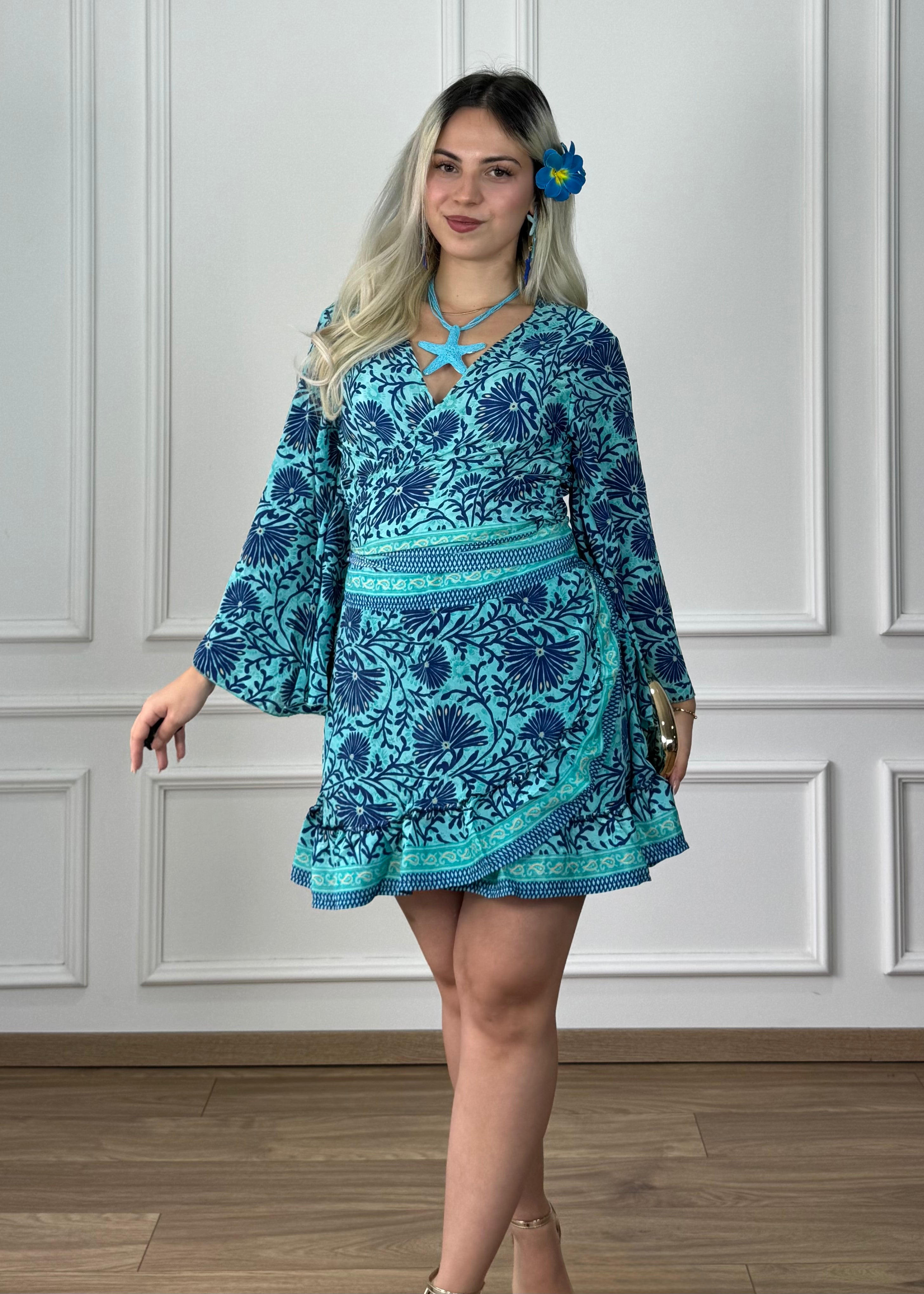 Elől vagy hátul megköthető felső, harang ujjakkal.