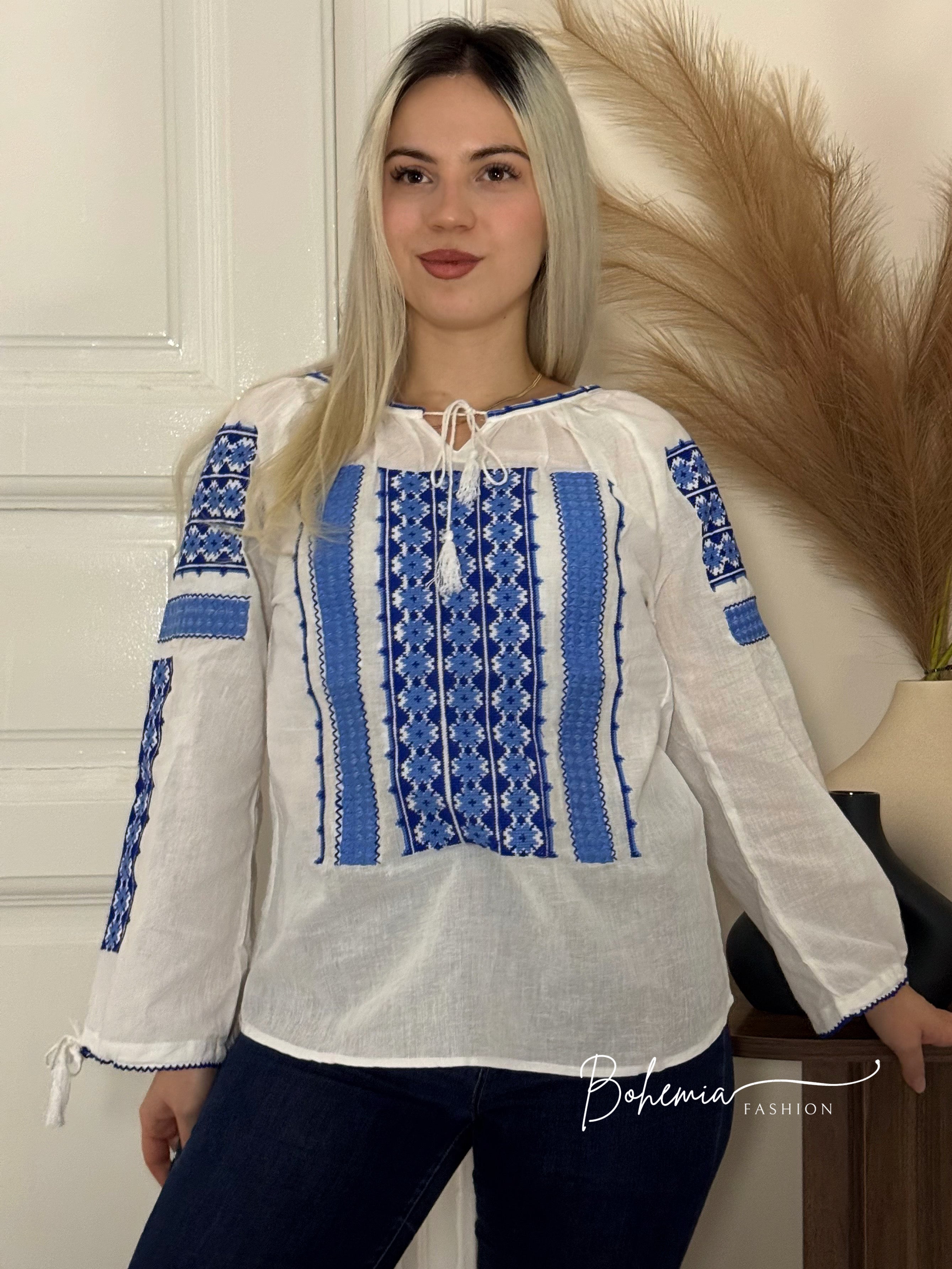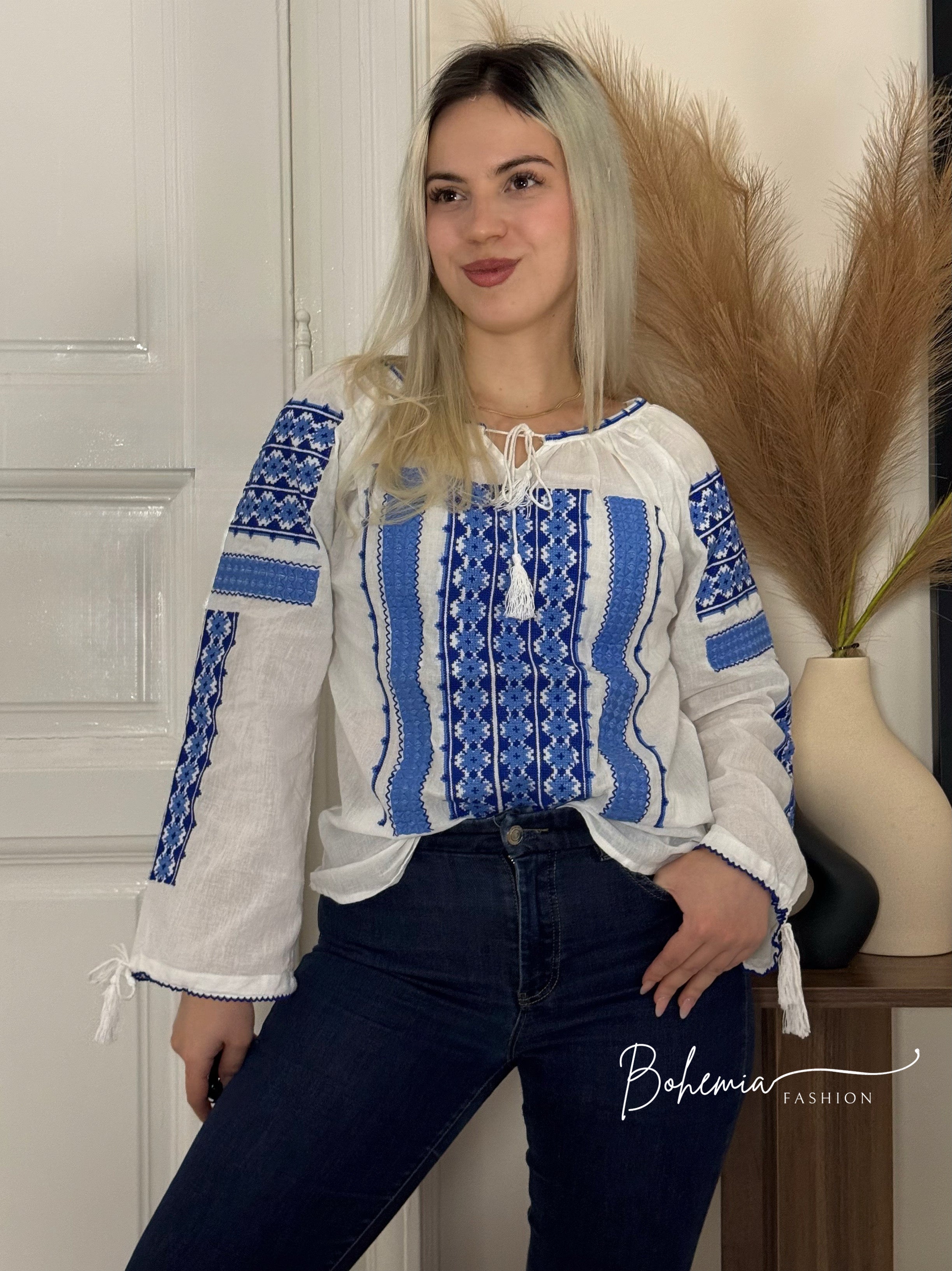 Hosszú ujjú blúz hímzett mintával a mellrészen és az ujjakon. Az ujjvégeken található megkötőnek köszönhetően viselhető bő, harangujjú fazonban vagy csuklónál szűkítve is, így könnyedén alakítható a megjelenés. Sokoldalú darab, amely hétköznapokon és különlegesebb alkalmakon is megállja a helyét.