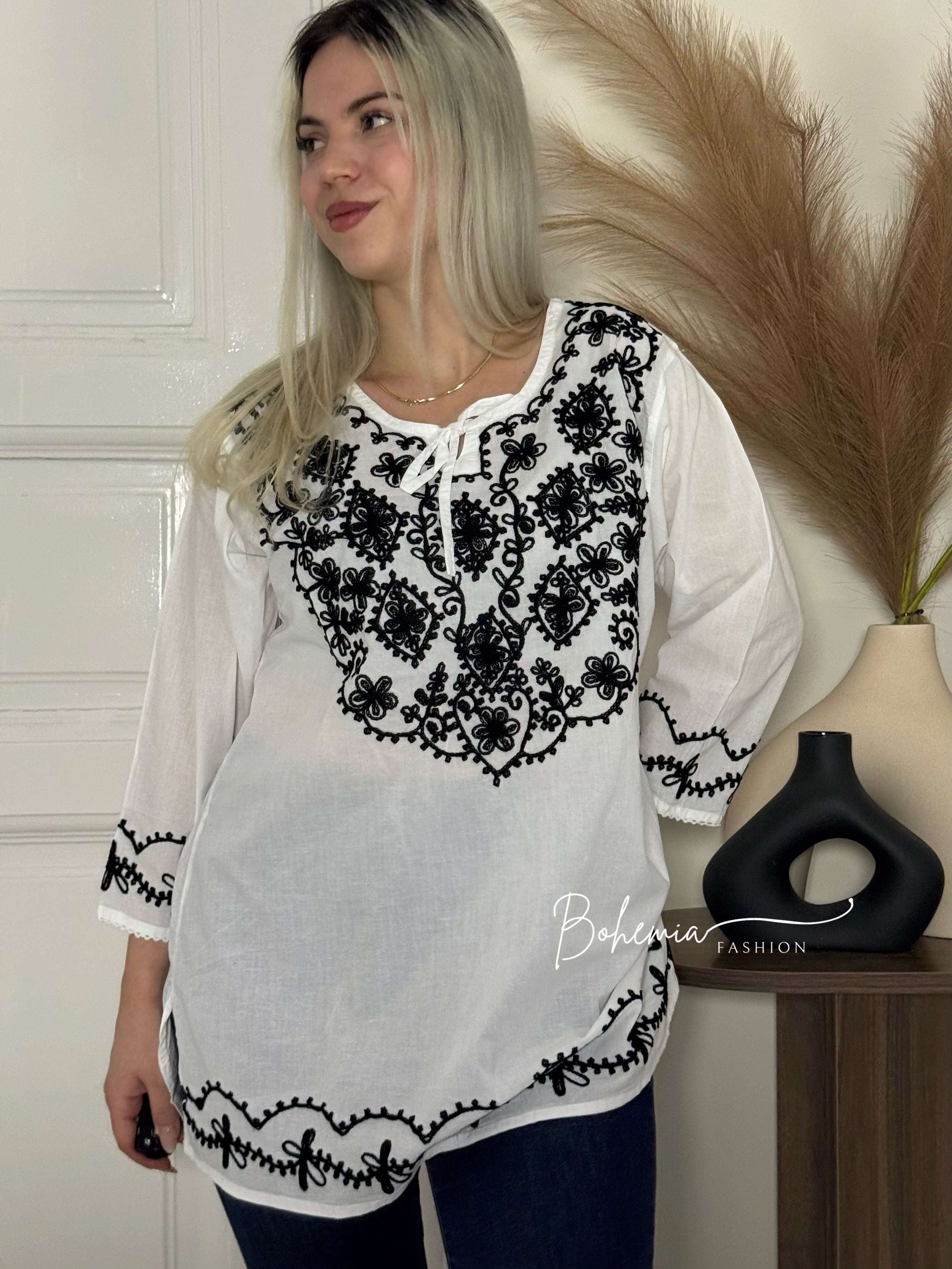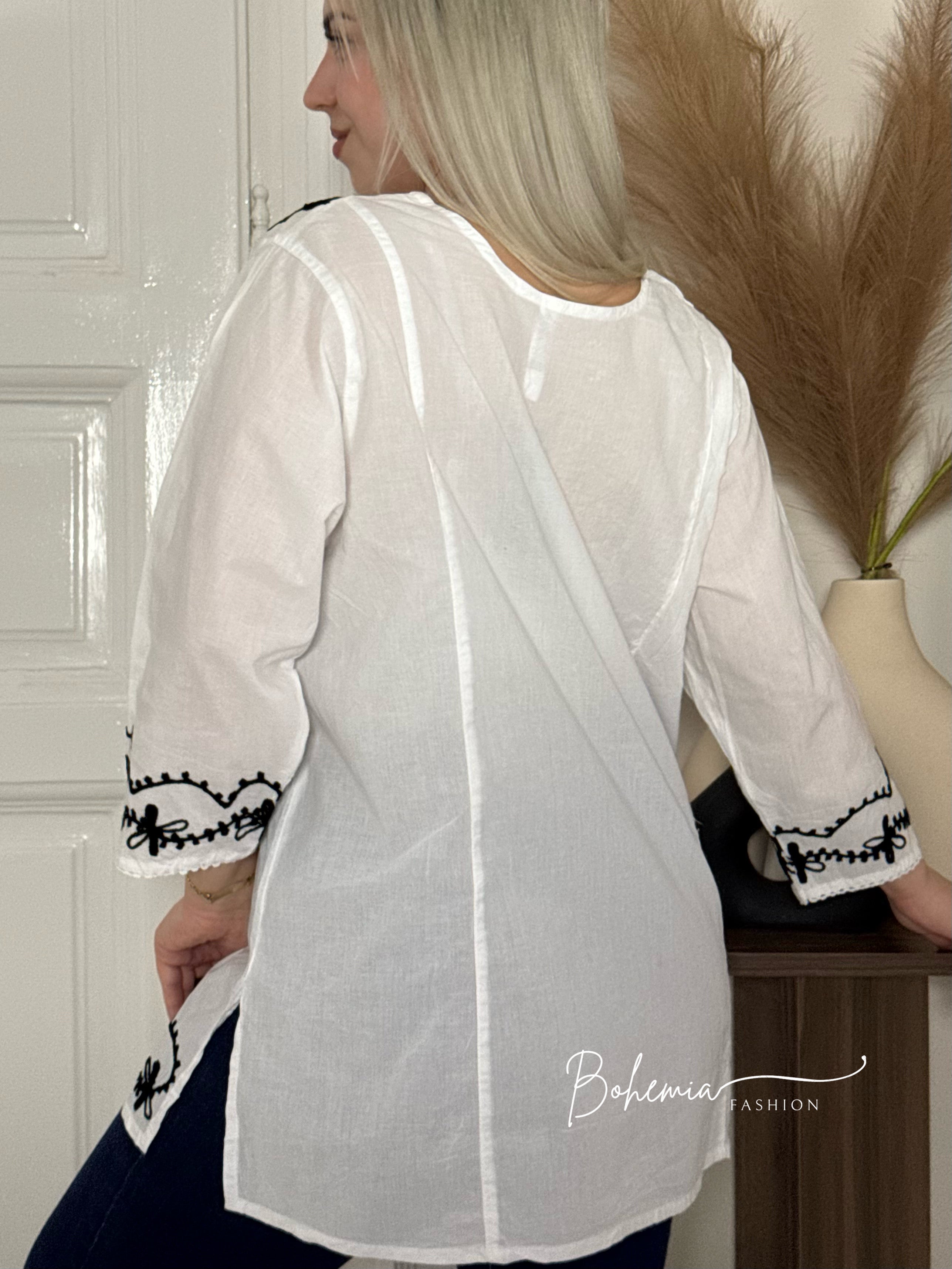 3/4 ujjú blúz hímzett mintával a mellrészen, az alján és az ujjvégeken.