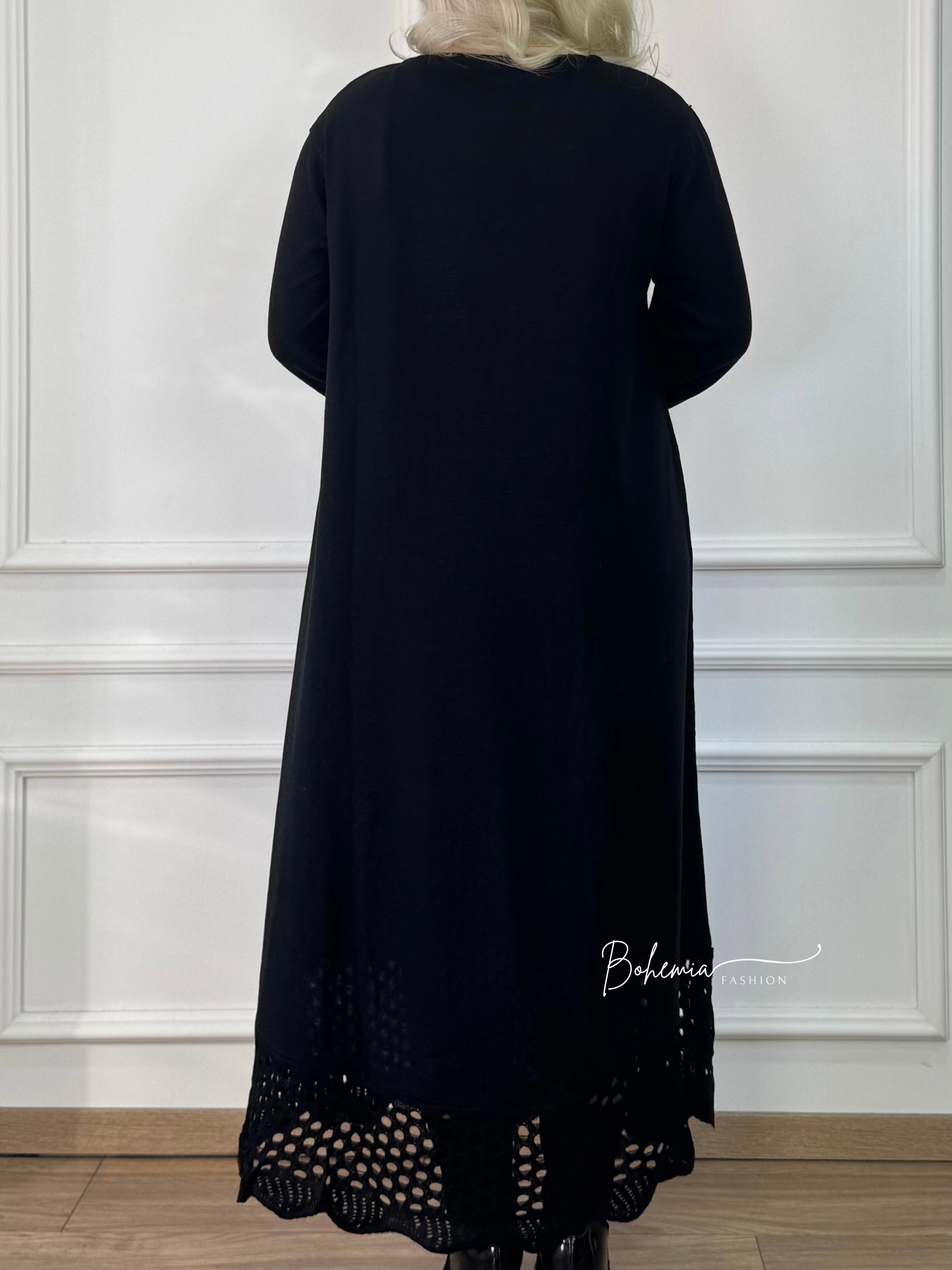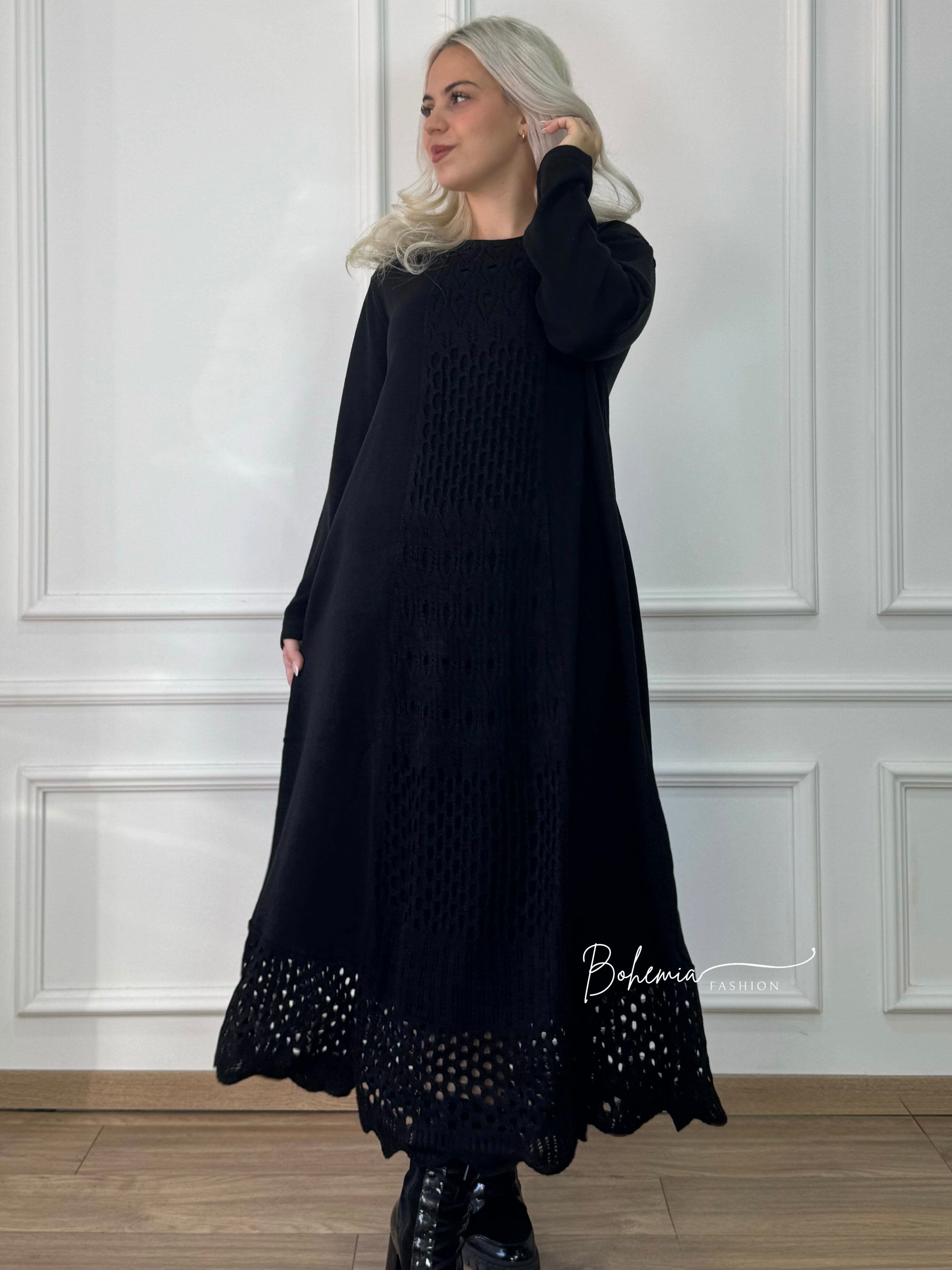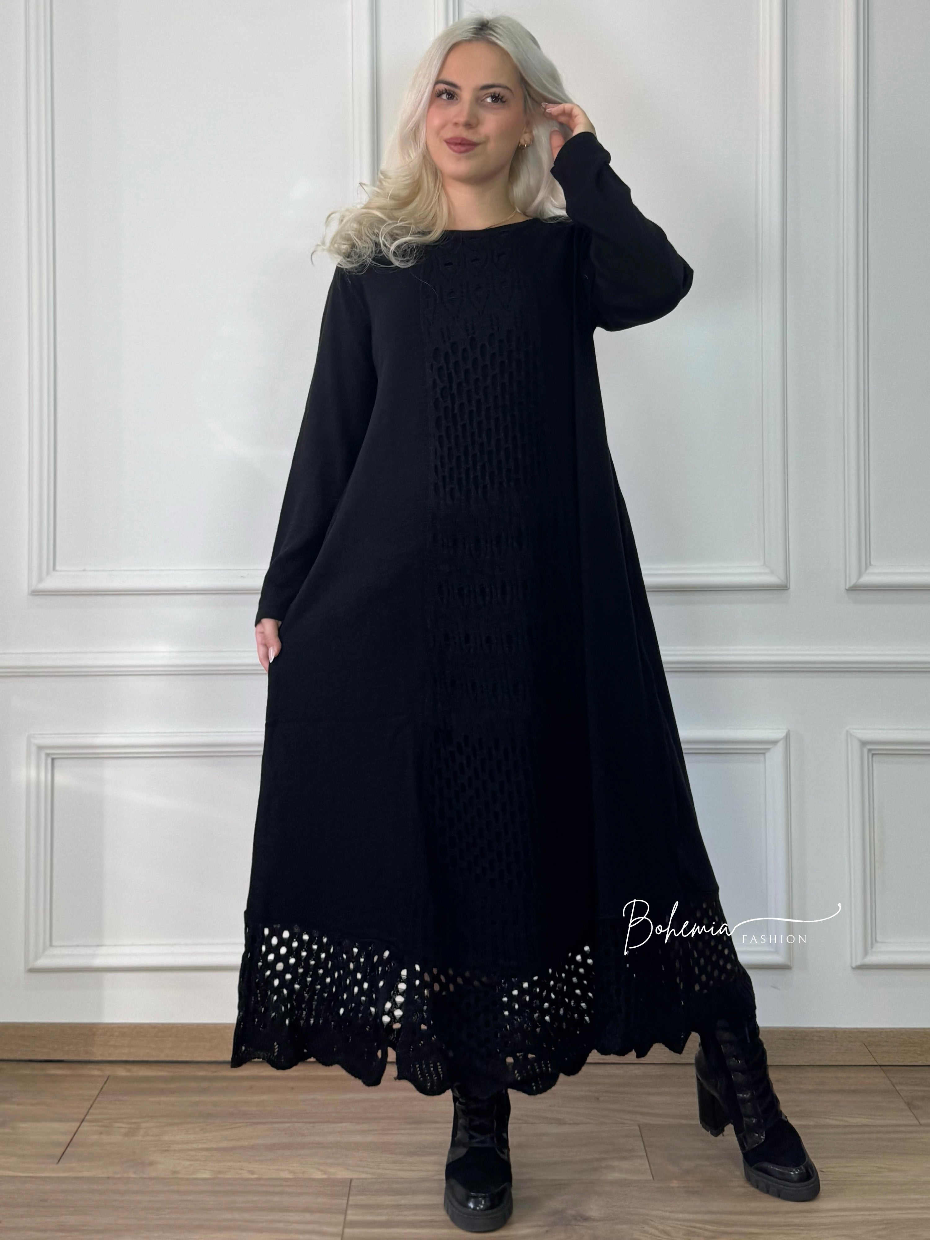Hosszú, A-vonalú, puha, kötött gyapjúkeverék ruha kerek nyakkal, hosszú ujjal, kötött díszsáv a ruha elején és alján.
