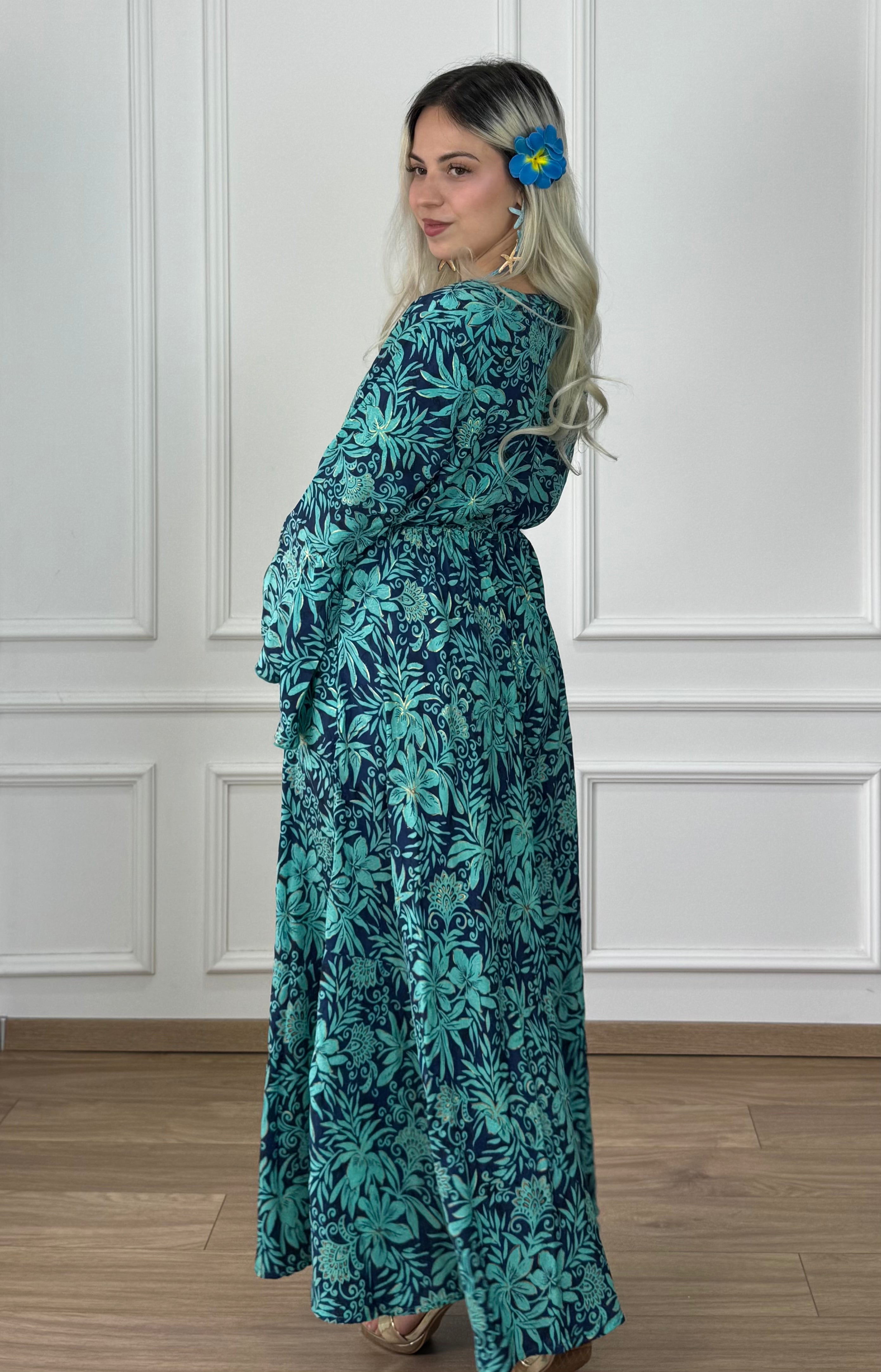 Mintás, zsebes maxi ruha selyemhatású anyagból, V-kivágással, gumis derékkal és elegáns tölcsér ujjal. Könnyed, nőies viselet, praktikus zsebekkel kiegészítve.
