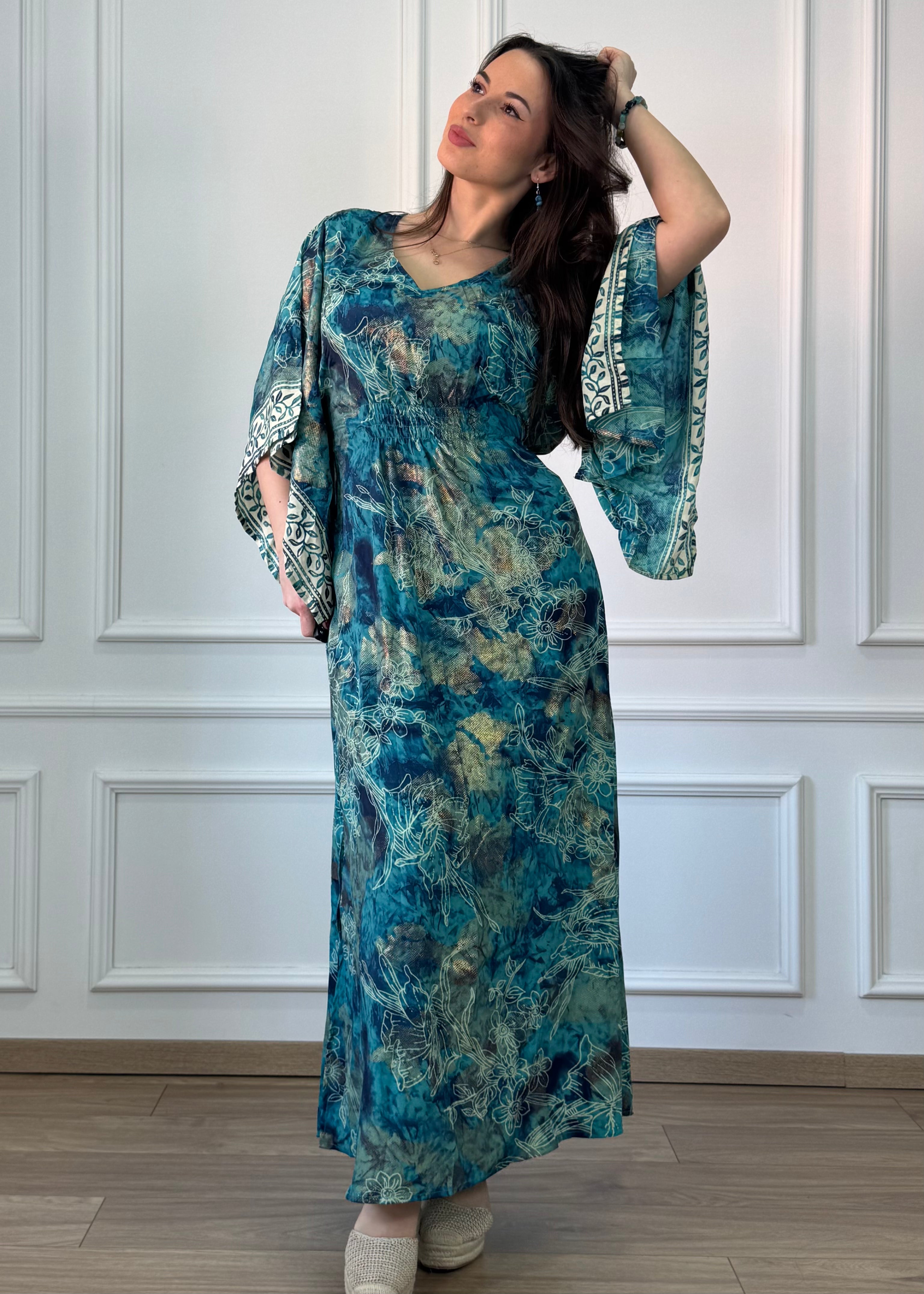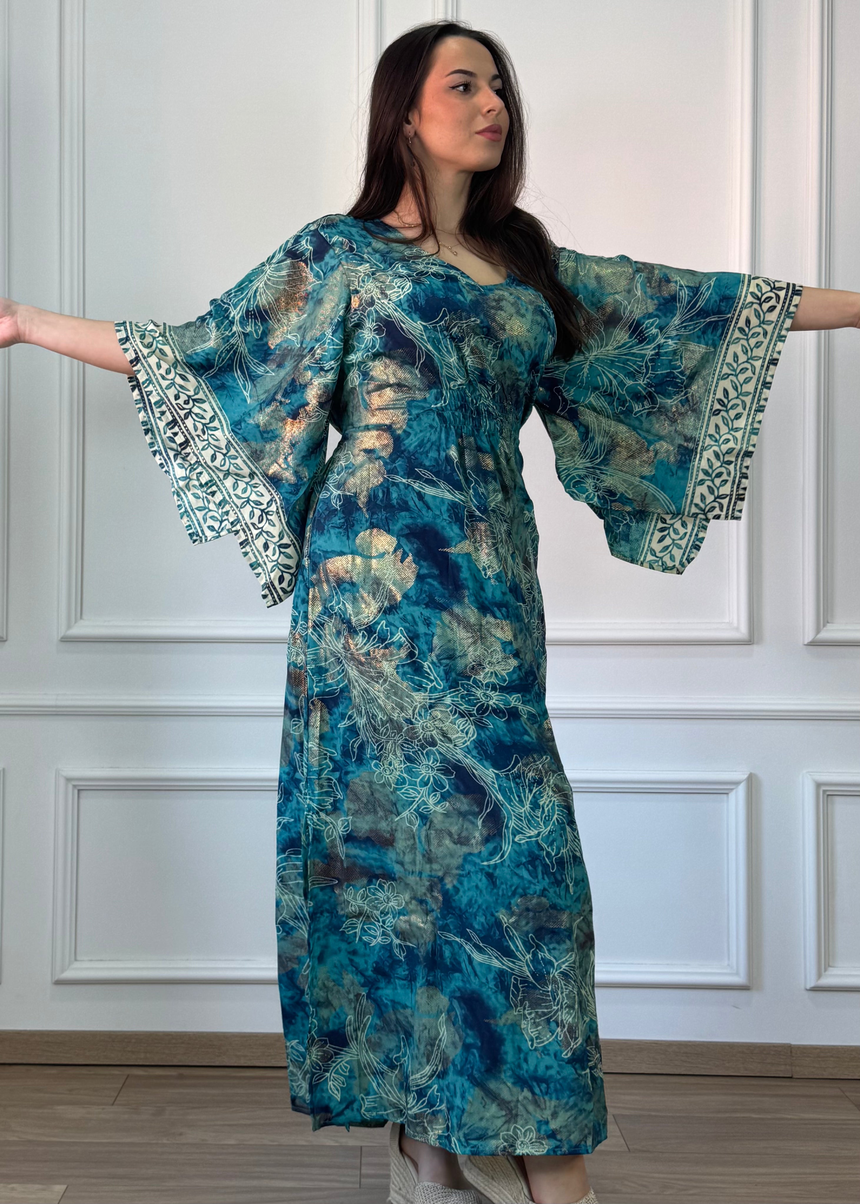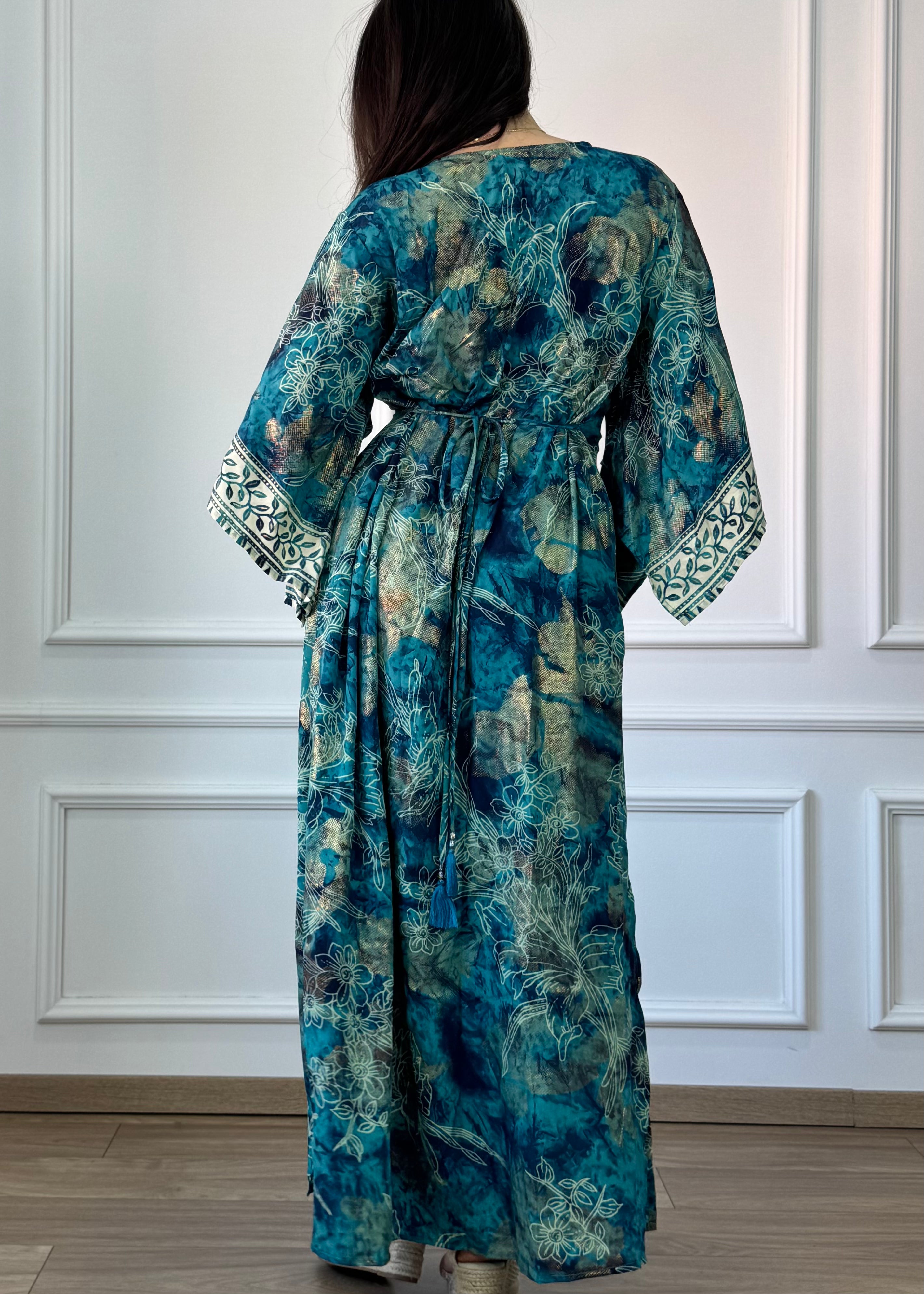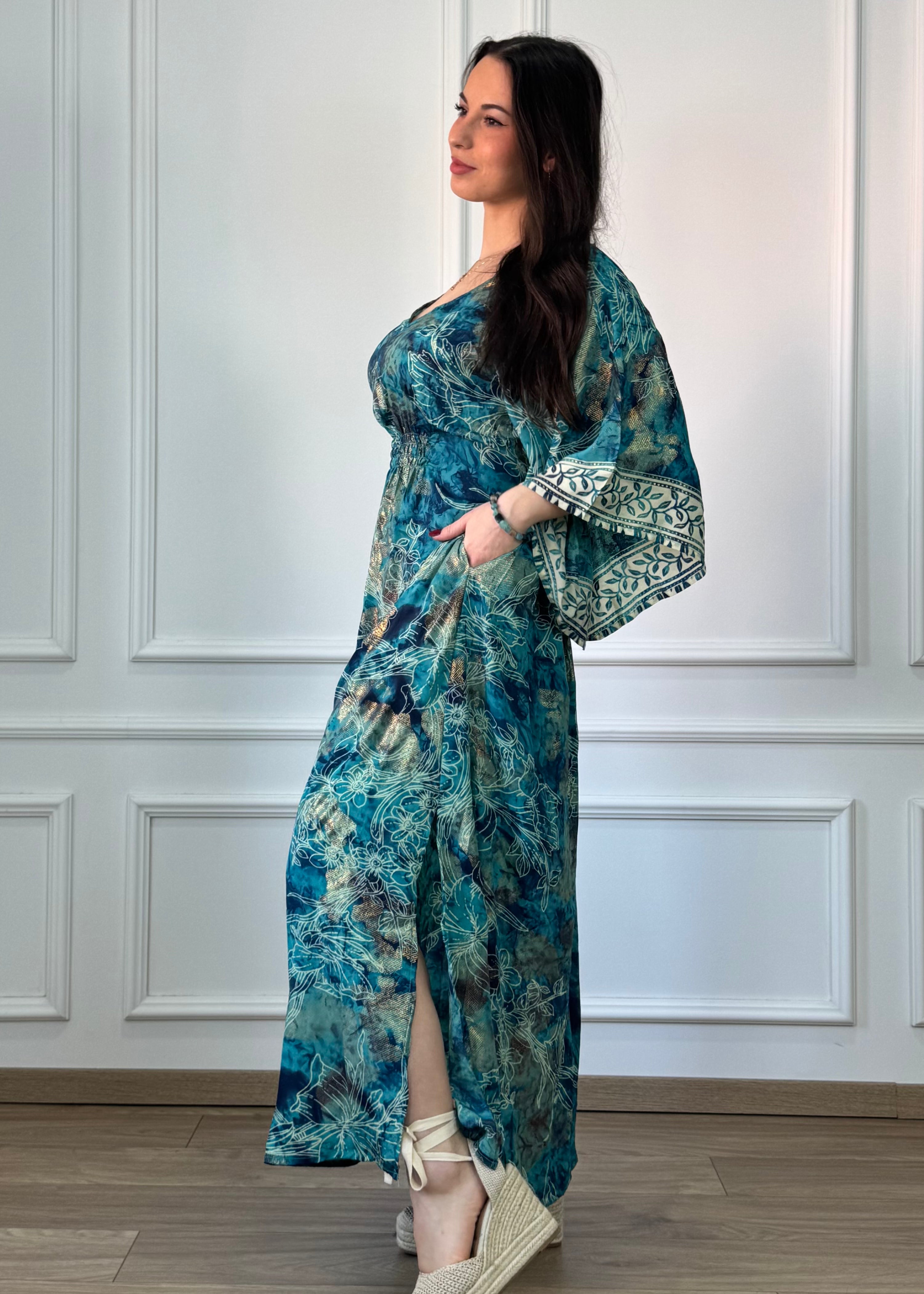 Hosszú, selyemhatású ruha, kimono szabású ujjakkal . Derékbőséghez igazítható az oldalán lévő két zsinórral. A két oldalán fel van sliccelce a szoknyarész.