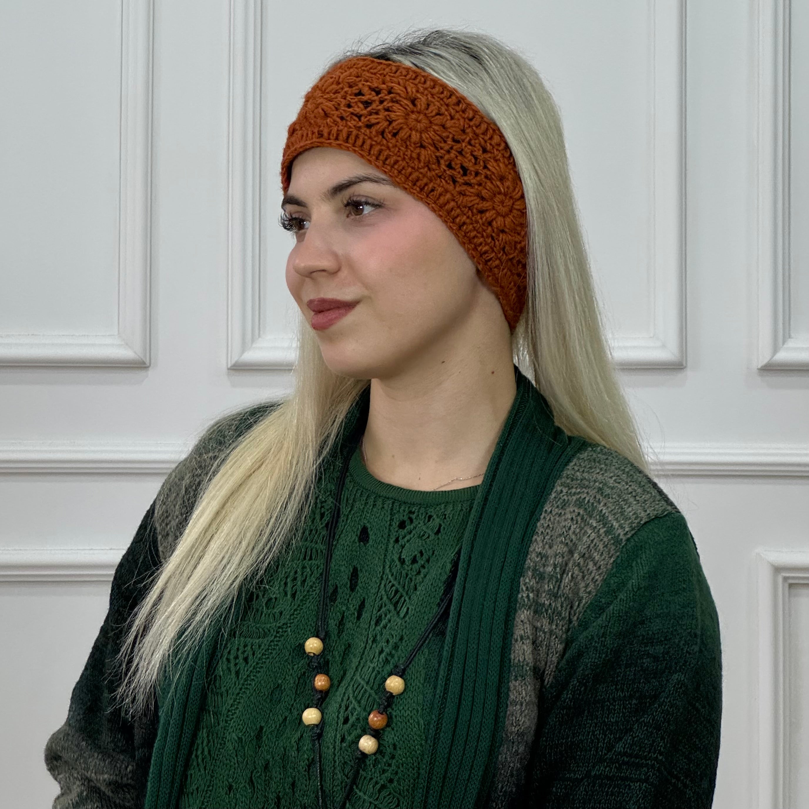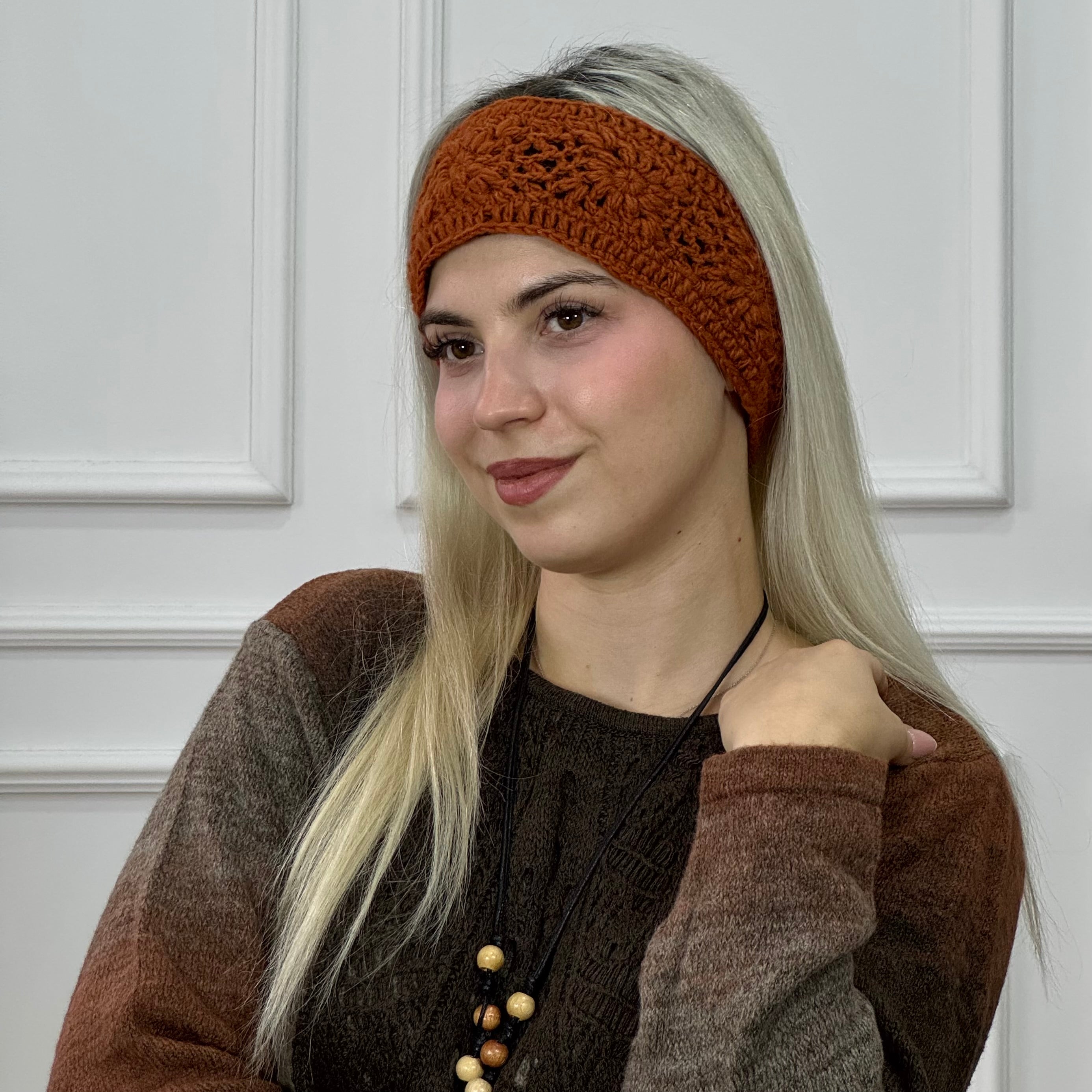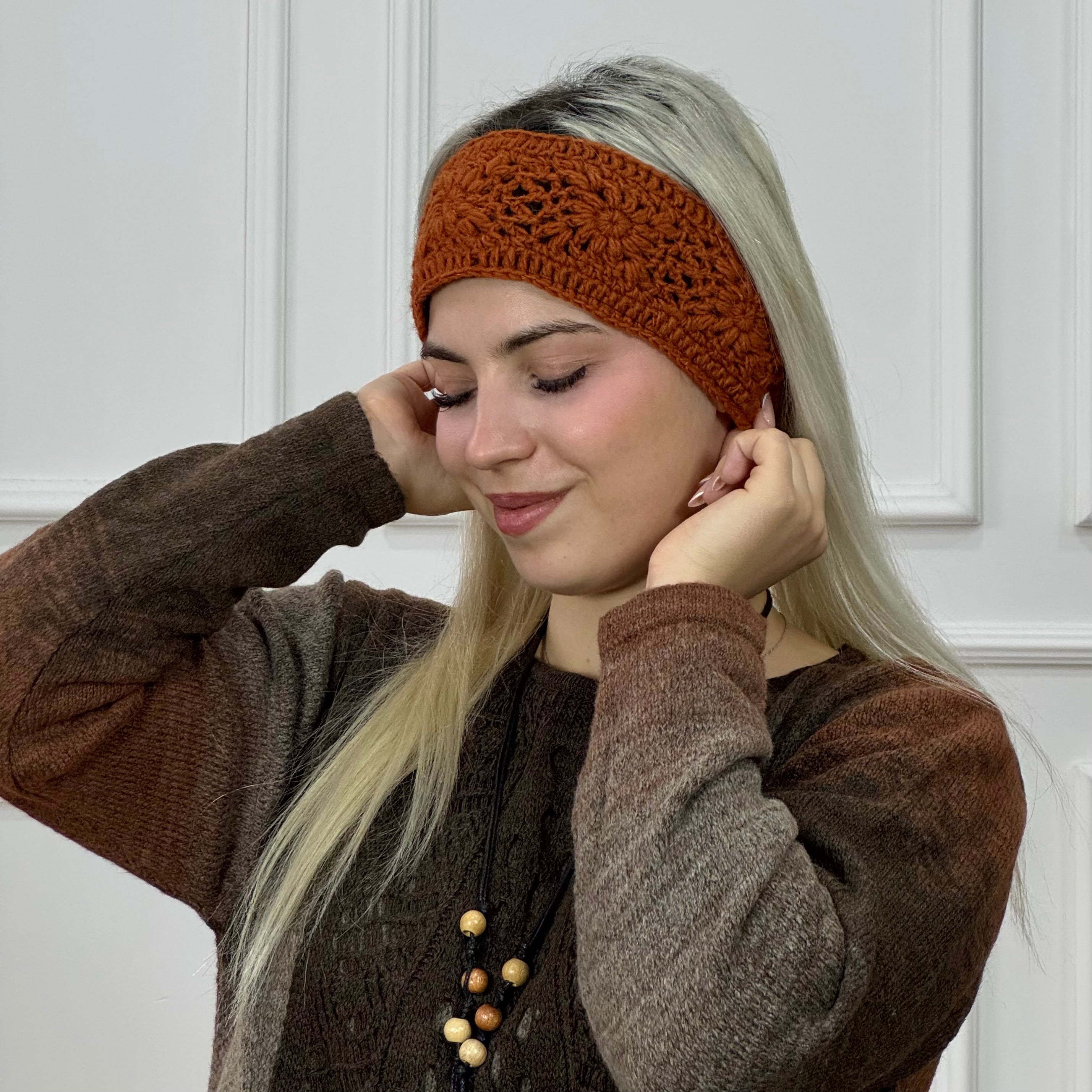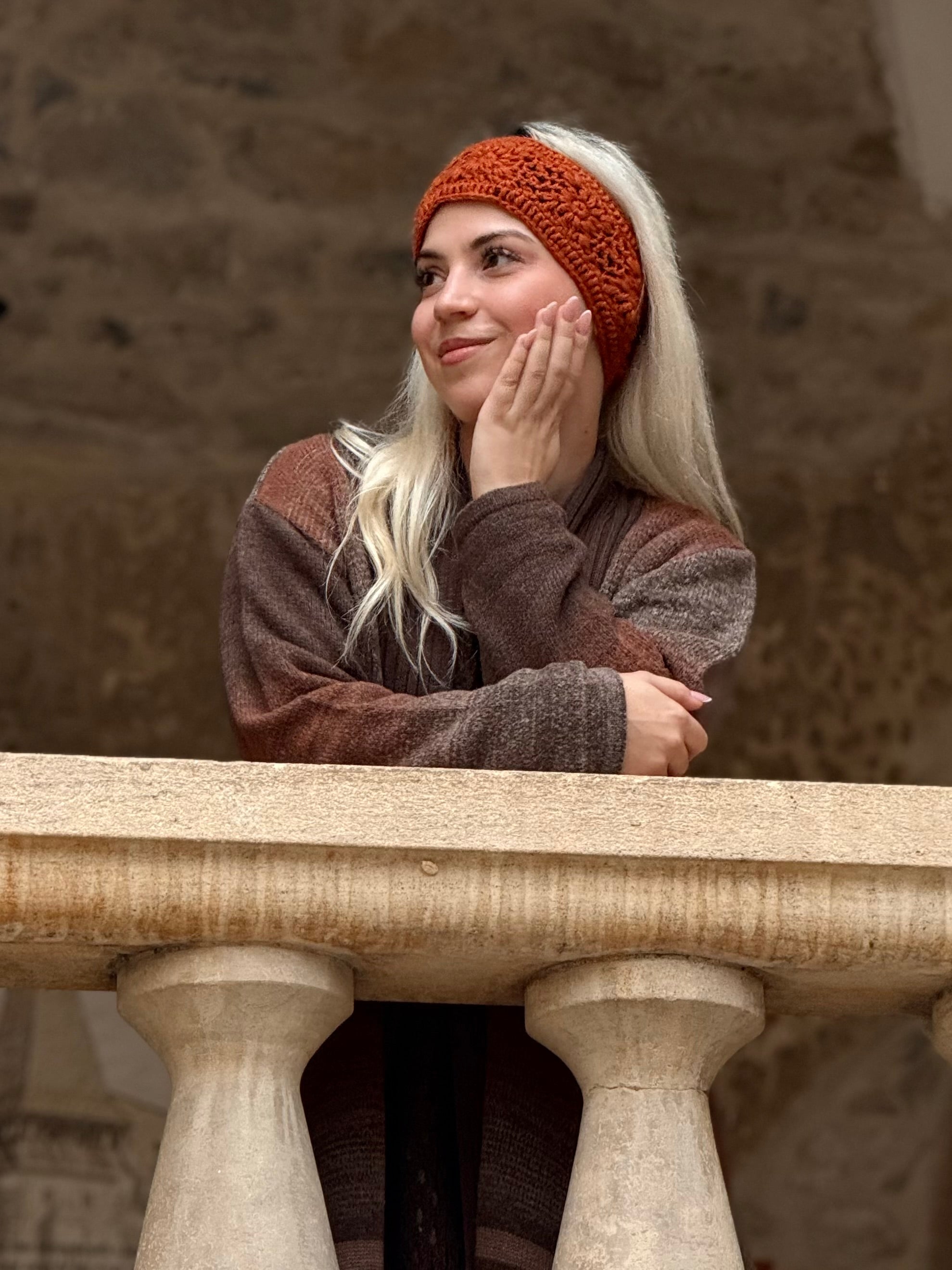 Puha, kézzel horgolt gyapjú fejpánt polár béléssel.