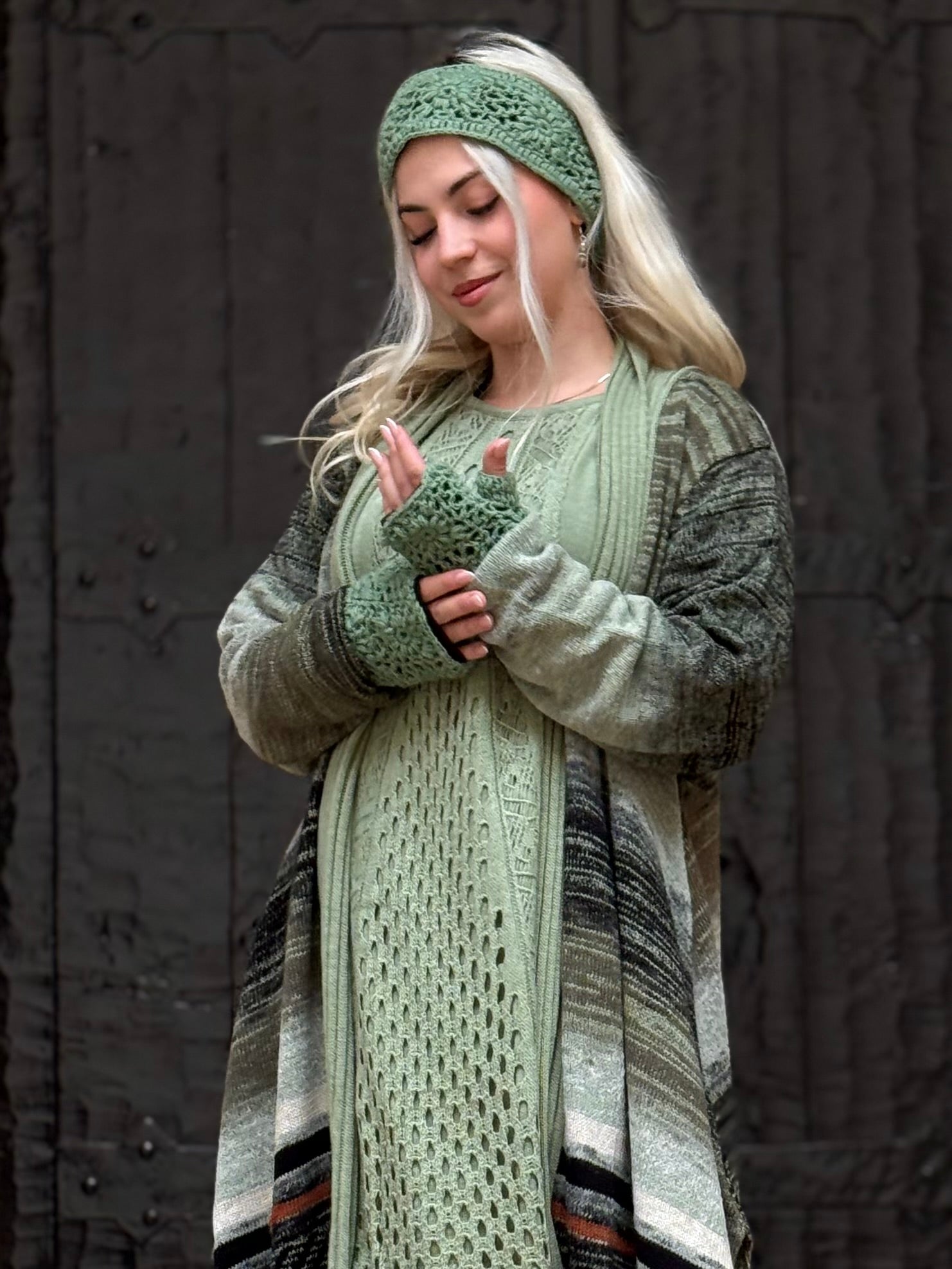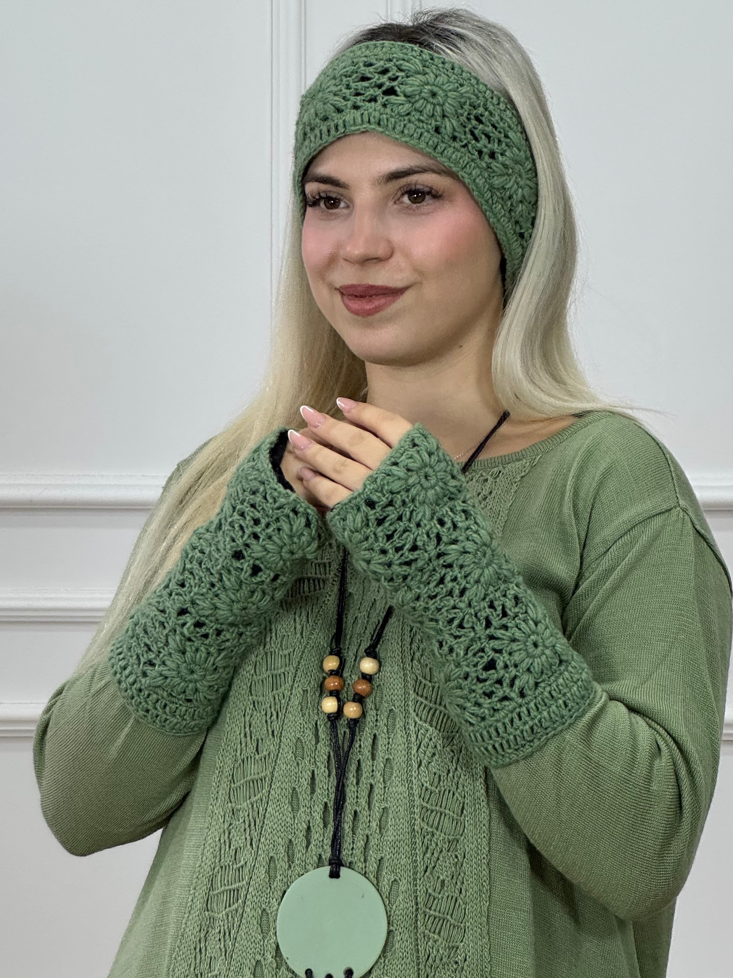 Puha, kézzel horgolt gyapjú kézmelegítő és fejpánt polár béléssel. A nyitott ujjrészeknek köszönhetően praktikus viselet, miközben a kézzel készült minták minden párt különlegessé tesznek.