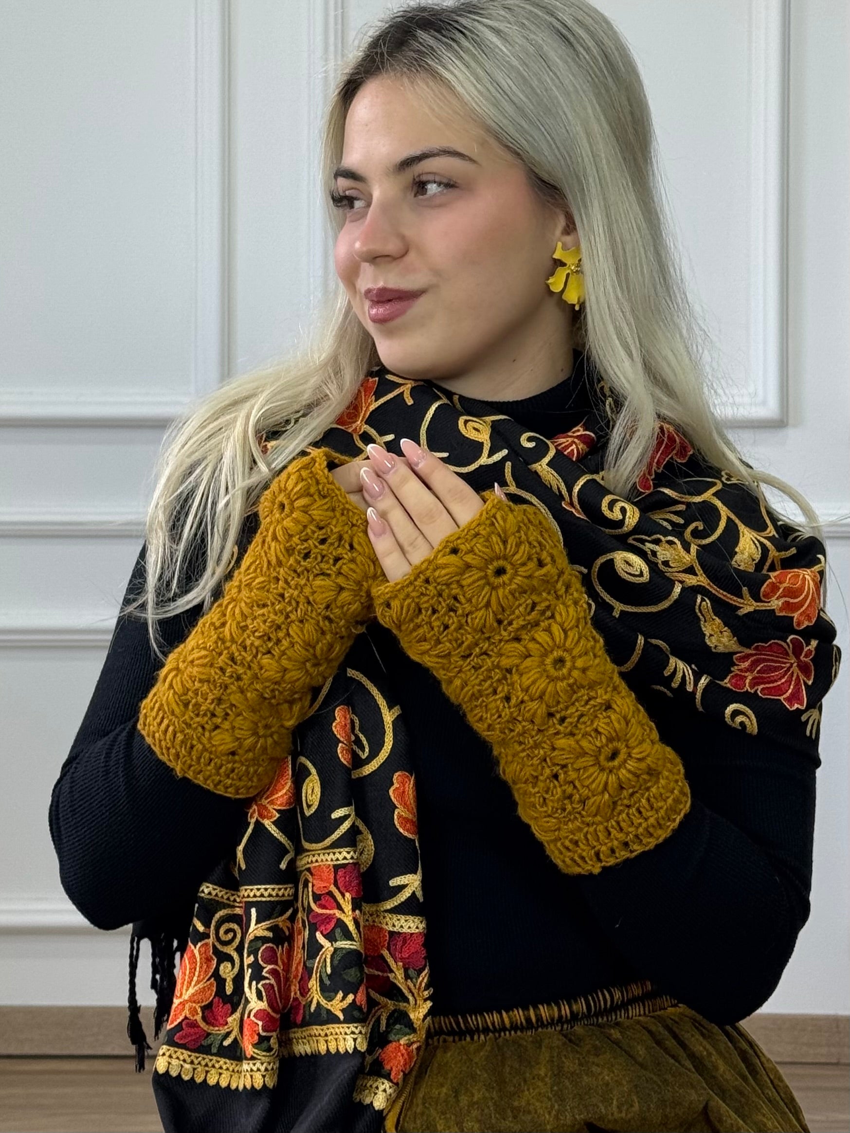 Puha, kézzel horgolt gyapjú kézmelegítő polár béléssel. A nyitott ujjrészeknek köszönhetően praktikus viselet, miközben a kézzel készült minták minden párt különlegessé tesznek.