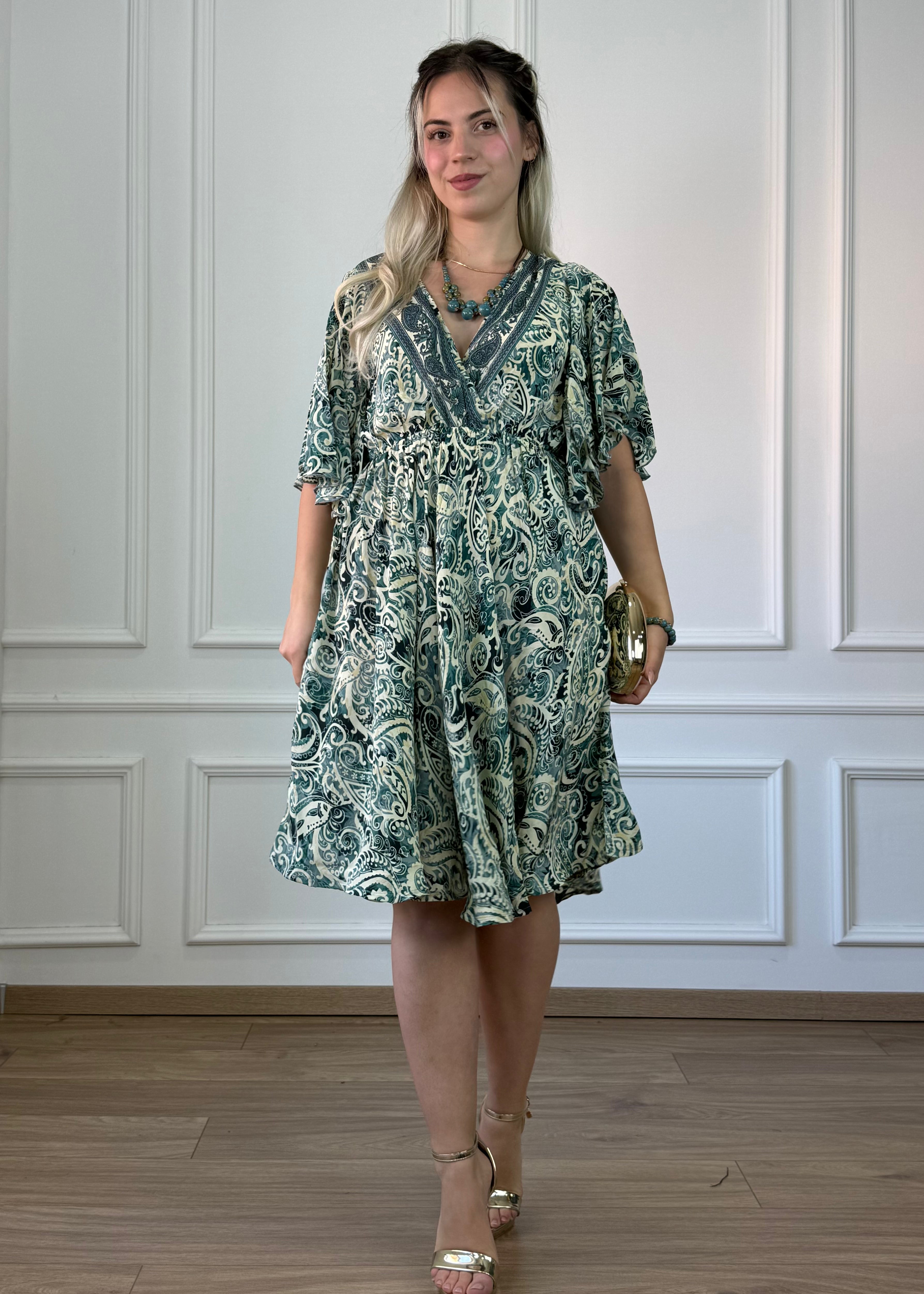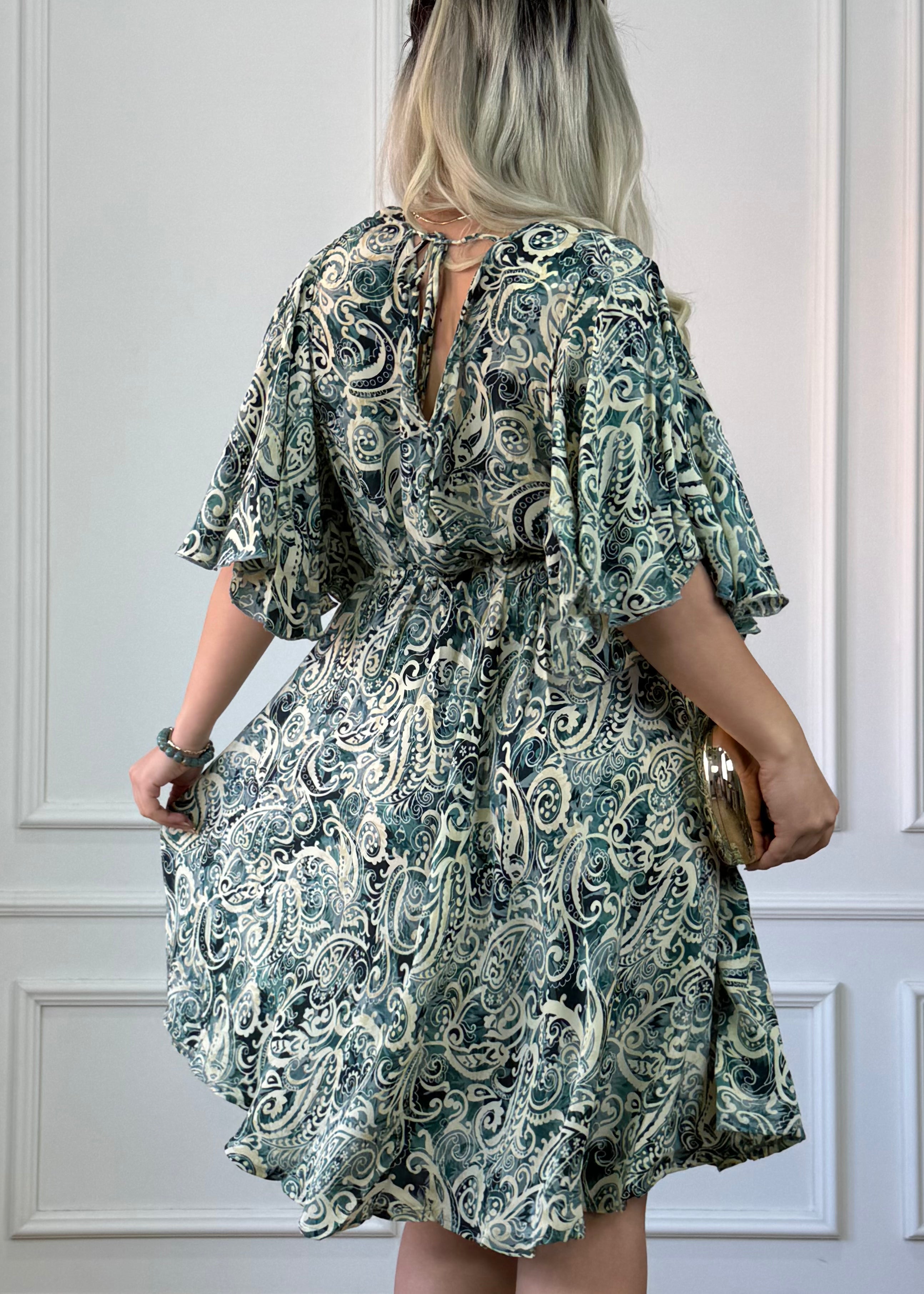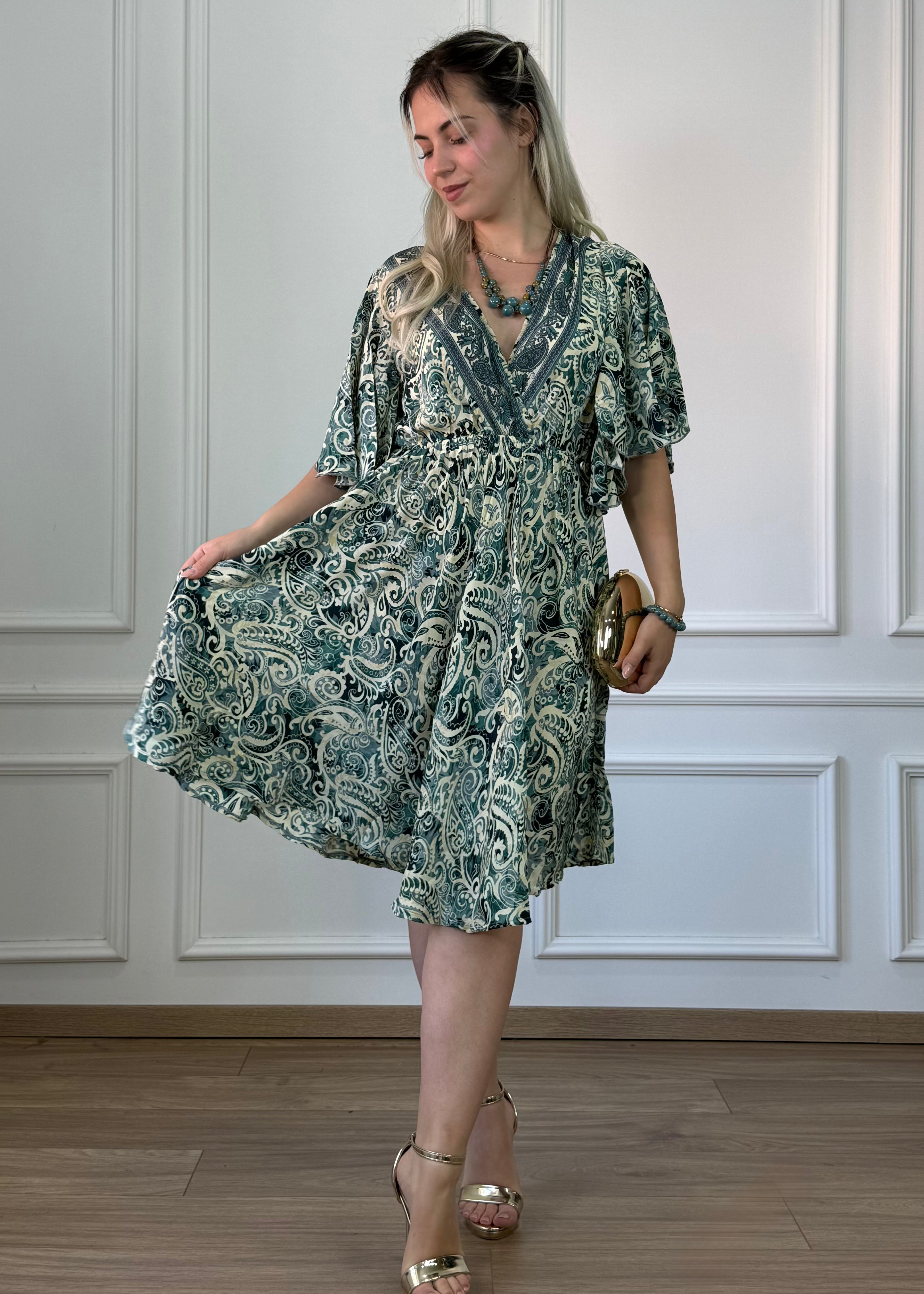 Rövid, selyemhatású ruha, mellkasnál átlapolva, lepke ujjakkal, gumis derekú, deréktól lefelé bővűlő szoknya.