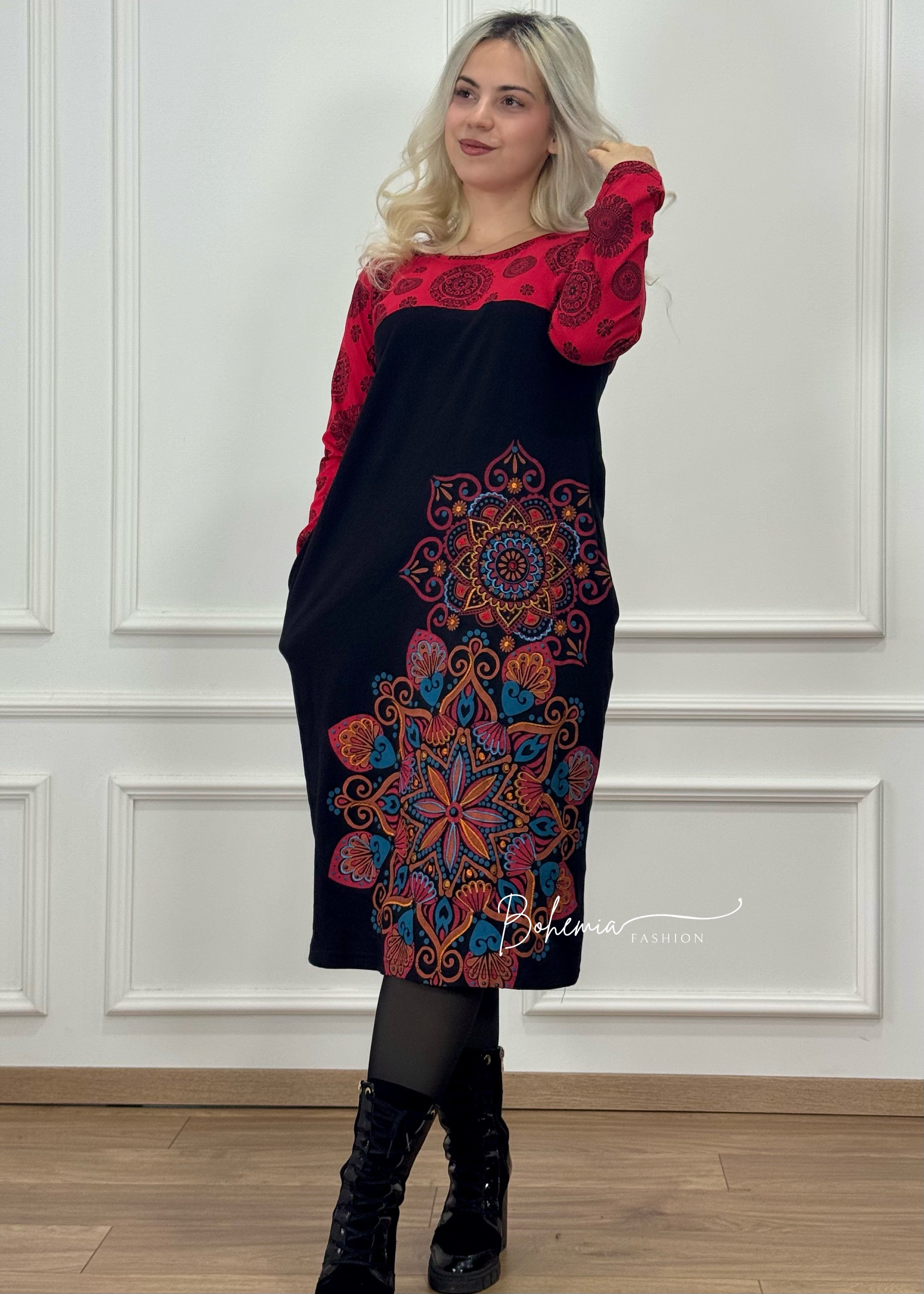 Pamut anyagból készült, hosszú ujjú ruha, amelyet mandala ihlette minták és praktikus zsebek tesznek egyedivé.